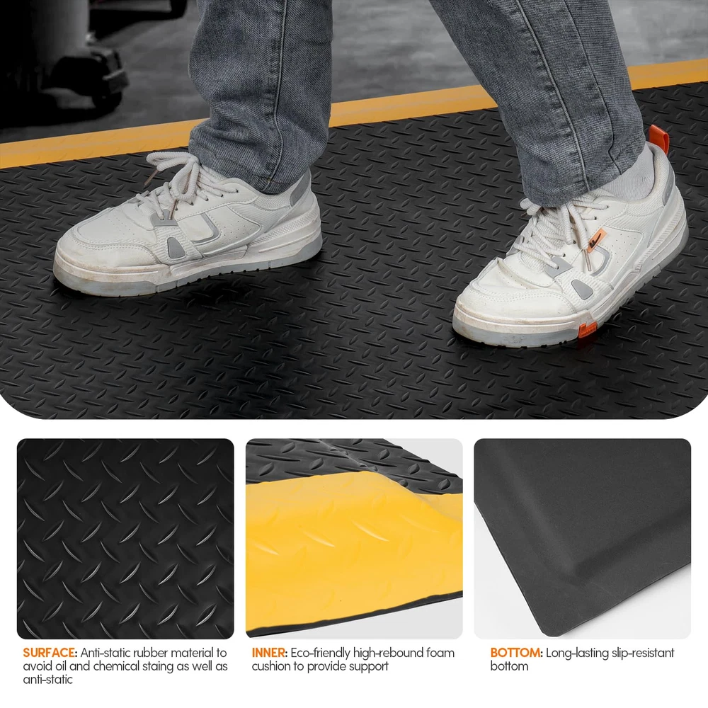ANTI FATIGUE STANDING MAT: Antistatic anti-fatigue ground upper layer made of anti-static rubber material, the middle layer is composed of EPDM foam cotton, the bottom layer is conductive rubber, 15/16 inch thick, dimensions is 3 x 5 FT NON-SLIP SURFACE: The textured surface and smooth beveled edge design help prevent slipping and tripping. The yellow border strip design provides a warning effect. The rubber surface is bonded to the cushion, ensuring it remains firmly attached for increased longevity. VERSATILE COMFORT FLOOR MAT: Extra thick sponge mat comfortable feet, effective in reducing stress and pressure on feet, knees and lower back over long standing periods, greatly reducing the fatigue of standing for a long time. Protect products or tools dropped during work from damage, thus reducing production costs BORDER SAFETY MAT: Heavy duty Industrial floor mat Beveled edges design, more close to the ground seamless, which provides a better grip for the mat and is not easy to move. prevent tripping, fit the ground without warping, not open glue, not collapsing VERSATILE: Whether you are repairing the car in the garage, working in the factory, standing at the desk, cooking in the kitchen, or washing in the laundry, you can use this kitchen mat
