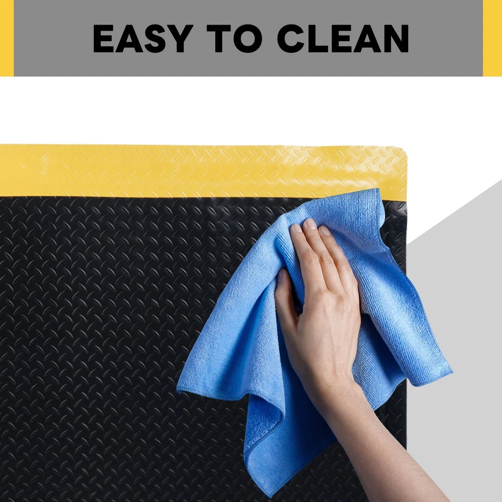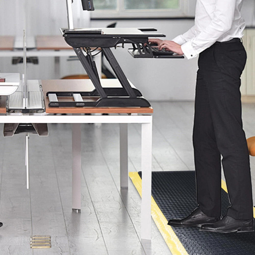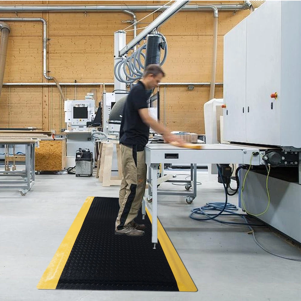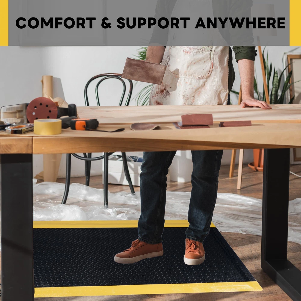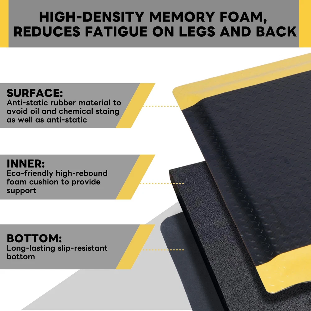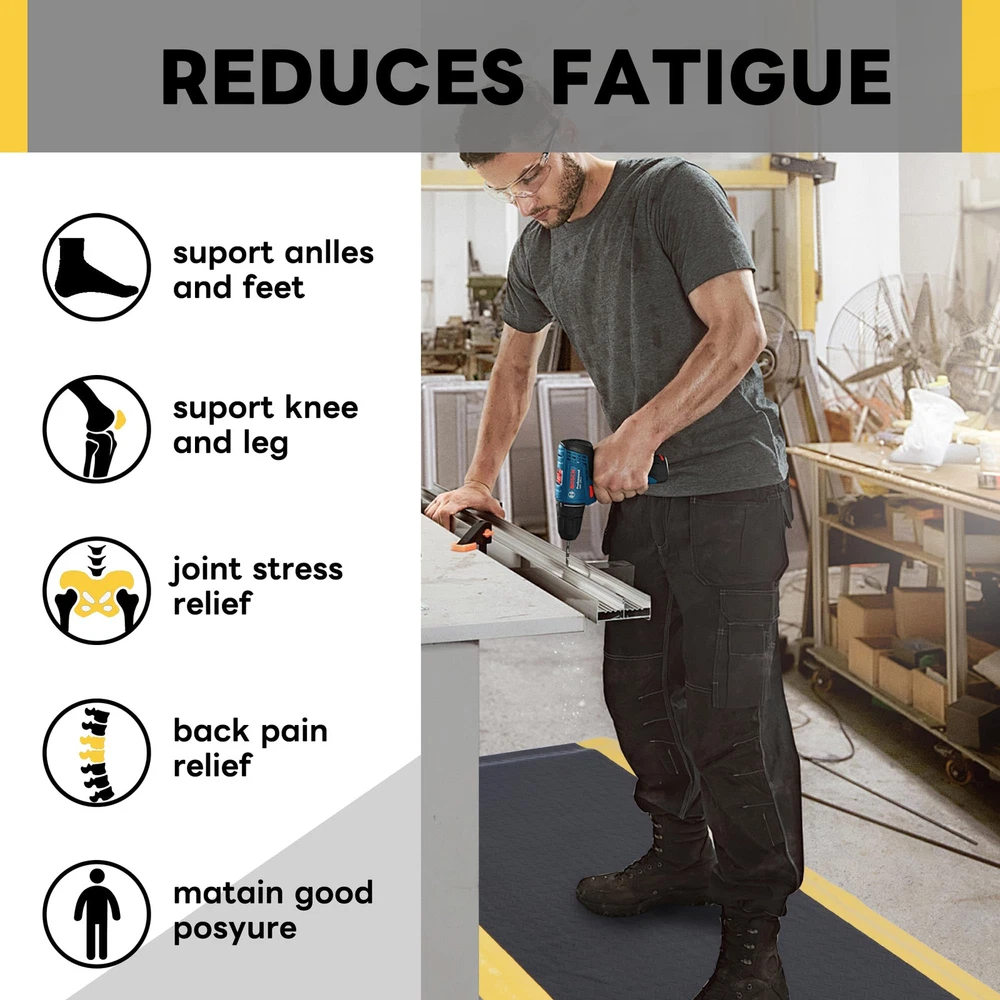 Anti Fatigue Standing Mat: Antistatic anti-fatigue ground upper layer made of anti-static rubber material, the middle layer is composed of EPDM foam cotton, the bottom layer is conductive rubber, 15/16 inch thick, dimensions is 3 x 5 FT. Non-slip surface: The textured surface and smooth beveled edge design help prevent slipping and tripping. The yellow border strip design provides a warning effect. The rubber surface is bonded to the cushion, ensuring it remains firmly attached for increased longevity. Versatile Comfort Floor Mat: Extra thick sponge mat comfortable feet, effective in reducing stress and pressure on feet, knees and lower back over long standing periods, greatly reducing the fatigue of standing for a long time. Protect products or tools dropped during work from damage, thus reducing production costs. Border Safety Mat: Heavy duty Industrial floor mat Beveled edges design, more close to the ground seamless, which provides a better grip for the mat and is not easy to move. prevent tripping, fit the ground without warping, not open glue, not collapsing. Versatile: Whether you are repairing the car in the garage, working in the factory, standing at the desk, cooking in the kitchen, or washing in the laundry, you can use this kitchen mat.