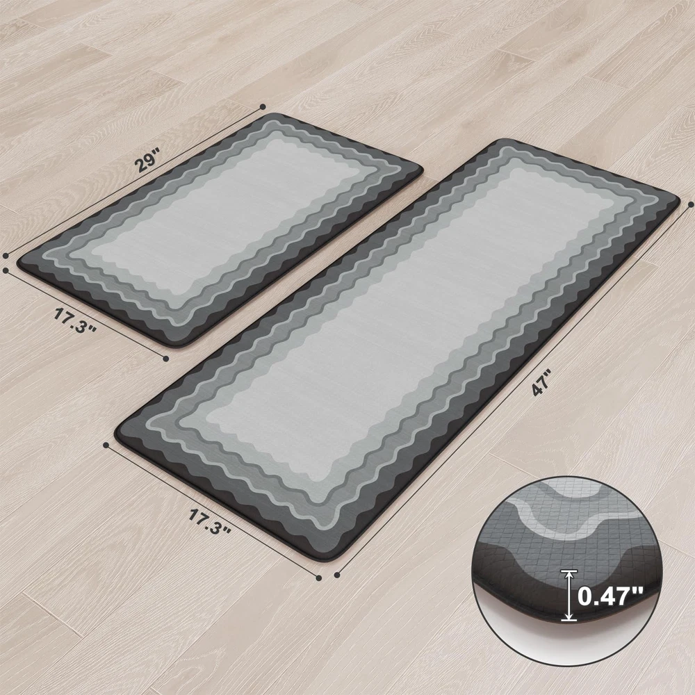 soft anti fatigue mats for kitchen floor waterproof kitchen runner rug non slip padded easy to store comfort long runner rugs for hallways, a popular choice for home decoration Features: 1. Stepping on my feet is as soft as clouds The rectangle vintage bohemian trendy style cushioned kitchen mats for floor provides a luxurious and comfortable touch for any entrance or room. 2. Protecting the floor Kitchen sink mat can effectively lock in dirt and moisture, making your floor cleaner and drier. 3. Sturdy,Anti-Slip and Anti-Stain Padded kitchen floor mats are made of high-quality materials, wear-resistant, ensuring a long service life. 4. Rich colors Mixing different colors together reflects the beauty of art. Perfectly integrated with various interior design styles, enhancing the beauty of the home. 5. Kitchen runner rug with non slip rubber backing The anti slip front door mat indoor entrance will not shift when walking, ensuring the safety of the elderly and children. 6. Anti-Fatigue & Cushion The thickness of 0.47 inches makes it feel relaxed to step on. Stay away from cold and hard floors. 7. Pattern and Richness Tribal collection rug bring a lot of neutrals around your home, you may need a throw rugs with rubber backing for a high traffic area of a room with new carpet. It livens up the living space Suggested size: 17.3" x 29"+17.3" x 47"rug: suitable for indoor areas such as Indoor Door Mats for Entryway,bath mat, entry rug, bedside rug, kitchen mat,entryway runner rug, etc 17.3" x 29""+17.3" x 59" rug: A hallway runner rug, kitchen rugs and runners, rugs for entryway runner, bedroom runner carpet, can also be used in living room, balcony, baby room, bathroom,laundry room,stair etc Anti-Fatigue Kitchen Mat: The size of kitchen rug set are 17.3"x47"+17.3"x29", giving you enough standing space for your feet. A thick cushion kitchen mats for floor with a thickness of 0.47 inches can alleviate pressure on the feet and waist Easy to Clean: The surface of anti fatigue mats for kitchen floor is made of sturdy PVC material. When dust and oil fall on the mat, they will not seep in. Simply wipe it with a damp cloth or use a vacuum cleaner. Ergonomic carpet runners can be placed on vinyl floor, tile floor, wooden floor, cement floor, etc Kitchen Rugs Non Slip: This comfortable kitchen floor mat has a TPE anti slip bottom on the back, which can effectively prevent the mat from sliding freely during use. Very suitable for use by the elderly and children. To better utilize this feature, we recommend ensuring that the floor is dry and tidy before placement Modern Kitchen Mat: With geometric, farmhouse, and boho style pattern design, wavy kitchen sink rug can be adapted to different places. You can use comfort standing mat as a kitchen mat, bathroom mat, office mat, laundry room mat, or door mat according to the color tone of different rooms Waterproof Kitchen Floor Mats: The rubber kitchen mat has memory foam function. It can provide some cushioning when the plate falls off. The high-density material prevents moisture from penetrating into padded runner rug, effectively protecting the floor