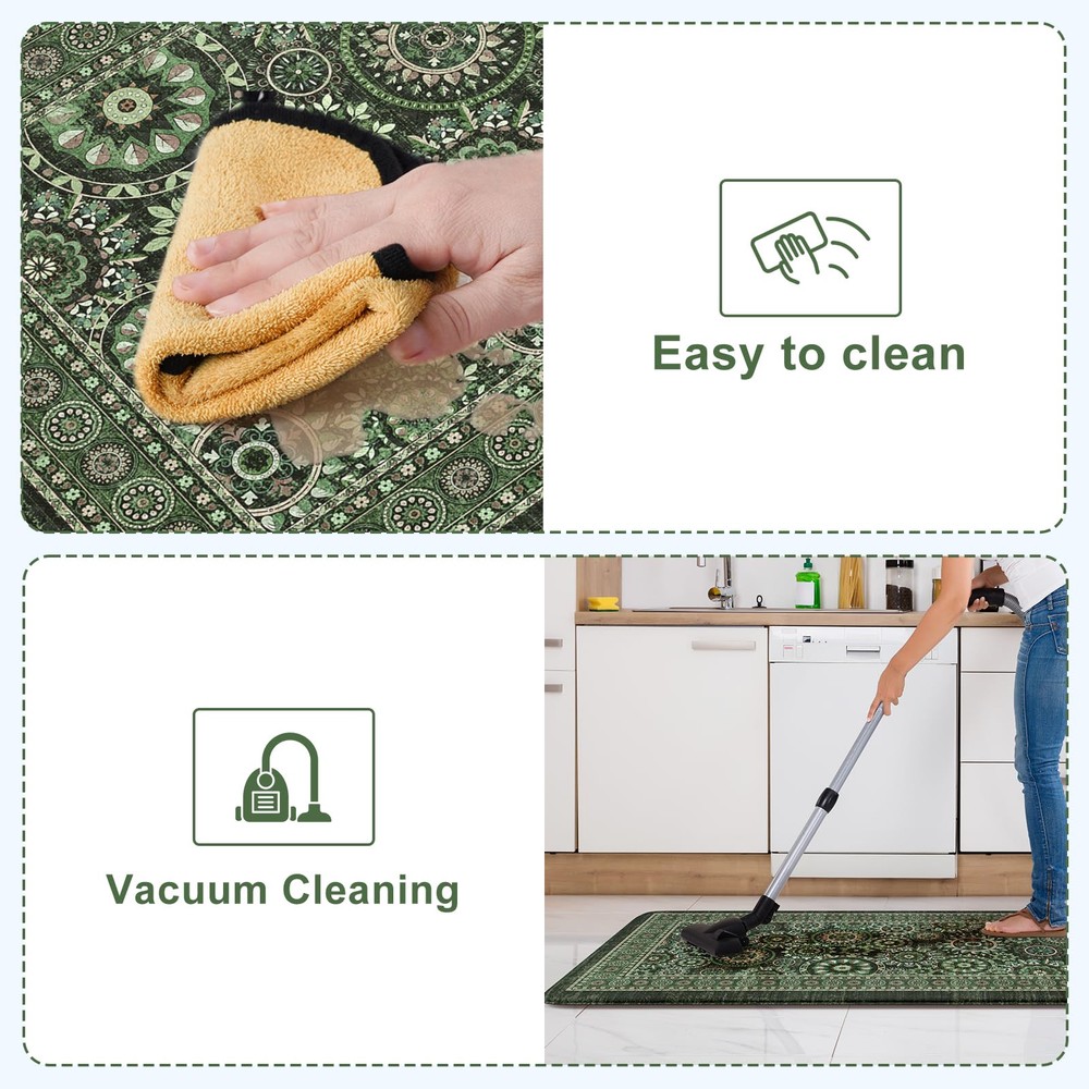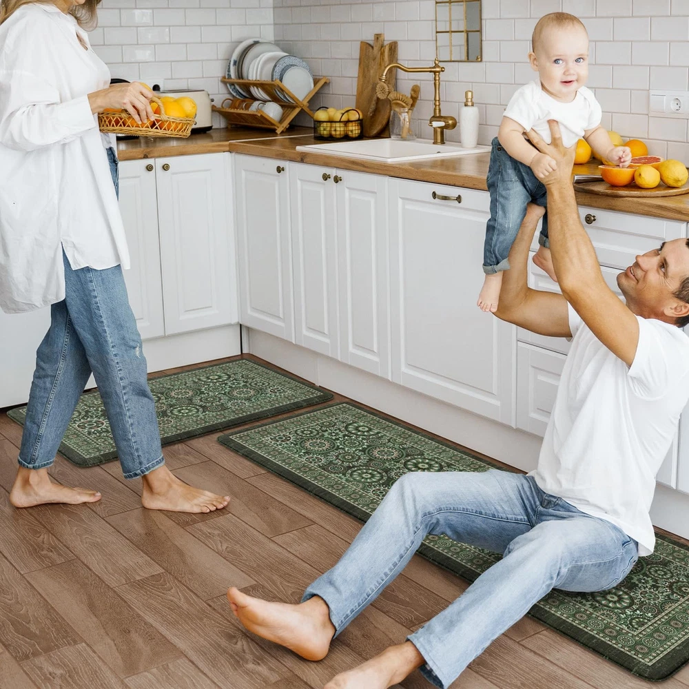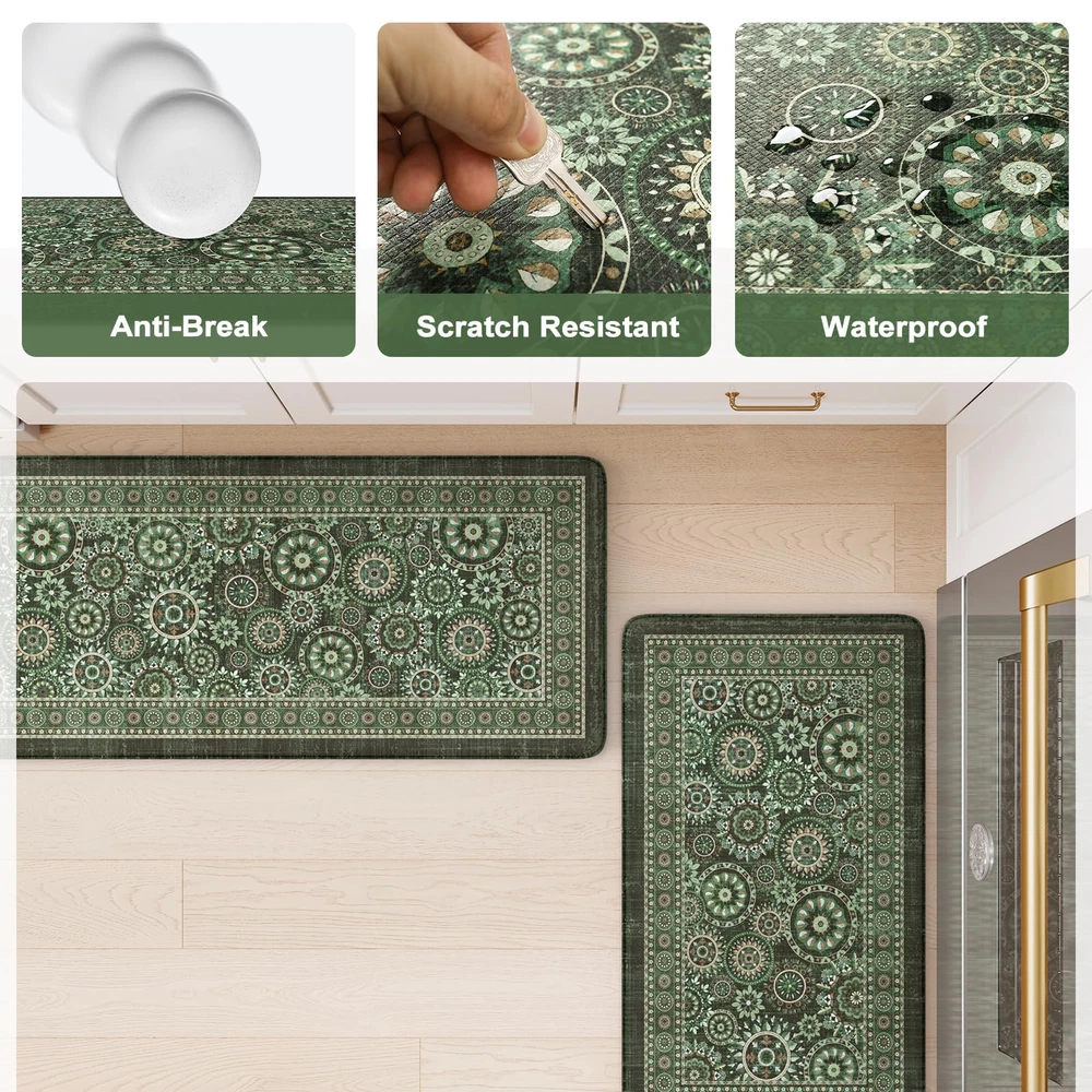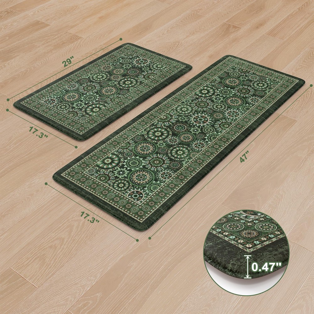 Comfort Anti-fatigue Kitchen Mats:0.47 inch (12 mm) extra thick anti fatigue kitchen floor mat are sure to provide cushion on your feet, knees, lower back, and joints for standing.Feel comfortable when you are cooking in kitchen or working at your standing desk 2PC Kitchen Rugs:The kitchen mats contain 2 rectangular rugs (17 x 47 inches and 17 x 29 inches), 2 Pcs kitchen mats may be used separately or in combination to meet different needs.The mats are made of premium materials, which are friendly to your kids and pets Anti-Slip Standing Mats:Equipped with a non slip rubber bottom so that the mats stay in place both on hard or carpet floors.The beveled edges of the kitchen mats help prevent tripping,fully protect you and your family's safety.Tip:Should be placed on dry surface during use Easy Clean & Waterproof:The cushioned kitchen carpets is stain resistant,waterproof and easily cleaned.Simply wipe the floor mat with a damp cloth or sponge or use a hand-held vacuum as needed,save your time and energy Versatile:Farmhouse style kitchen rug with floral pattern easily to match your kitchen decor, bright your home.Soft thick foam provides ample support for standing in kitchen sink, laundry room, office, bathroom, dinning room, or any other high-traffic area
