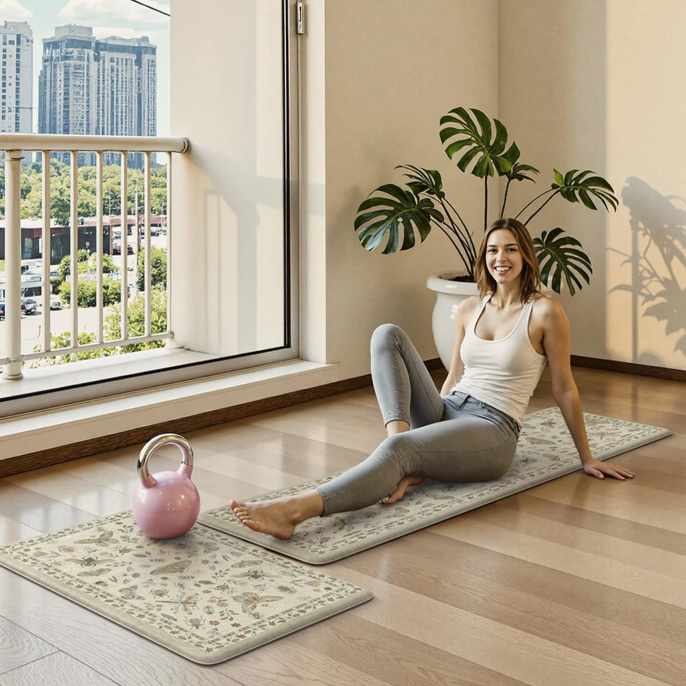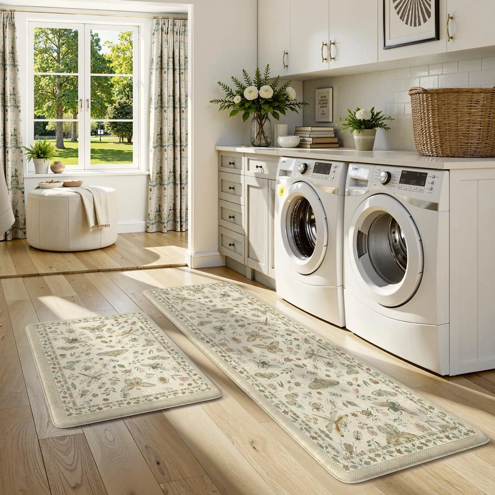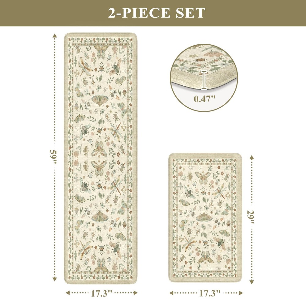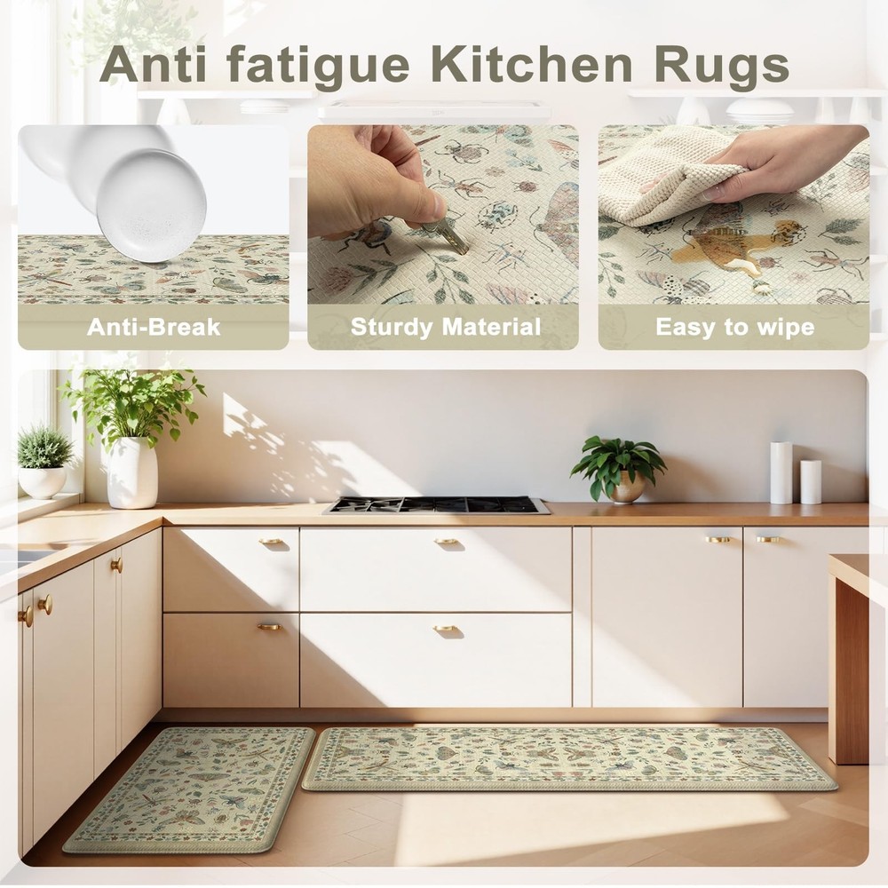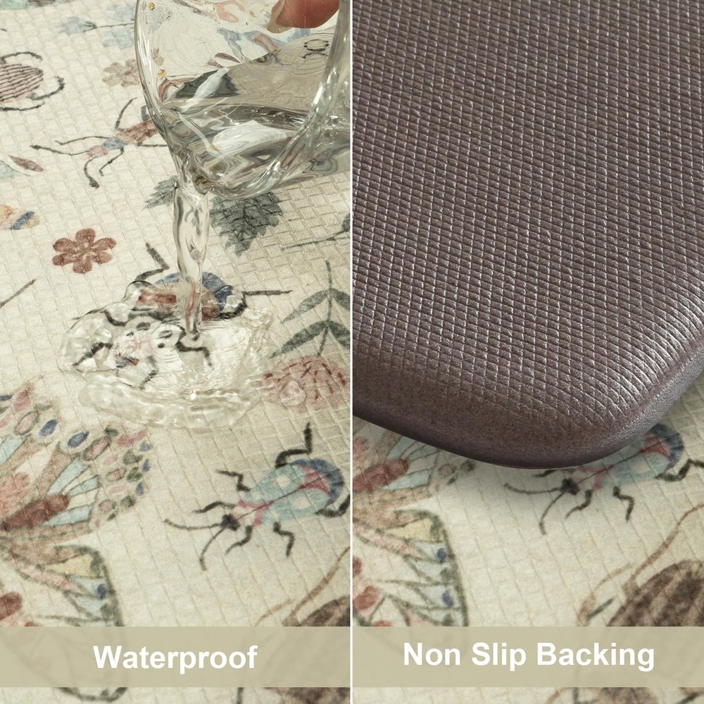 Brand: Colour: Blue/Tan/Pink/Green Material: PVC Size: 17.3''x29''+17.3''x47'' Thickness: 0.47 inches (12 mm), memory foam has good resilience, and can relieve the discomfort caused by standing for a long time. Style: Neutral tones for any decor, simple color scheme, classical floral pattern. Thicknesses: 0.47 inches (12mm) - Foam memory foam with good elasticity helps to relieve the discomfort associated with prolonged standing. Multi-purpose: pet rest, children's play, adult office, fragile objects fall prevention, yoga, home decoration, and other purposes; suitable for kitchen, laundry room, bedroom, hallway, bathroom, bar,sink,desk, office, and other scenes that need non-slip mats. Usage: Open the package and place it on the floor to use. Take care to try and ensure that the bottom of the non-slip mat is dry, otherwise, there may be a risk of slipping! Safety Material: Kitchen mats are made of PVC material with no irritating odor. The non-slip mats are made of high-quality, high-strength materials that retain their shape even after heavy use over a long period. Tip: If you receive a mat with rolled edges, lay it flat for 1-2 days before first use to make them disappear. Non-slip: Kitchen mat with beveled edge design and high-density non-slip backing prevents tripping and slipping, providing safety for your family, suitable for various floor surfaces-tile, wood, ceramic, marble, etc Comfort: The anti-fatigue kitchen floor mat is ergonomically designed and made of high-quality PVC material. The 0.47-inch thickness is both soft and supportive. This comfort kitchen mat can help reduce back pain, relieve standing fatigue, and make you more comfortable when you stand Easy to Clean: The surface is waterproof, oil and dirt-resistant, just wipe it with a damp cloth or sponge, sweep it, or use a vacuum to remove dirt and dust, easy to care Multi-purpose: This foam memory kitchen rug can be used in kitchens, offices, sinks, desks, laundry rooms, and other high-traffic areas. Multi color schemes can be matched with many decorative styles Size & Material: Include 2 rectangular floor mats: one 17.3''x 29'' and one 17.3''x 59''. The kitchen mats are made of PVC, with no irritating odor. Note: Due to long time shipping, the product may be slightly curled, it will recover after a few days