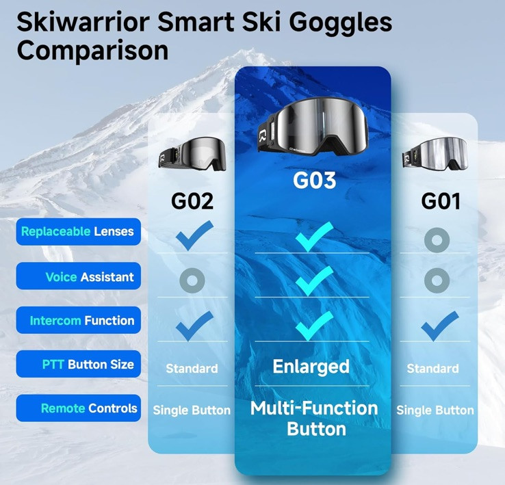 2025 New Upgraded Smart Ski Goggles - G03 Smart Ski Goggles combine the functionality of triple ski gear, goggles, and a walkie-talkie headset. They are equipped with an upgraded G03K 4-in-1 multifunctional smart wireless remote control, which adds voice assistant, song switching, and volume adjustment capabilities in addition to the PPT function Double-Layer Cylindrical Lenses - Smart ski goggles with magnetic interchangeable lenses feature a double-layer lens system. The outer REVO lens provides 100% UV protection, anti-glare, impact and scratch resistance, waterproof and fog-resistant. The inner Italian anti-fog lens, coated with cotton-derived anti-oil and waterproof layers, enhances light filtration for a comfortable viewing experience. Walkie-Talkie Enabled Smart Ski Goggles - Skiwarrior smart snow goggles are equipped with a walkie-talkie function, enabling seamless communication up to 3 kilometers away. This feature is versatile, compatible with both Skiwarrior snowboard goggles and conventional walkie-talkies. Clear and Smooth Sound with ACC Speaker - With built-in microphone and ACC speaker systems, our smart anti fog ski goggles transform your skiing experience. After pairing with Bluetooth, you can listen to your favorite tunes, adjust the volume on the go. And effortlessly answer phone calls with a single tap. Real-Time Data at Your Fingertips - These intelligent ski goggles for ault feature a crisp AMOLED display that keeps you informed with live updates such as weather conditions, current walkie-talkie channels, Bluetooth connectivity status, and battery life. For a more connected experience, the app provides insights into your companions' positions, your skiing speed, and the routes you've carved through the snow. The Ultimate Ski Gear - Our smart ski goggles are compatible with 95% of helmets, offering an over-the-glass design that's friendly for those who wear glasses. The goggle strap is also detachable and interchangeable for added convenience.