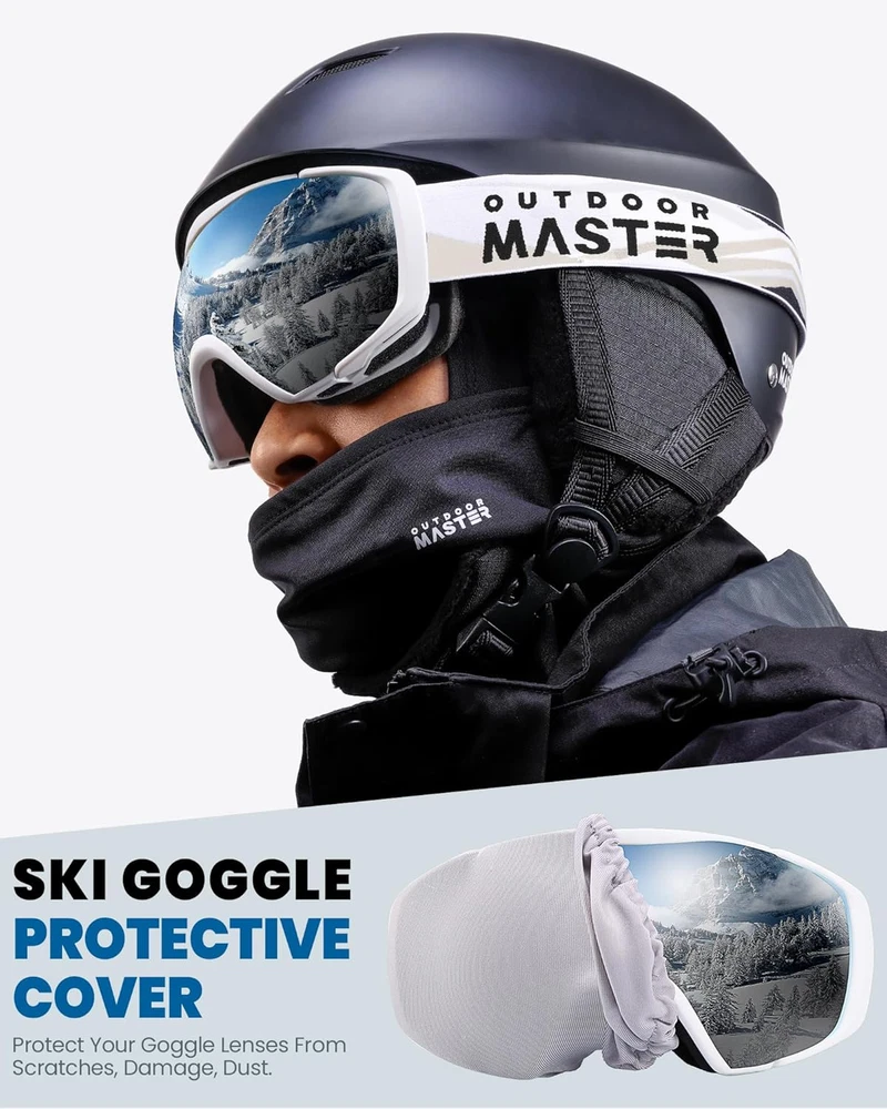 SKI Goggle Protective Cover: Come with the goggle cover ideal to protect your goggle lenses from scratches,damage,dust. The extra long elastic cover for any goggles compatibility. No assembly required, easy on and off, useful to wipe away snow or ice Comfortable & Ventilation: Ski goggle frame use highest grade of triple layer foam and premium TPU frame, made from super durable Thermoplastic Urethane Polymer material with a premium soft touch anti slip coating. Provide smooth air-flow system which brings fresh air and exhaust moisture quickly and effectively UV Protection: Optimized anti-fog & 100% UV protection treatment lens gives you a fog-free ski experience. Dual-layer lens technology creates a thermal barrier that minimizes moisture build up, provides a truly unobstructed & clear view of the slopes Helmet Compatible & OTG: These goggles designed with extra long and adiustable strap for better helmet compatibility, offer a snug and secure fit. Over the glass designed ski & snowboard goggles to fit small to medium size glasses Suitable for Youth: Crafted for teenagers skiers and snowboarders, these goggles combine durability and performance. The ergonomic design fits comfortably on a wide range of face shapes making them ideal for teenagers looking for reliable, high performance eyewear OutdoorMaster Ski Goggles, Snowboard Goggles OTG with Clove Sleeve, Anti-Fog and UV 400 Protection, Snow Goggles for Men & Women Features Clove Sleeve: Yes UV400 Protection: Yes Anti-fog Coating: Yes Anti-scratch Coating: Yes Material Frame Material: TPU Outer Lens Material: PC Inner Lens Material: CP Sponges: Three-larey Polyester Spong Multiple Colors Different colors have different VLT, VLT is suitable for different weather conditions and personal preferences when skiing, snowboarding or other winter sports. Please choose according to what you need. VLT REFERENCE SCOPE VLT(Visible Light Transmission)Reference Scope: VLT 0-10% - For sunny days VLT 10-25% - For partially clouded to sunny days VLT 25-60% - For cloudy days and dusk VLT 60-90% - For night and heavily clouded days Package Includes: 1 x OutdoorMaster Goggles 1 x Goggle Protective Cover