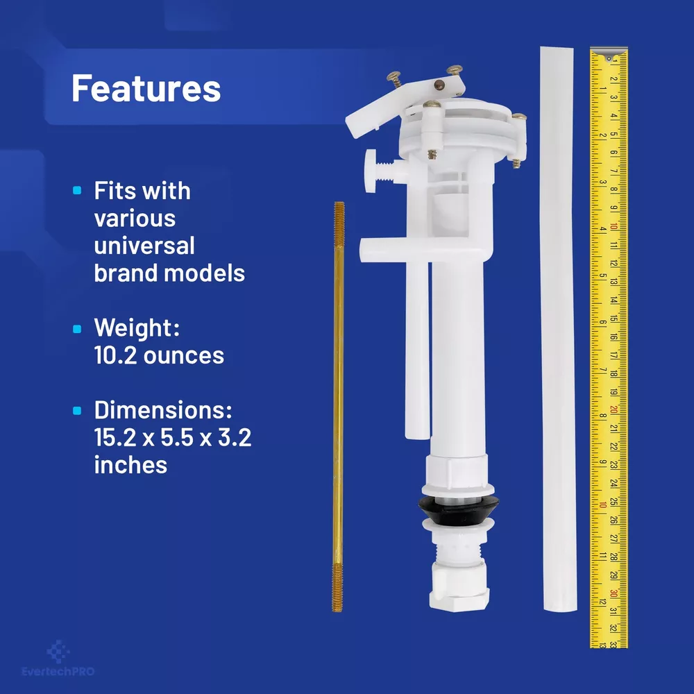 Introducing the EvertechPRO Toilet Fill Valve Kit, a must-have for any bathroom. This kit is the ultimate solution for toilet repair parts inside the tank. It's a comprehensive toilet repair kit inside the tank that includes everything you need for a quick and easy toilet plumbing valve repair. The kit contains a coast type, anti-siphon ballcock that ensures optimal performance and safety, preventing backflow of contaminated water into your potable water supply. The EvertechPRO toilet fill valve replacement kit also comes with durable construction and an aluminum float rod that guarantees longevity and reliability. Whether you need to replace the fill valve for your toilet tank or need a complete toilet parts inside tank kit, this set has got you covered. What makes this toilet replacement kit inside the tank stand out is its universal fit. It can be used as a toilet pump replacement kit or a replacement fill valve toilet. It's the perfect choice for any toilet, whether you need a replacement toilet fill valve, toilet repair parts inside tank, toilet reservoir parts or a ballcock valve for your toilet. The kit includes a toilet tank fill valve, filling replacement parts, and a toilet filler valve. It's designed for easy installation, so you don't have to be a plumbing expert to use it. The EvertechPRO toilet fill valve kit is not only a functional solution but also an economical one, eliminating the need for costly plumbing services. The kit also includes a quick fill valve for faster water refill in your toilet tank. With this kit, you can easily rebuild and repair your toilet's inner workings, ensuring that it functions efficiently for years to come. The EvertechPRO toilet fill valve replacement kit is designed for both professionals and DIY enthusiasts. It's an excellent addition to your toilet water tank parts collection, ensuring that you have everything you need for any toilet plumbing task. EvertechPRO is known for its quality and reliability, and this toilet ballcock is no exception. Made with durable materials, it's built to last, ensuring that your toilet performs optimally. Invest in the best with the EvertechPRO Toilet Fill Valve Kit. It's the ultimate in toilet repair, ensuring that your toilet is always in perfect working condition.