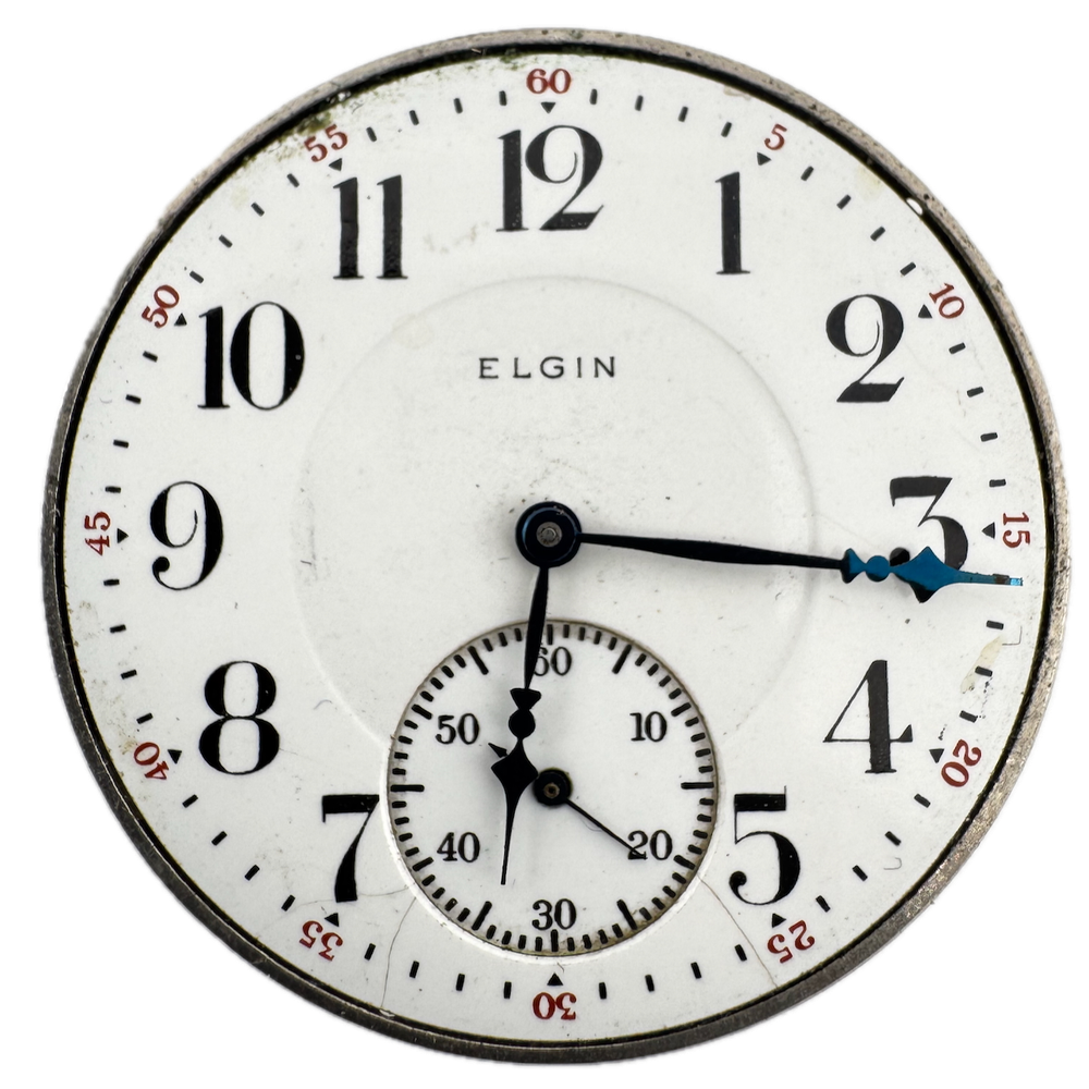 Antique 12 Size 1917 Elgin 17 Jewel Mechanical Pocket Watch Movement 345 USA Product Description Item: Pocket Watch Movement Brand: Elgin Movement: Mechanical Production Year: 1917 Country: USA Jewels: 17 Jewel Gender: Men's Grade: 345 Size: 12 Size Product Measurements Diameter: 39.5mm Product Condition Overall Condition: Fair, overall condition for its age. Functions: Running, but may be in need of service. This means, it can run unreliably, start or stop and timekeeping is not guaranteed. Dial: The dial has hairline crack(s) on it.