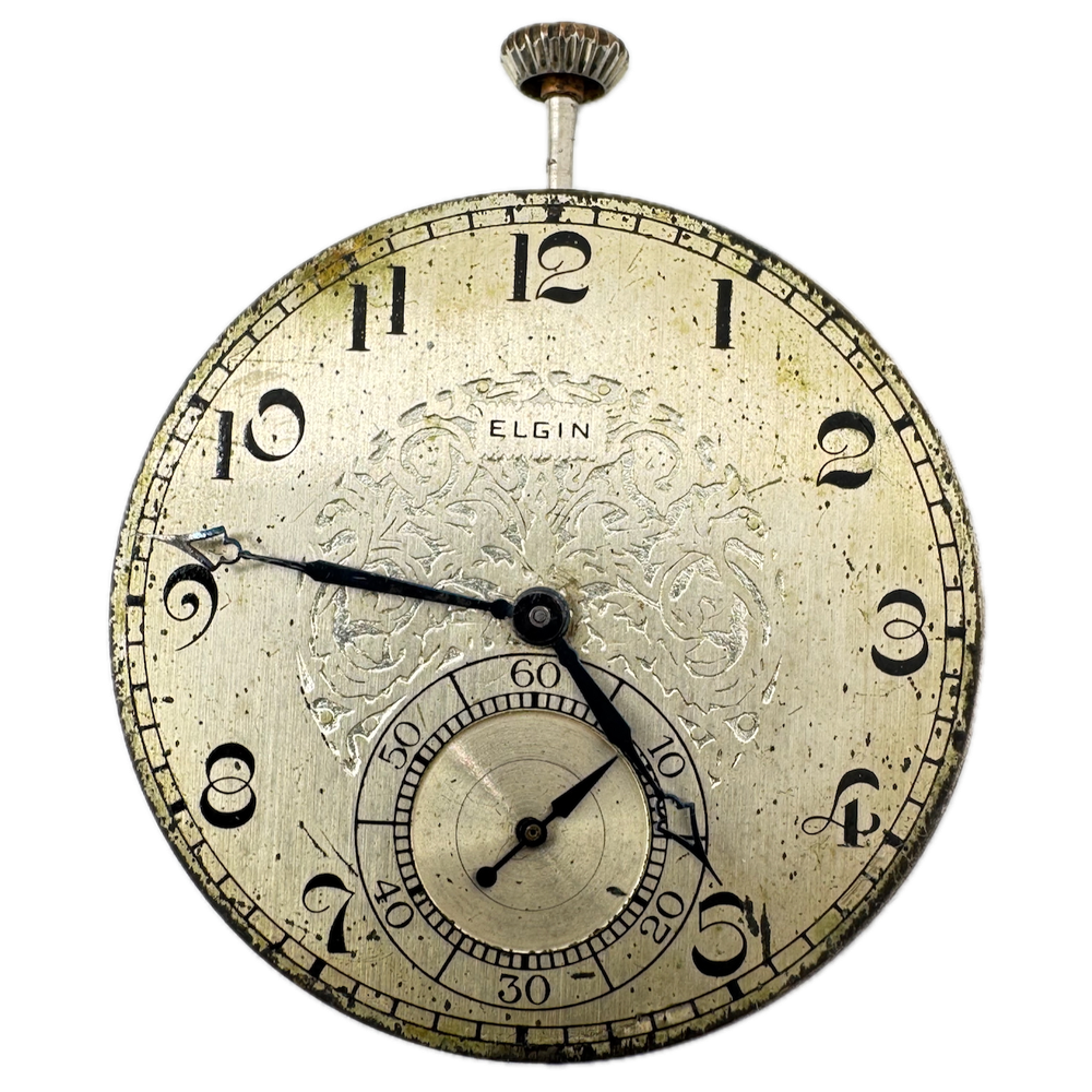 Antique 12s 1925 Elgin 17 Jewel Mechanical Pocket Watch Movement 479 USA Product Description Item: Pocket Watch Movement Brand: Elgin Movement: Mechanical Production Year: 1925 Country: USA Jewels: 17 Jewel Gender: Men's Grade: 479 Size: 12s Product Measurements Diameter: 39.5mm Product Condition Overall Condition: Poor, overall condition for its age. Functions: Not running but the balance complete is in good condition. Dial: The dial has scratches and discoloration. Hands: There is discoloration on the hands.