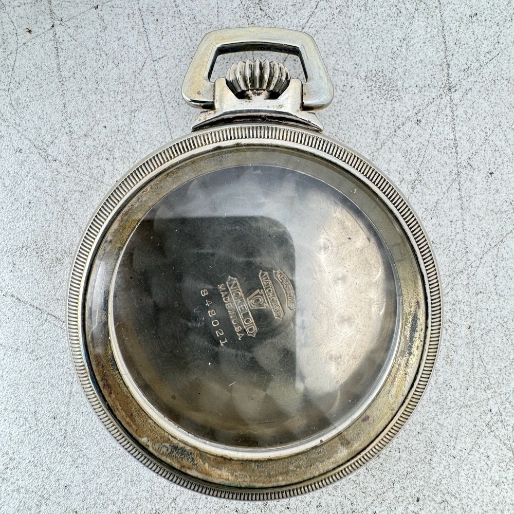 Antique 16s Keystone Coin Edge Open Face Pocket Watch Case Nickeloid USA Product Description Item: Pocket Watch Case Brand: Keystone Model: Coin Edge Case Material: Nickeloid Country: USA Gender: Unisex Product Measurements Inside Diameter: 41mm Outside Diameter: 54.5mm Product Condition Overall Condition: Fair, overall condition for its age. Case: There are scratches on the case. Crystal: There are scratches on the crystal.