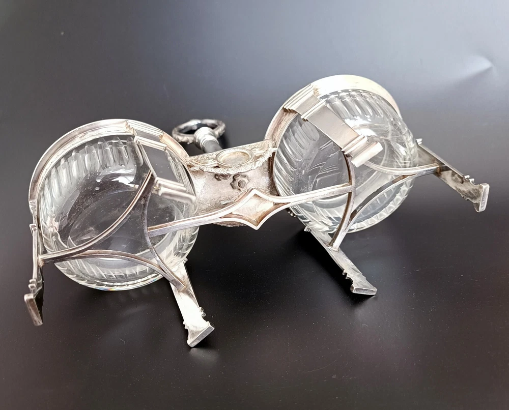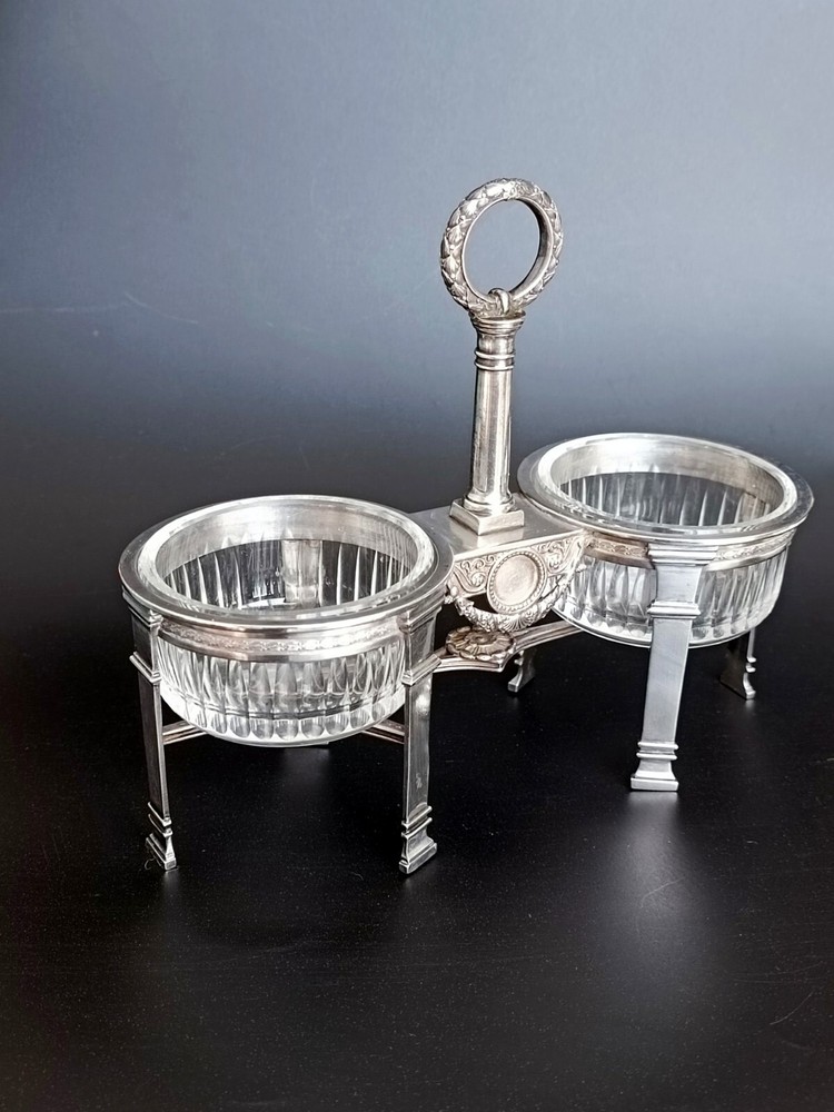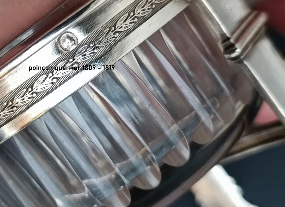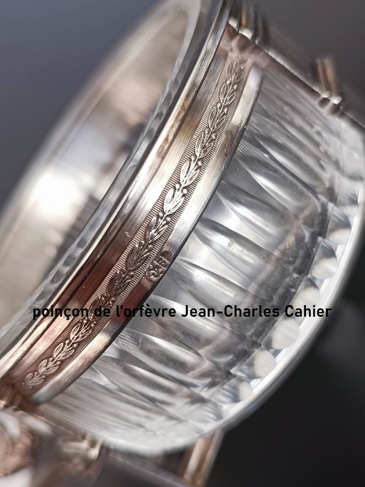 Ancien saleron saliere en argent Empire 1809-1819 N2 Magnifique travail d'argent, finement ciselé, typique de la décoration Empire. Pots en cristal d'origine en bon état, sans dommages. La structure en argent est estampillée du poinçon Coq de 1er titre de Paris (en usage de 1809 à 1819, équivalent au poinçon Minerve de 1er titre actuel), des poinçons de garantie utilisés à cette époque, et du poinçon de l'orfèvre Jean-Charles Cahier. JC Cahier était l'orfèvre officiel des rois français Louis XVIII et Charles X. Hauteur : 15 cm Poids 218 g