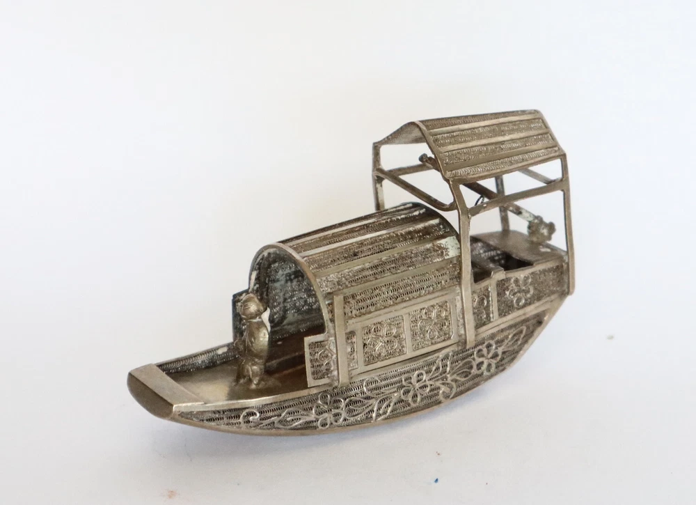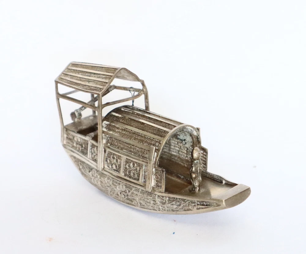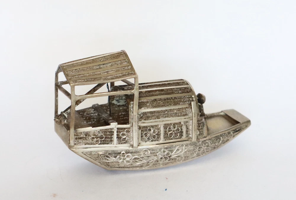 1900 Dutch silver miniature of Chinese filigree boat. Mark silver on the boat. Size: 6.3 cm x 2 cm, H 3.8 cm, Weight 21.7 gr A4745