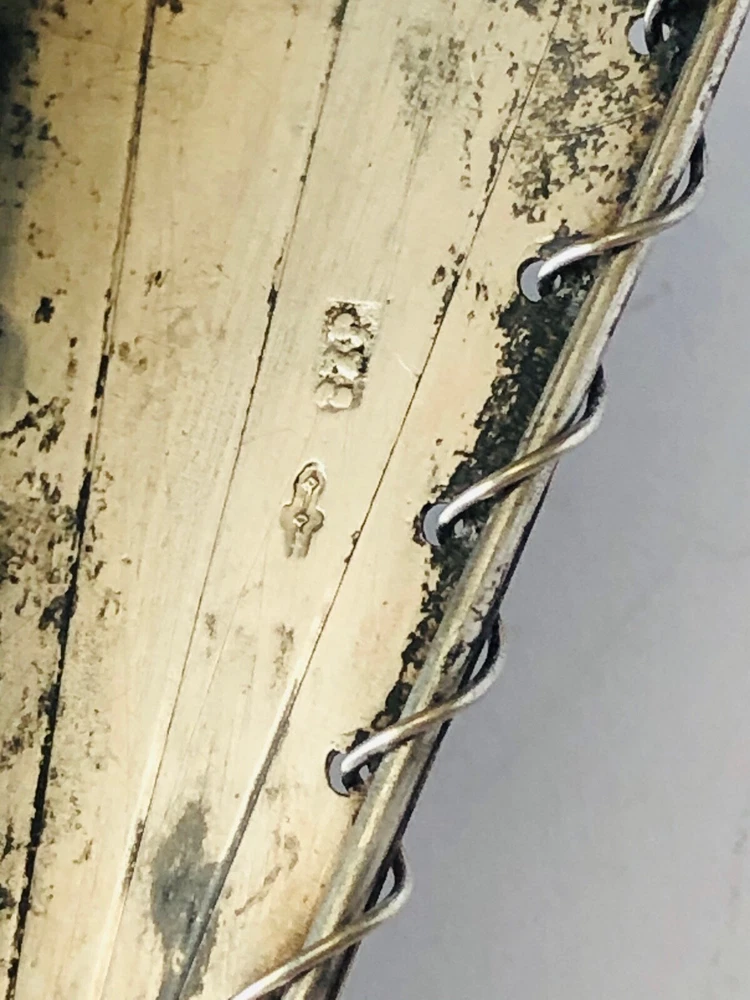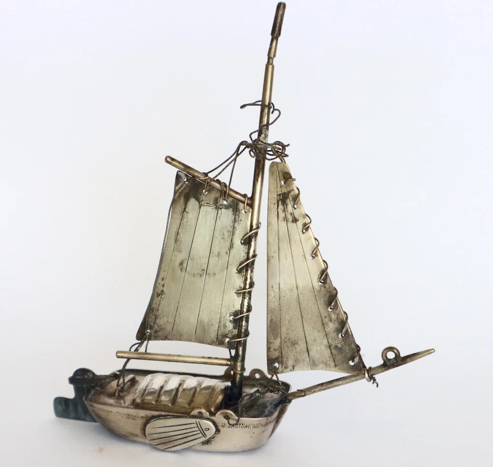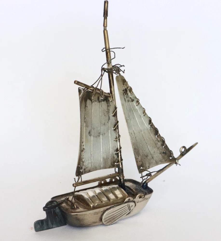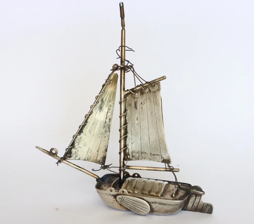 1900 Dutch silver miniature of sailing boat. Mark silver on the sides. Size: 8.5 cm x 2.4 cm, H 9.2 cm, Weight 25.4 gr A4742
