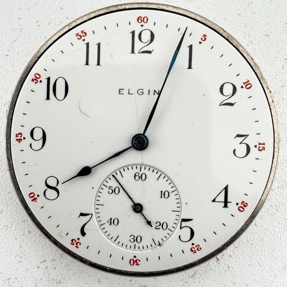 Antique 12 Size 1911 Elgin 17 Jewel Mechanical Pocket Watch Movement 345 USA Product Description Item: Pocket Watch Movement Brand: Elgin Movement: Mechanical Production Year: 1911 Country: USA Jewels: 17 Jewel Gender: Men's Grade: 345 Size: 12 Size Product Measurements Diameter: 39.5mm Product Condition Overall Condition: Fair, overall condition for its age. Functions: Running intermittently, will need service. Dial: The dial is in good condition. Hands: The hands have rust on them.