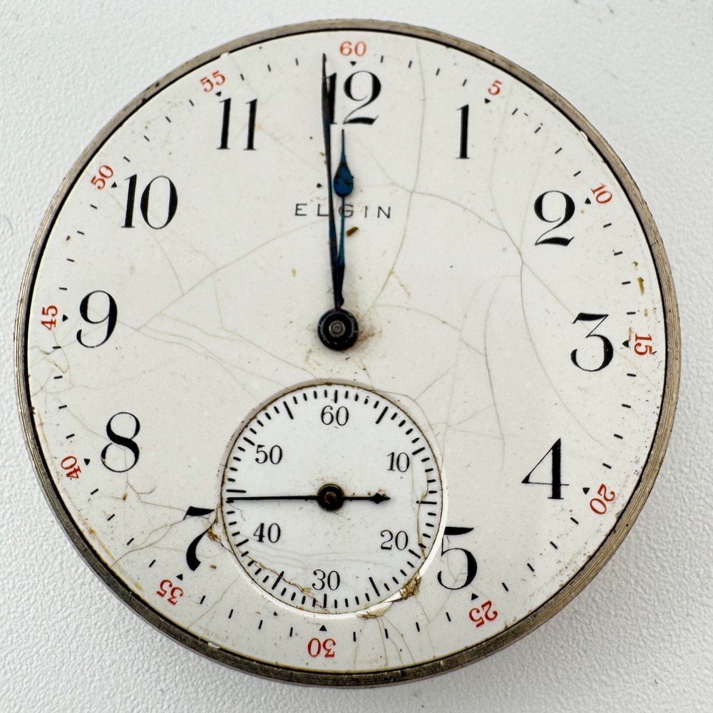 Antique 12s 1918 Elgin 15 Jewel Mechanical Pocket Watch Movement 315 USA Product Description Item: Pocket Watch Movement Brand: Elgin Movement: Mechanical Production Year: 1918 Country: USA Jewels: 15 Jewel Gender: Men's Grade: 315 Size: 12s Product Measurements Diameter: 39.5mm Product Condition Overall Condition: Poor, overall condition for its age. Functions: Not running but the balance complete is in good condition. Dial: The dial has hairline crack(s) on it. Hands: There is discoloration on the hands.