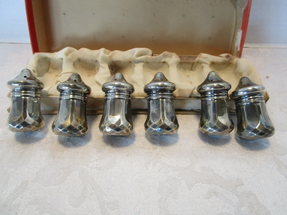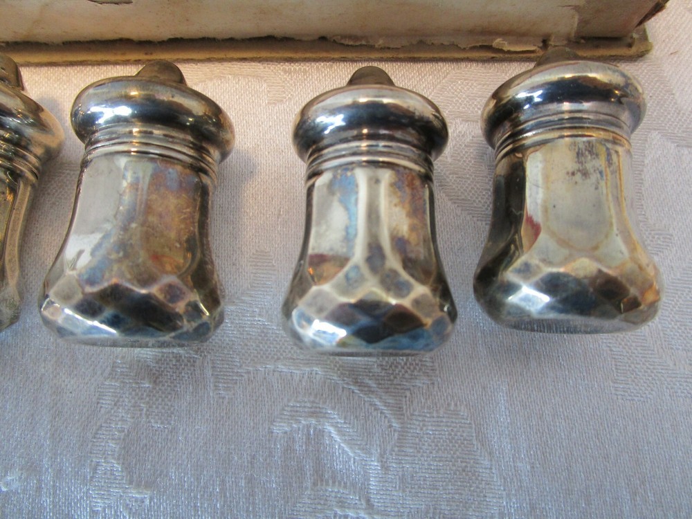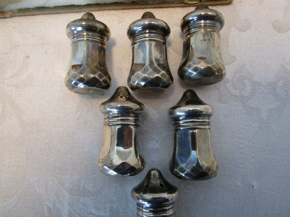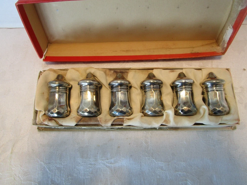 Description: 1/10/7/2 Vintage Sterling Silver 6-piece set, 3 Salt and 3 Pepper Shakers in original Box. These pieces are in pretty nice condition with no nicks or dings with some minor tarnish Each shaker is marked on the bottom-STERLING The dimensions of each shakers is 2” tall x 1” wide Each one weighs 0.3 ounces The box is 8.75” long x 2.75” wide x 1 3/8” tall. The box has age related wear-rips, scuffs and stains Box and shakers weigh 4 oz. Great antique condition- no dents or correction, appropriated tarnish for their age. Please zoom and view all pictures as they are part of the description. I DO MY BEST TO DESCRIBE EVERY LISTING BUT I AM NOT AN EXPERT AND ITEMS ARE SOLD “AS IS”. My idea of great/good may be different than yours, so EXAMINE PHOTOS CAREFULLY since they are binding and a supplement to the word description in case I should miss something. If I fail to mention something, it does not qualify as “item not as described” if it shows in my pictures. EACH PHOTO IS WORTH A THOUSAND WORDS AND THEY ARE OF THE EXACT ITEM YOU WILL RECEIVE. RETURN POLICY: Returns are acceptable ONLY if the item doesn’t match the description, is defective, or grossly misrepresented. THIS MEANS I DO NOT ACCEPT RETURNS for FIT, SIZING, COLOR ISSUES, OR BUYER'S REMORSE. Please zoom and view ALL pictures for more details as they are part of the description. Email me with any questions you may have. Please note: Buyer pays ALL return shipping and fees. If you use an eBay shipping label, it will be deducted from your refund amount. FEEDBACK : The transaction is considered over once I receive feedback from you confirming that you have received it and expressed satisfaction with it. If you are unsatisfied with your purchase, please contact me before leaving a neutral or negative feedback- so I can fix the issues.