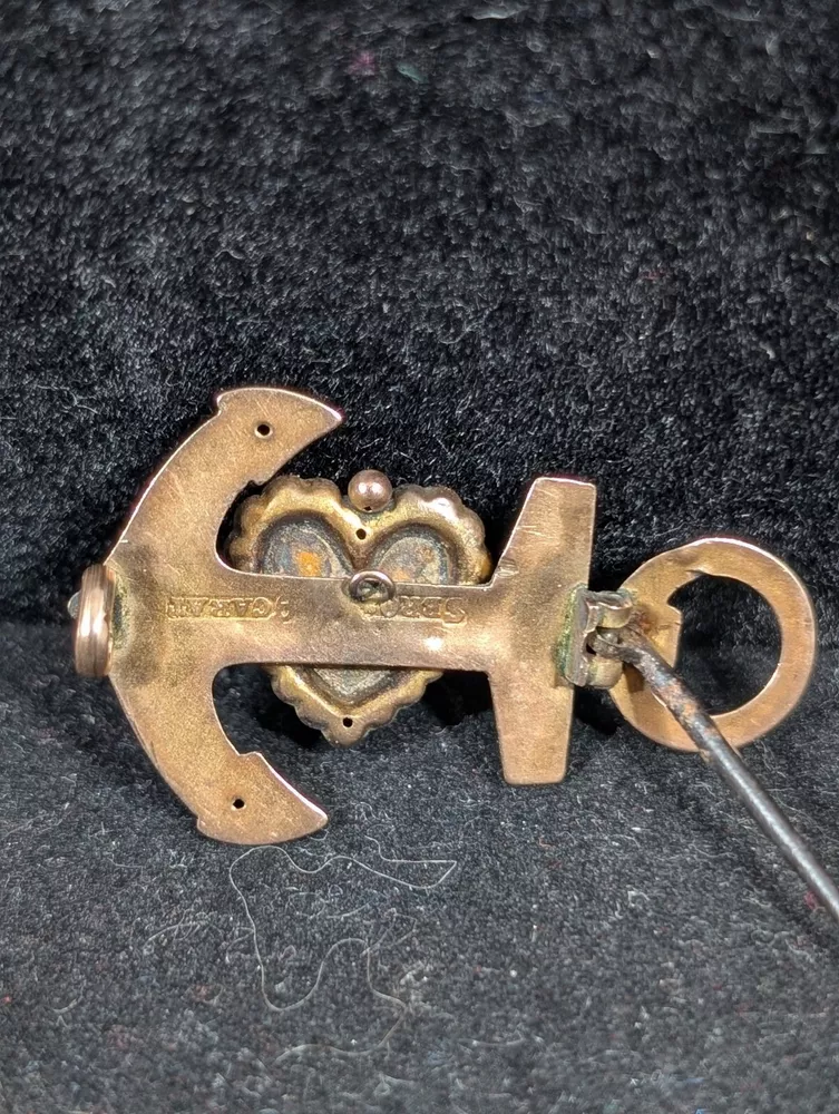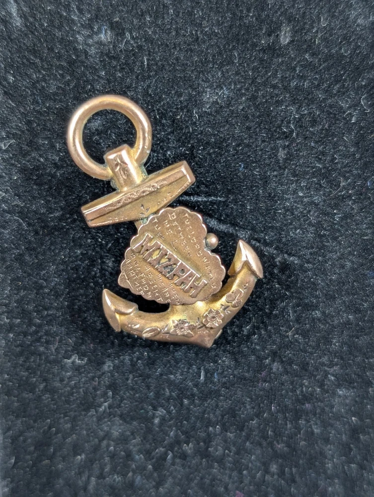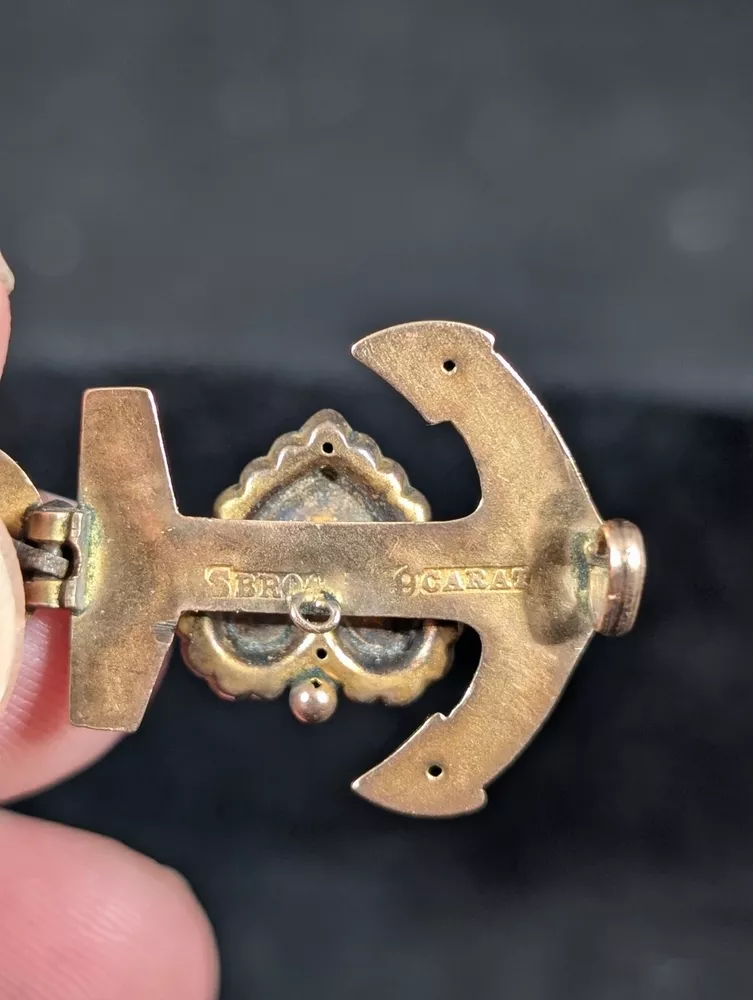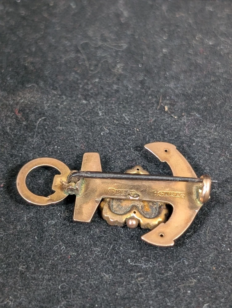 An antique 9ct rose gold MIZPAH brooch featuring an anchor and heart design, weighing 1.86g. This Victorian era piece is an original 9ct gold brooch with a unique design, making it a fine addition to any vintage jewelry collection.