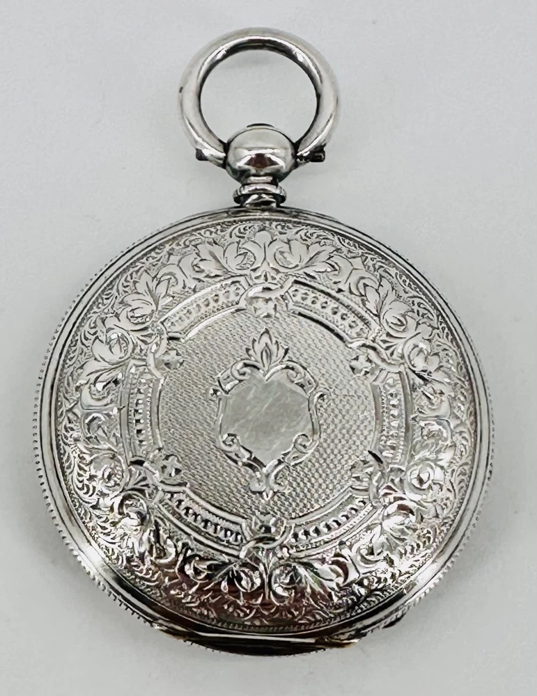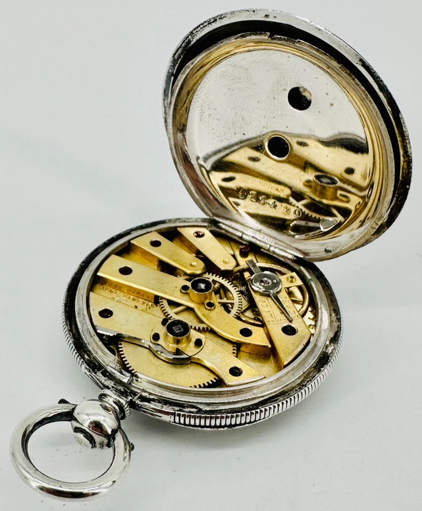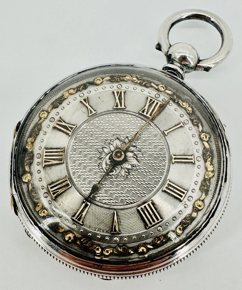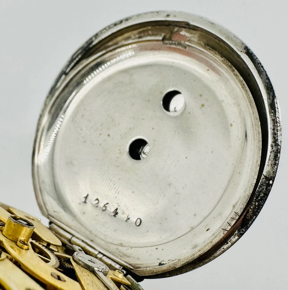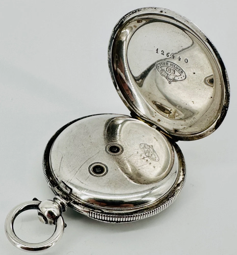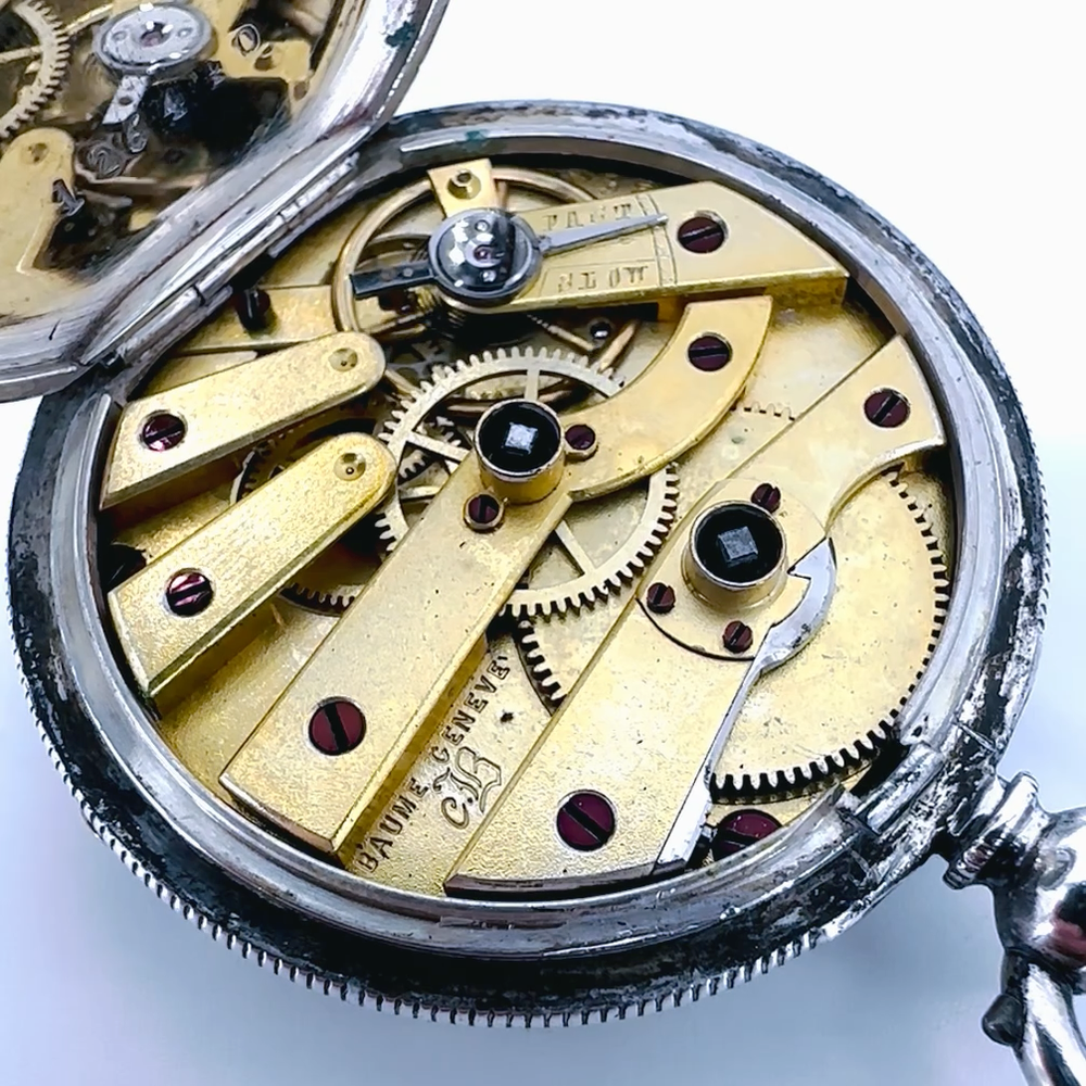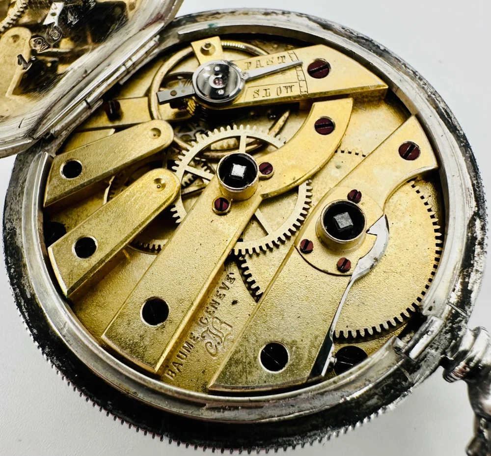 Antique Baume Genève Silver Pocket Watch – Matching Serials, C.B. Marked (c.1860s–80s) A fine antique Baume Genève silver pocket watch, dating from the mid-to-late 19th century. This elegant timepiece is notable for its originality, with the case & movement carrying the same serial number (126440) . Both the movement and case are marked with Baume Genève and the initials C.B. , very likely referring to Charles Baume , a key member of the Baume family active in Geneva during this period. The silver case is beautifully engine-turned with ornate engraving to the rear and carries the “FINE SILVER CB" mark. The silver dial features Roman numerals with decorative gilt accents, retaining a classic mid-19th century style. The watch is key wound and working , though sold as seen with no key included. This is a rare opportunity to acquire an early Baume Genève pocket watch with such clear provenance and originality, predating the firm’s later partnership that became Baume & Mercier . Brief History of the Maker: The Baume company was founded in Les Bois, Switzerland, in the 1830s by Louis-Victor and Célestin Baume. By the mid-19th century, the firm had established a strong reputation in Geneva and London, producing high-quality timepieces. Members of the Baume family, including Charles Baume, were instrumental in expanding the business during this period. In 1918, the company entered into partnership with Paul Mercier, forming the renowned brand Baume & Mercier , still celebrated today. Key Details: Maker: Baume Genève Case: Solid silver, marked Fine Silver CB , serial 126440 Movement: Key wound, signed Baume Genève C.B. , serial 126440 Dial: Silvered with Roman numerals and decorative gilt details Case Diameter: 37.1mm (approx.) Condition: Excellent overall – working and all-original with matching serials Condition: Working order Excellent condition for age No key included Original case, movement, and dial with matching serials Summary: A highly collectible 19th century Baume Geneve silver pocket watch , in excellent original condition with matching serial numbers and C.B. markings on both case and movement. Likely dating to the 1860s–1880s , this piece represents an important part of Baume’s early history before becoming Baume & Mercier. Postage & Shipping: As usual, this item will be packaged carefully and dispatched with tracking. International shipping is available upon request. US buyers: Please be aware that import duties, taxes or brokerage fees may be charged on arrival. These are set by U.S. Customs and your state and are payable by the buyer. International buyers: Similar import charges may apply depending on your location and local rules. We cannot declare a lower value or mark items as gifts on customs declarations.