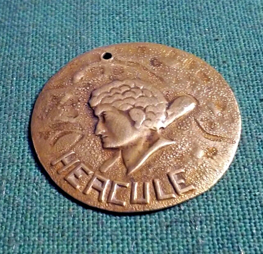 Antique Brass HERCULE Hercules Repousse' Coin Token Disc Charm Pendant 1" Inch