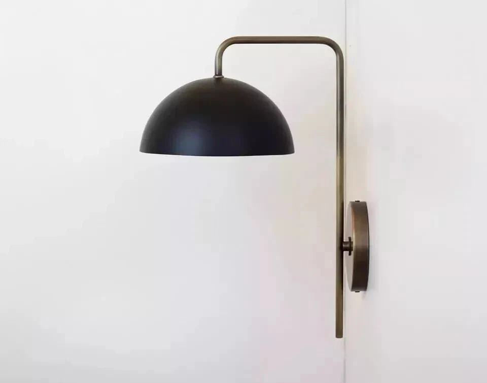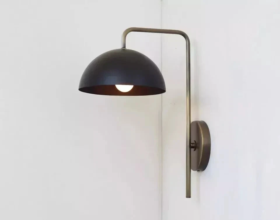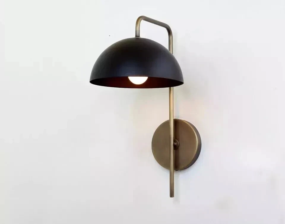 Mid-Century Modern Brass Wall Lamp - Handmade Blackened Brass Sconce with Black Aluminum Shade Add a touch of mid-century charm to your home with this exquisite brass wall lamp. Meticulously crafted by hand, this sconce embodies the iconic design principles of the mid-century modern era. Made from solid brass with an oxidized antique blackened finish, this wall lamp boasts a timeless elegance that complements any decor. Features: Premium Craftsmanship : 100% handmade from solid brass with a durable, protective lacquer finish that will naturally patina over time. Sophisticated Design : Black powder-coated lampshade, made of hand-spun aluminum, brings a sleek, modern contrast to the brass body. Versatile Usage : Ideal for various spaces, whether used as a living room reading light, a bedside lamp, a hallway accent, or a task light. Hardwired Installation : Designed for a hardwired setup. If you prefer a plug-in version with an on/off switch, please contact us. Specifications: Wall Canopy Diameter : 5 inches Overall Depth from Wall : 12 inches Height : 15.7 inches Shade Diameter : 7.9 inches Socket Type : Standard E27 (fits E26 medium base), 110V-240V, max 60W (bulb not included) Elevate your space with this distinctive, high-quality lighting piece that marries form and function in true mid-century style.