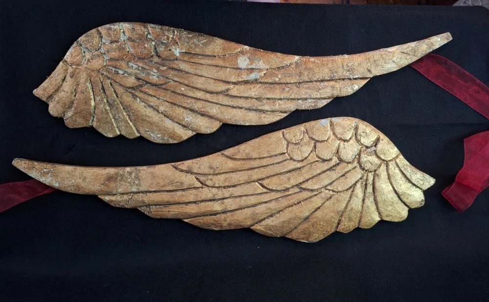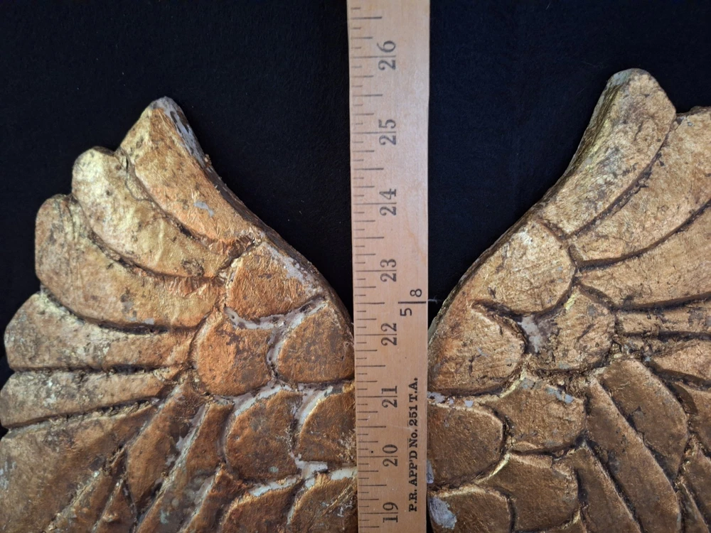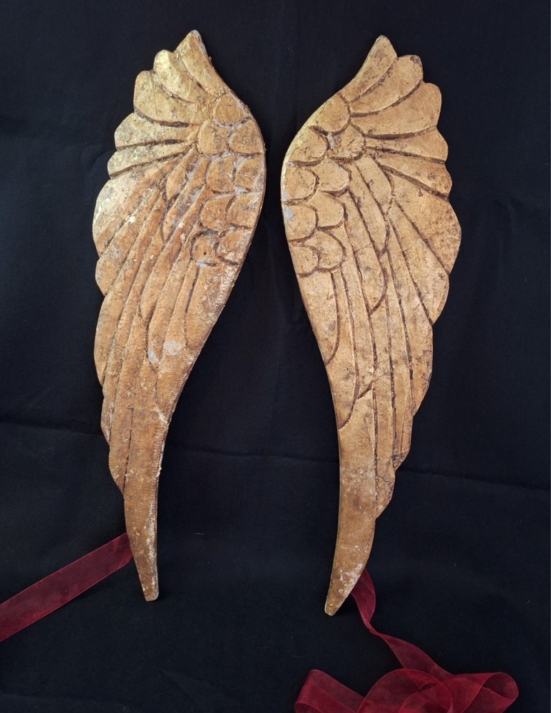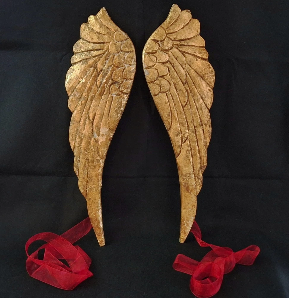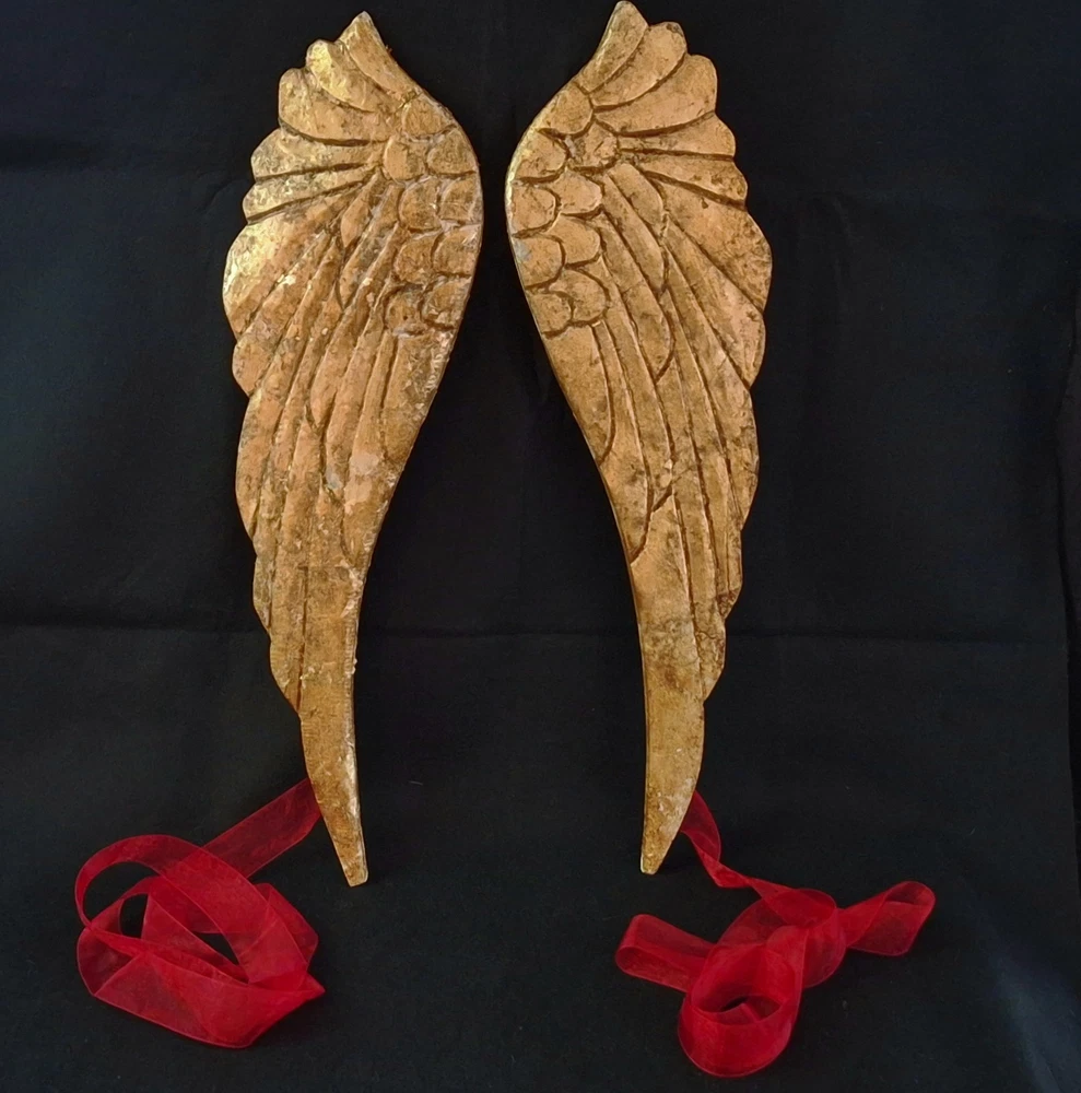 Timeless and etheral...these Gilded wings GLOW! Handcarved pair with Gilded finish each wing is 2 foot long by 2 inches. TOTAL 26 INCHES EACH. 8 INCHES AT WIDEST PART DOWN TO 2 INCHES AT BOTTOM. Very good pre-owned condition with marks consistent with a vintage item. Please review photos. Red silk ribbon can be left or easily removed. Beautiful decor pieces for every season. UPS SHIPPING