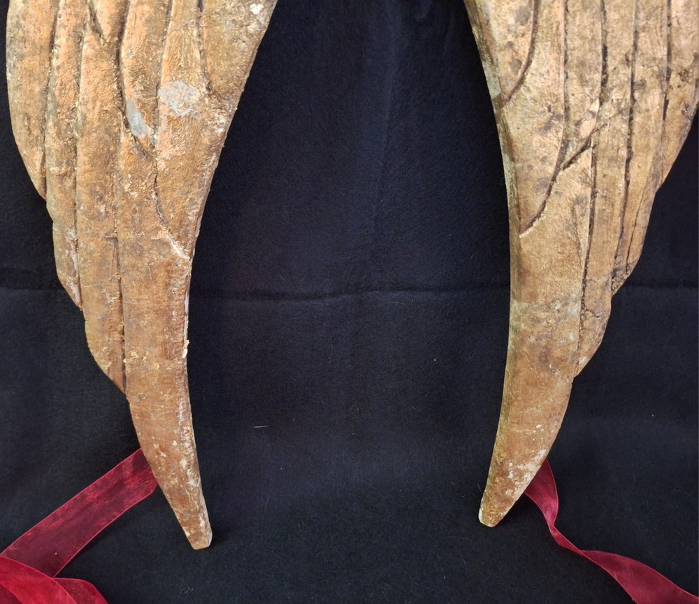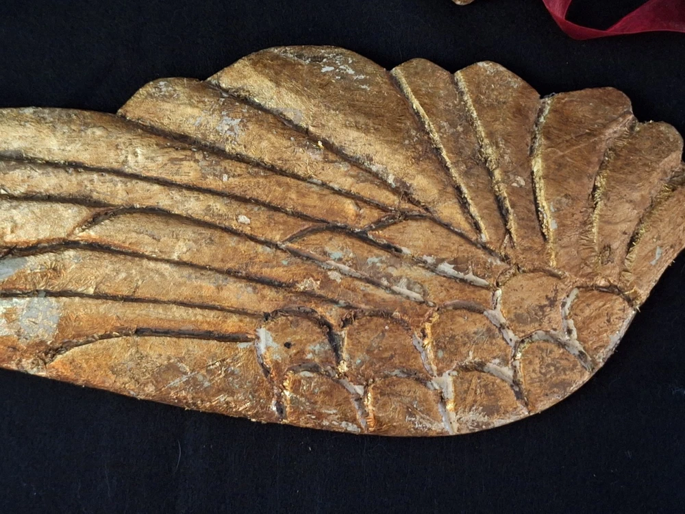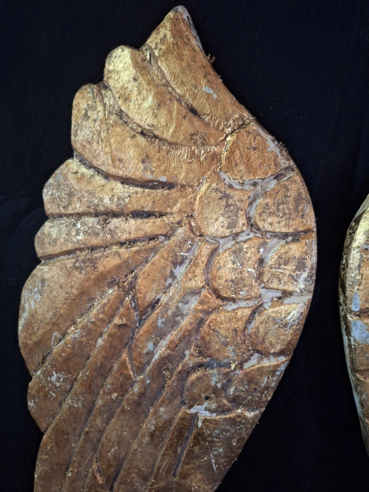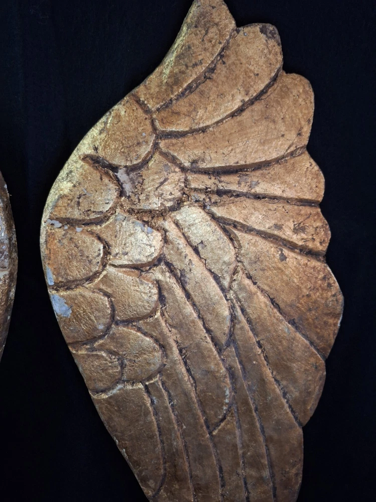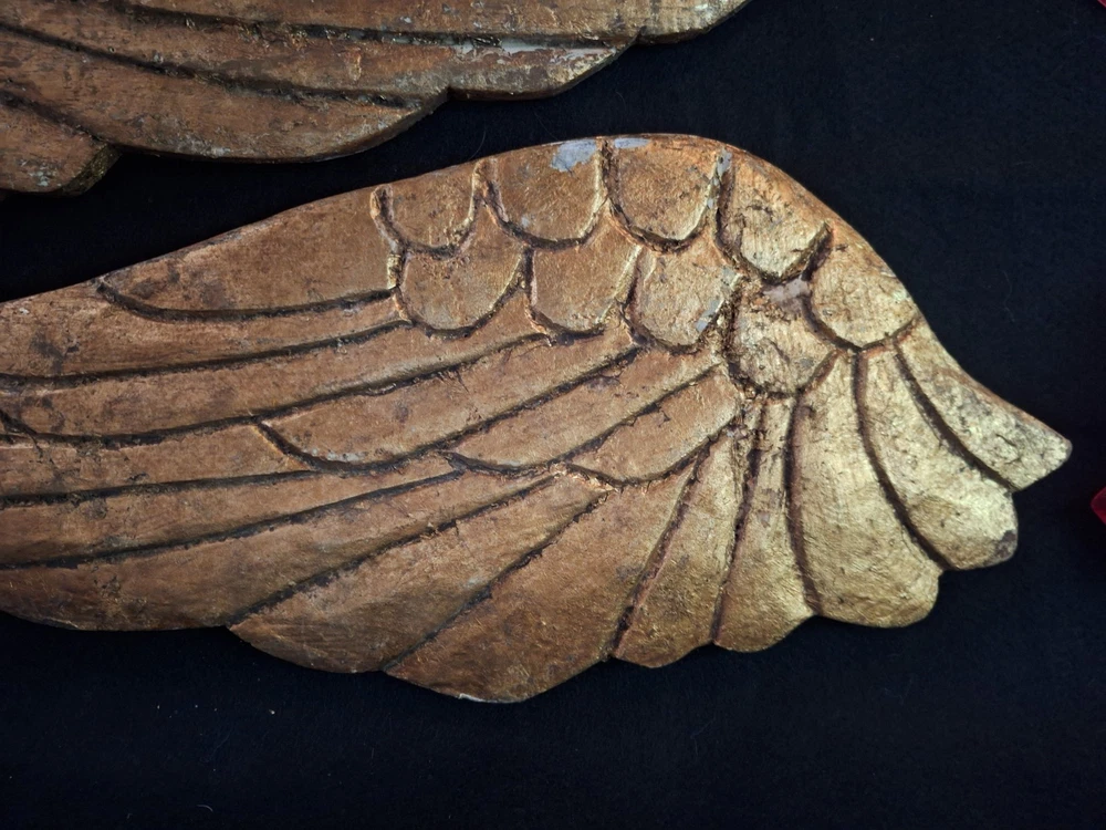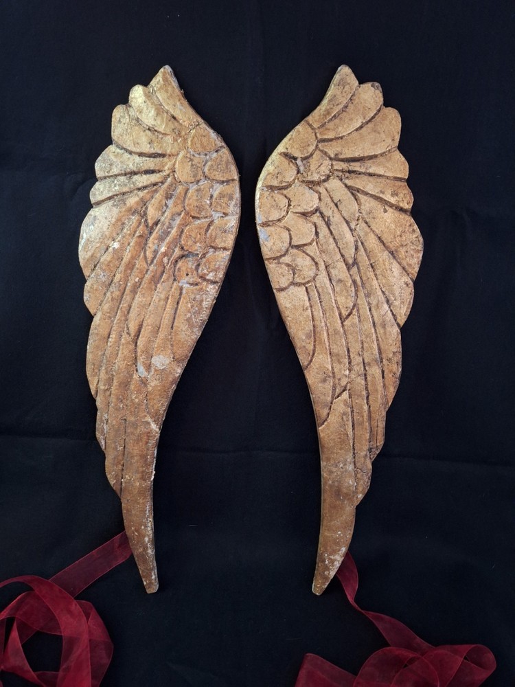 Timeless and etheral...these Gilded wings GLOW! Handcarved pair with Gilded finish each wing is 2 foot long by 2 inches. TOTAL 26 INCHES EACH. 8 INCHES AT WIDEST PART DOWN TO 2 INCHES AT BOTTOM. Very good pre-owned condition with marks consistent with a vintage item. Please review photos. Red silk ribbon can be left or easily removed. Beautiful decor pieces for every season. UPS SHIPPING