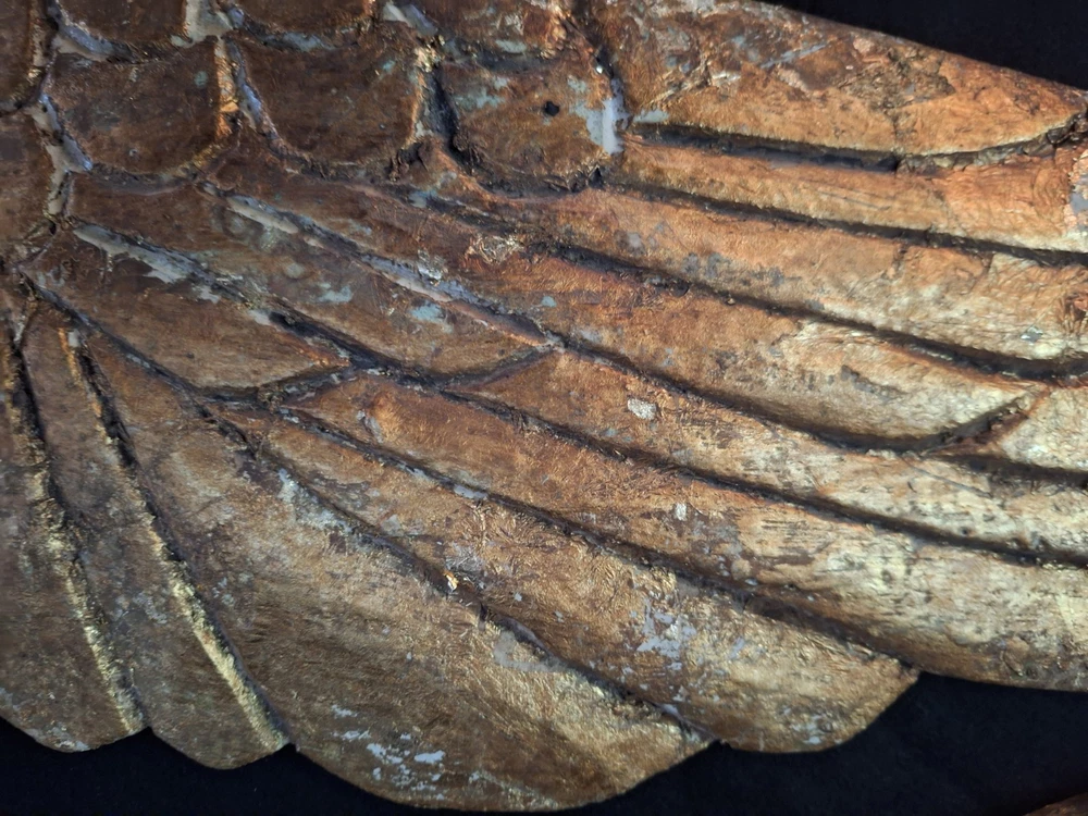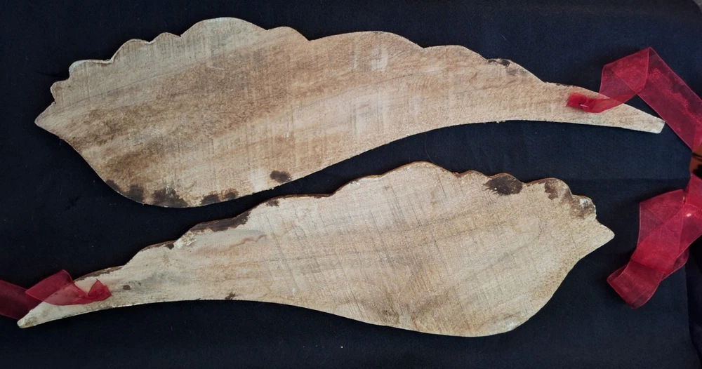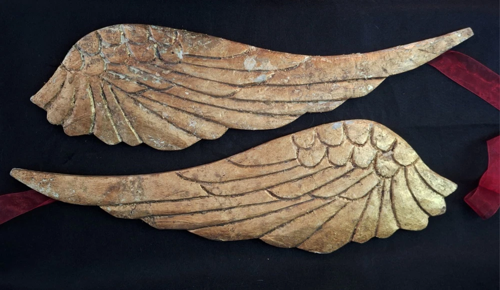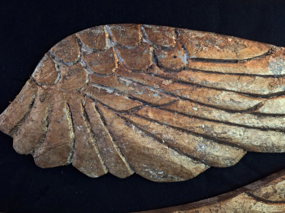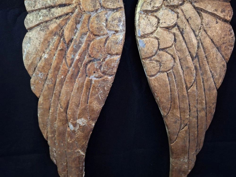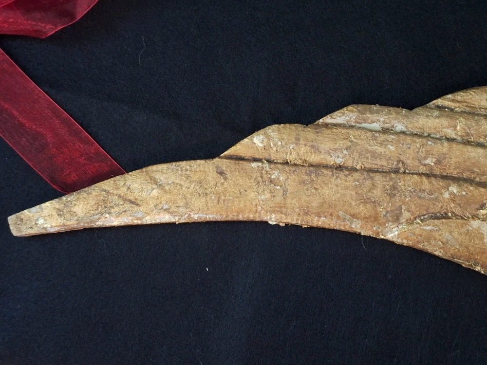 Timeless and etheral...these Gilded wings GLOW! Handcarved pair with Gilded finish each wing is 2 foot long by 2 inches. TOTAL 26 INCHES EACH. 8 INCHES AT WIDEST PART DOWN TO 2 INCHES AT BOTTOM. Very good pre-owned condition with marks consistent with a vintage item. Please review photos. Red silk ribbon can be left or easily removed. Beautiful decor pieces for every season. UPS SHIPPING
