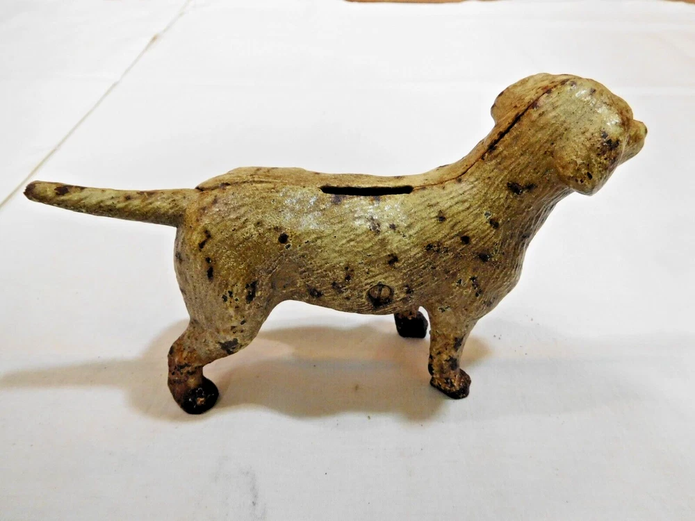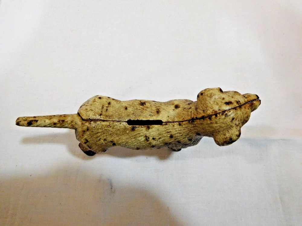 Cast Iron Spotted Dog Bank Hubley 8 1/4" long x 5" tall at his head ~ 1 /7/8" wide at the shoulders In good used condition #3259