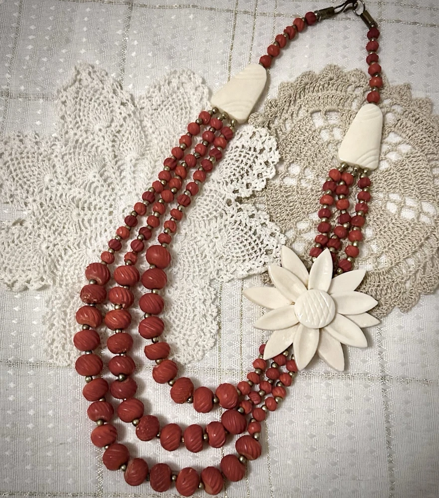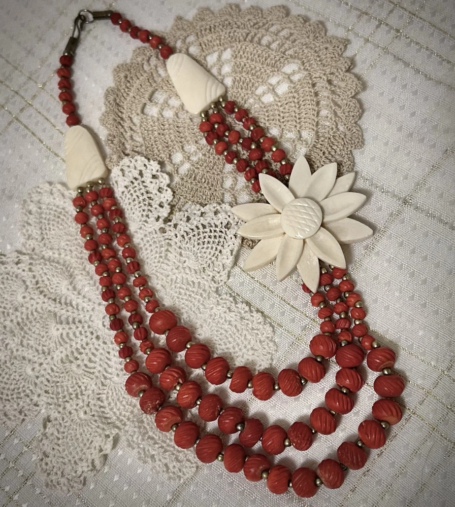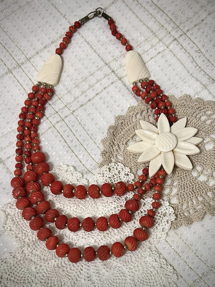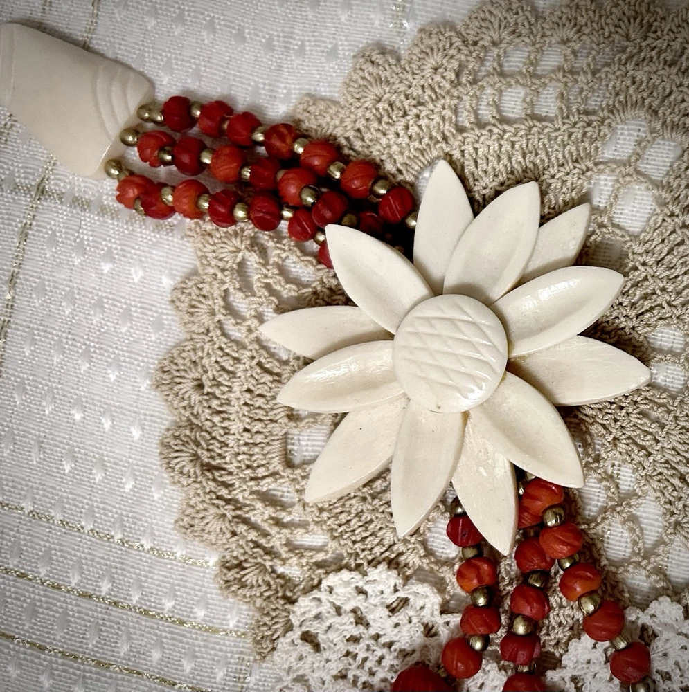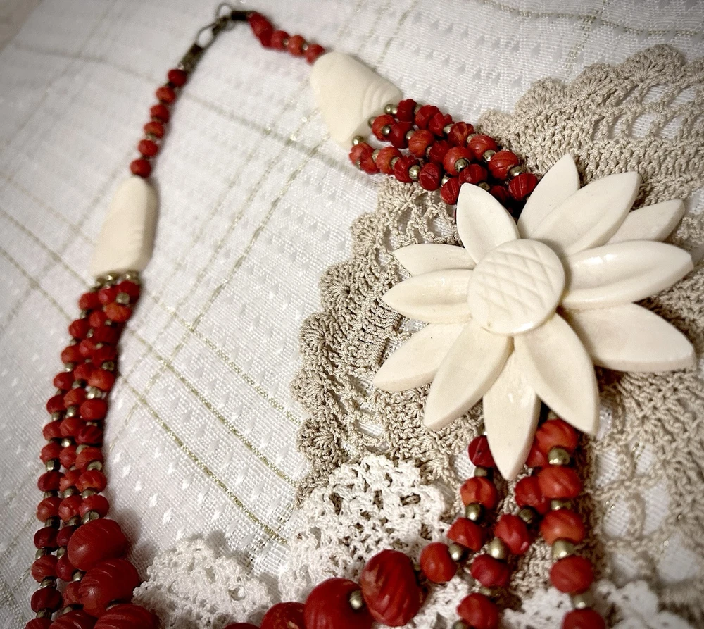 Antique Bib Necklace Dyed Celluloid carved Flower Accent Red Victorian 20”