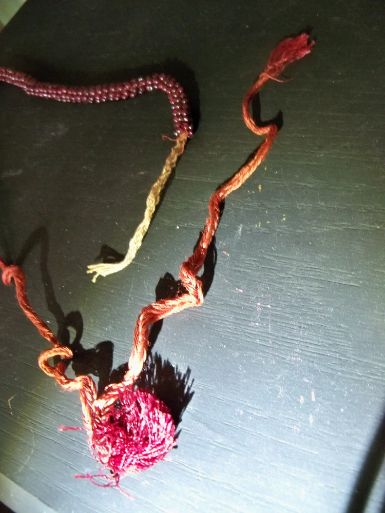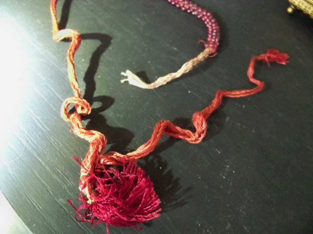 broken aged sold as-is as found. gorgeous old thing see u.s. quarter for size reference only. full length is approx 24" of corded full measure open, bead section is about 10". as is no return auction please, for diy upcycle adult collectors' doll clothes jewelry sewing craft statue adornment unknown or redo old lovely unknown Chinese Asian Himalayan or eastern design. no boxes or backgrounds, inventorykarmoireD1yellowpaper