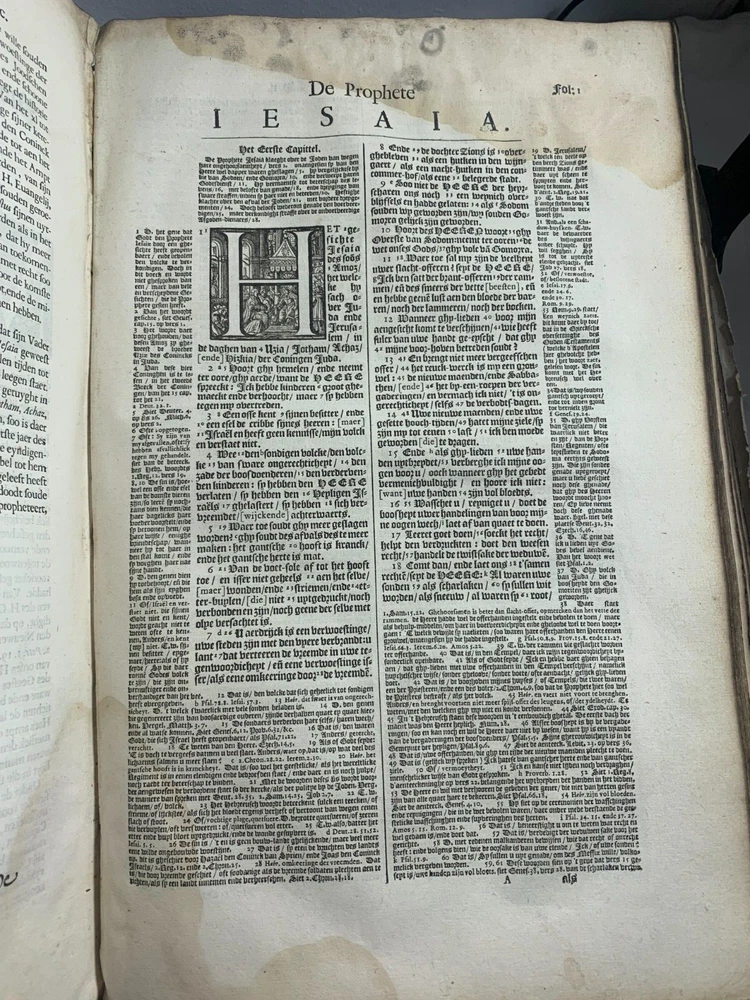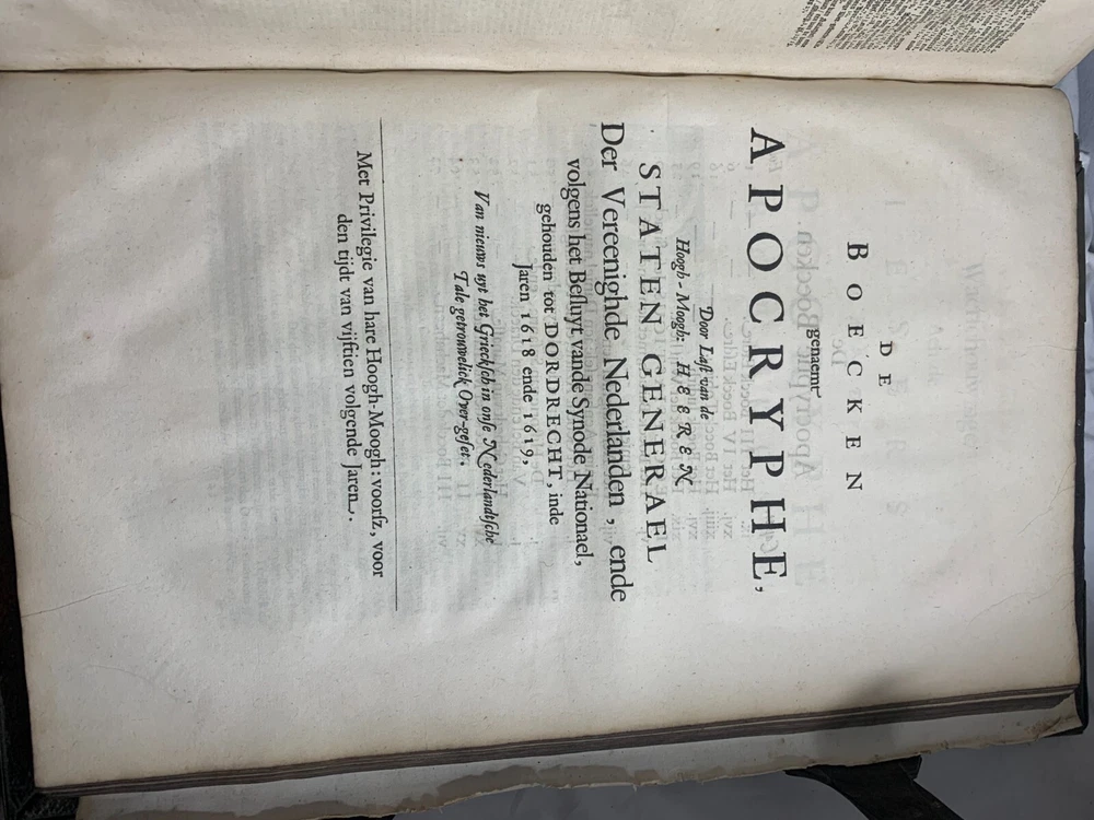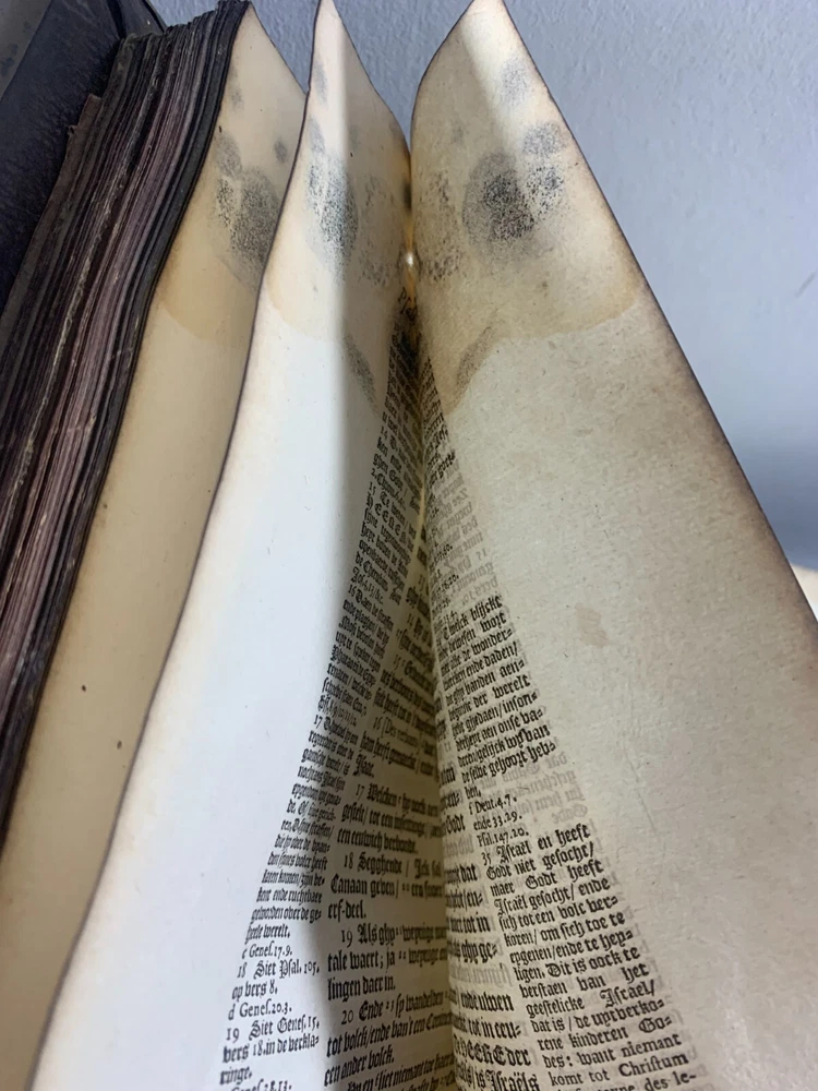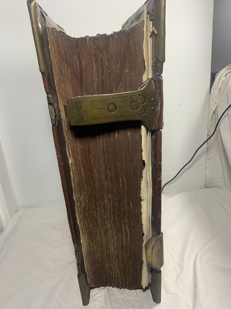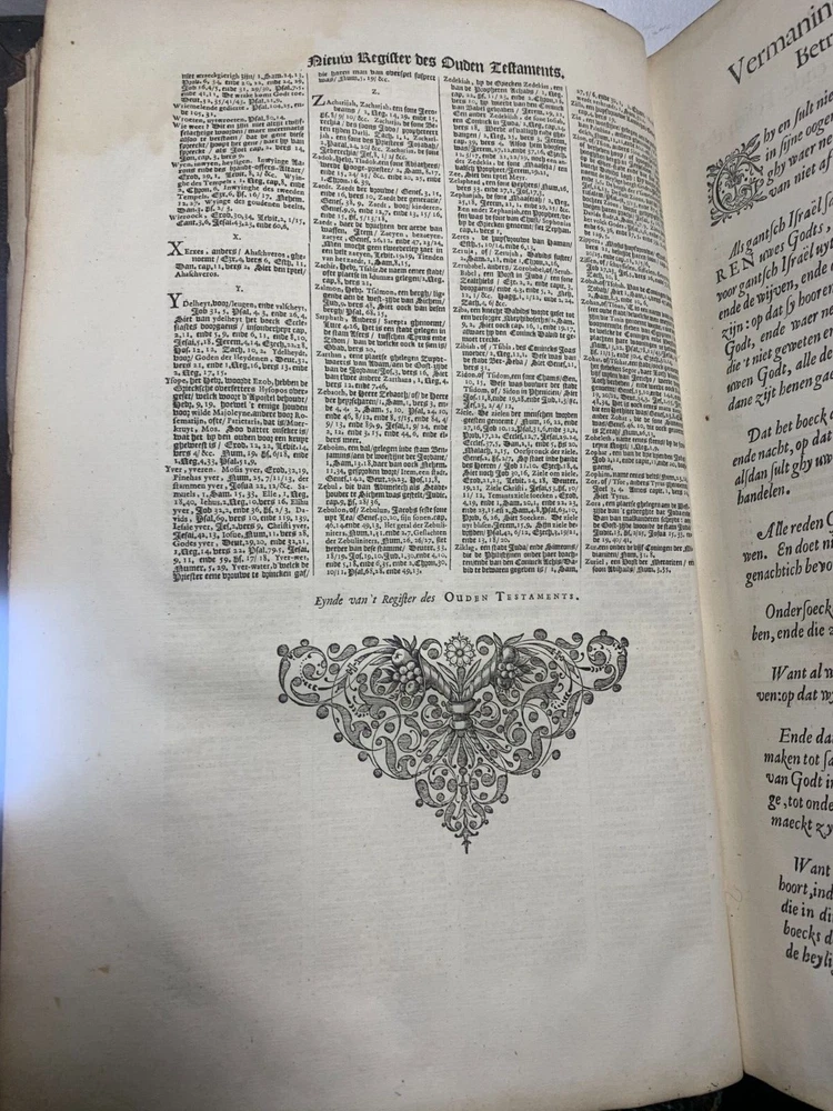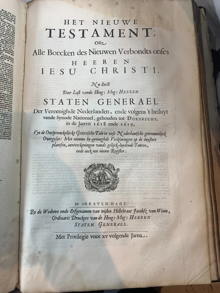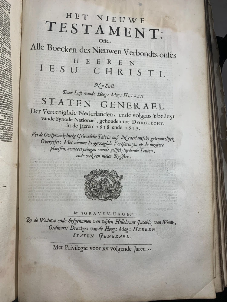 Antique Dutch Bible Statenvertaling, Large Folio, Early 18th Century, The Hague: Item Description: Offered for sale is a remarkable and historically important Dutch Statenbijbel (States Bible), printed in The Hague ( 's Gravenhage ) in the early 18th century by the widow and heirs of Hillebrandt Jacobsz van Wouw , official printers to the Staten Generael (States-General) of the Netherlands. This is a large folio-format edition of the Statenvertaling , the official Dutch Reformed Bible translation , first commissioned by the Synod of Dordrecht (1618–1619) and authorized for use throughout the Reformed Church in the Netherlands. This edition follows the standard 17th-century text and was printed for ecclesiastical or ceremonial use. Features: Translation: Statenvertaling (States-General Version) — Dutch Reformed Bible Provenance: Printed in 's Gravenhage (The Hague) Printer: Weduwe ende Erfgenamen van Hillebrandt Jacobsz van Wouw Language: Dutch Text Block Size: approx. 33 x 19 cm (13" x 7.5") Contents: Complete Old and New Testaments ( Het Oude en Nieuwe Testament ) Engraved Title Page: Architectural/ornamental design with Dutch heraldic imagery Bibliographic Reference: Large folio Dutch Statenbijbel, printed by the heirs of Hillebrandt Jacobsz van Wouw in The Hague. A later reprint of the authorized 1637 Statenvertaling, used for official and ecclesiastical purposes. Dimensions: Weight - 7.7KG Height - 44.5cm Width - 30.5cm Thickness - 13.5cm Damage (Please see above photos for reference): 1 brass clasp is missing (There should be two) Some pages are stuck together from a mixture of age and localised water damage (Please see above photos) There is foxing throughout the book (The text is still legible) The illustrations have been cut out at various points The maps have been separated at some point and the edges of the page, that the maps are on, have damage along the edges The cover is cracked with age The spine has to large points of damage (This is where I suspect the Bible was attached to a stand or pulpit) Some pages have minor tears and bent corners