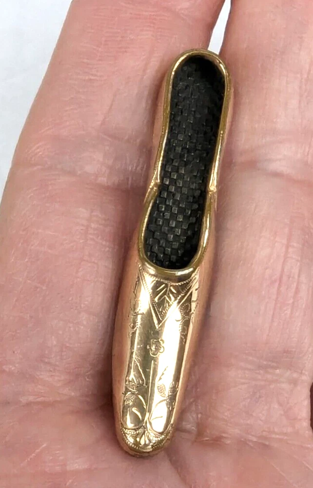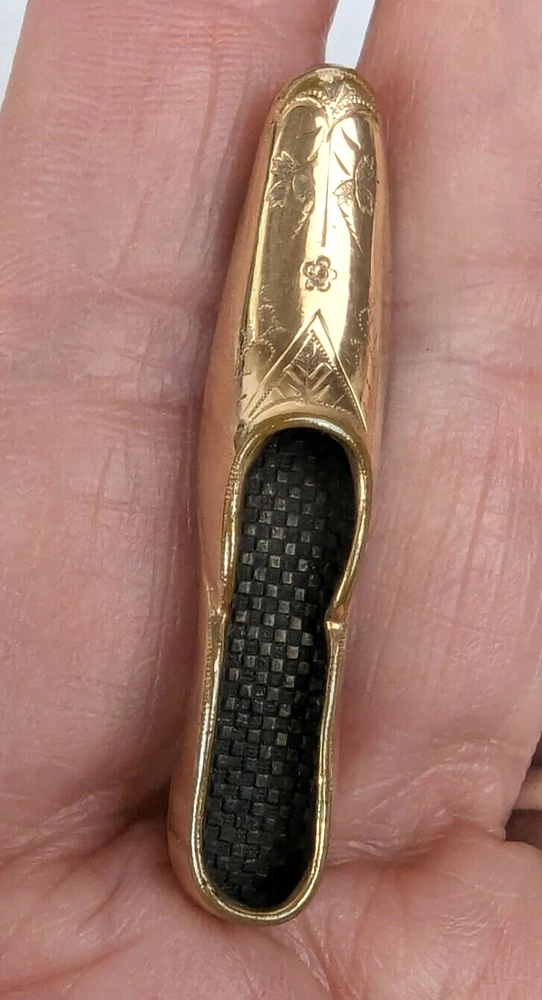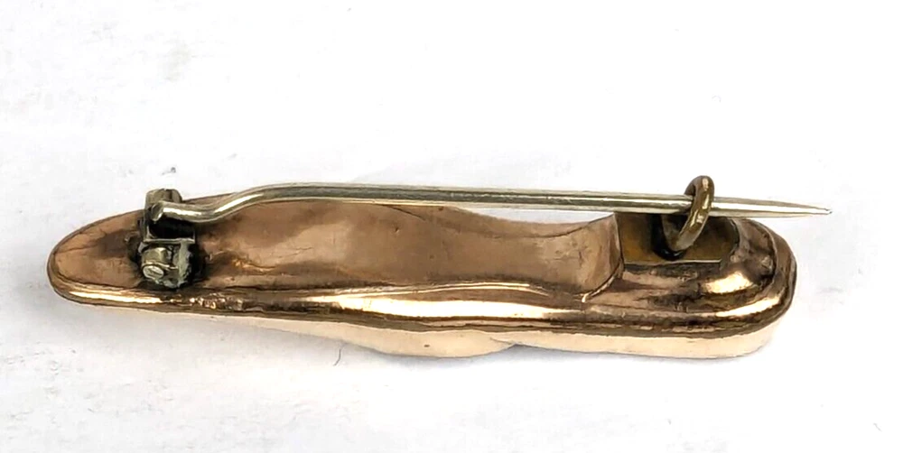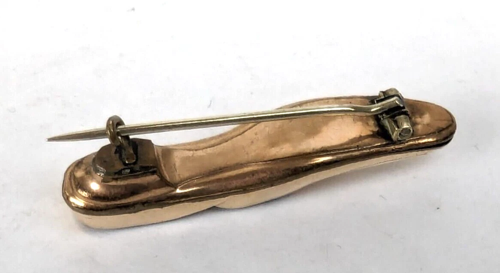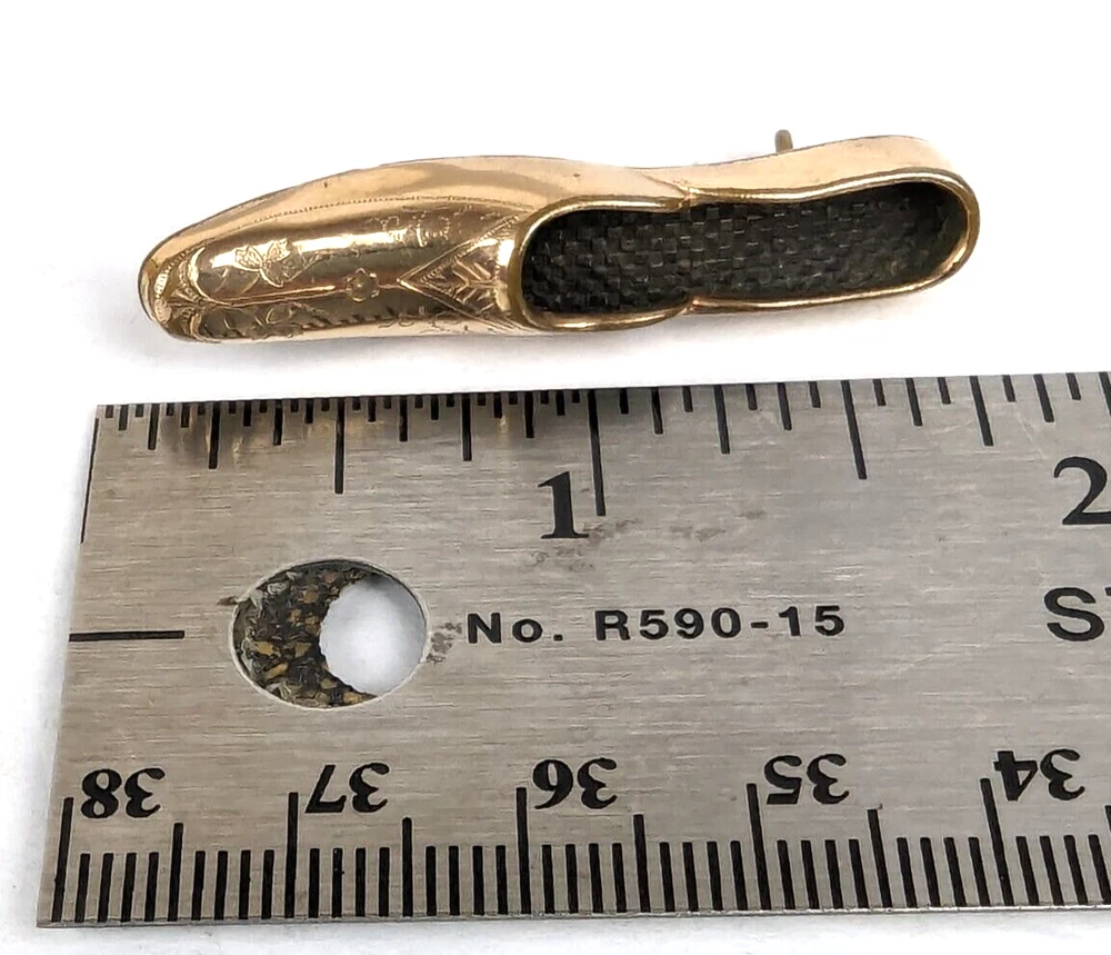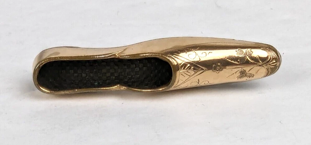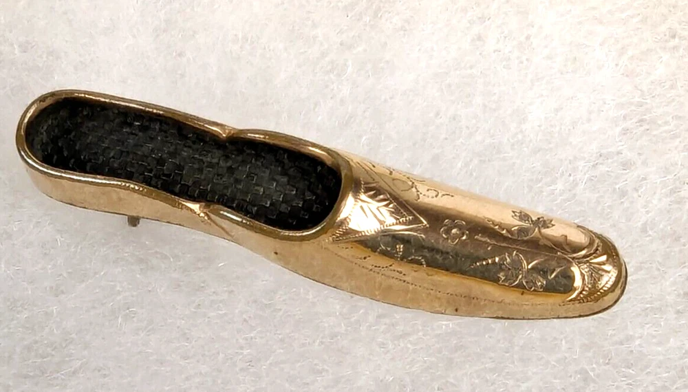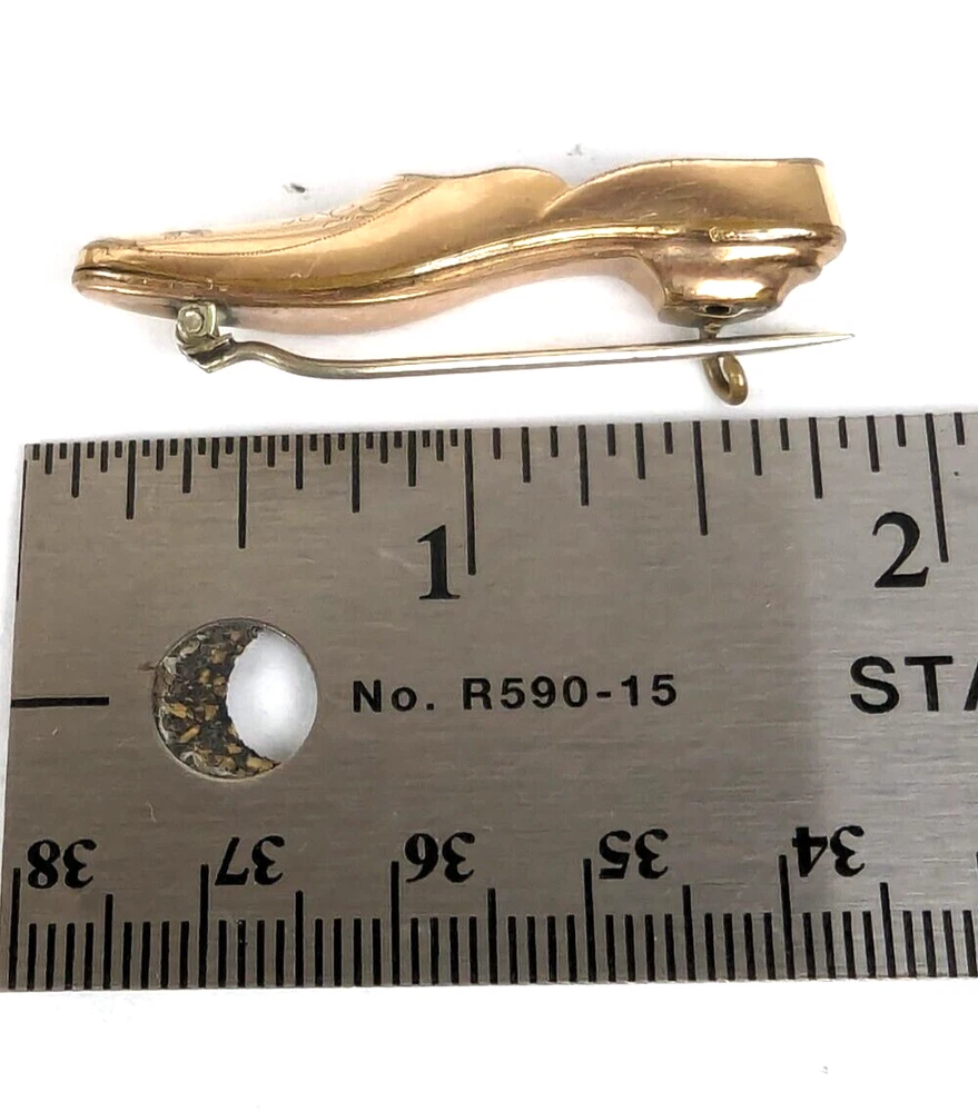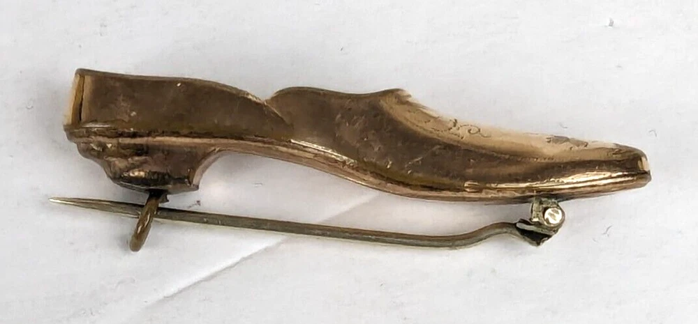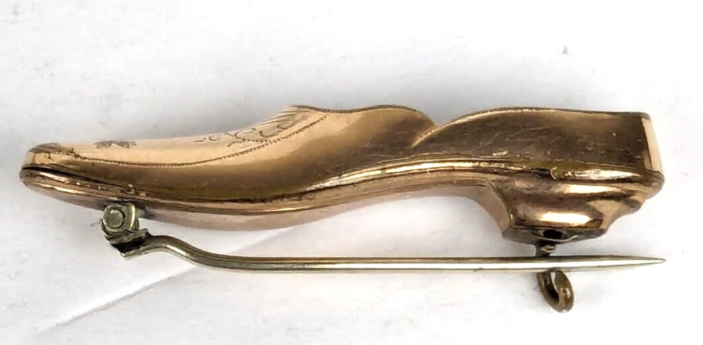 Antique Edwardian Victorian Era Shoe Slipper Pin Brooch. I believe this was used as a Nosegay to hold a tiny bouquet of flowers. Very unique and unusual Etched decorated Rolled Gold long slipper pin that is well made and very detailed. This shoe or long slipper measures 1 3/4 inches in length. It has a long Victorian hinge pin and simple C clasp. It is very finely crafted and the gold tests as 10k. I believe this is heavy rolled gold. 4520