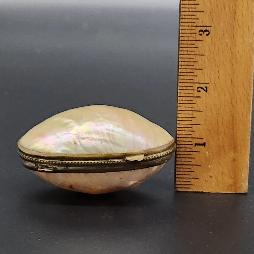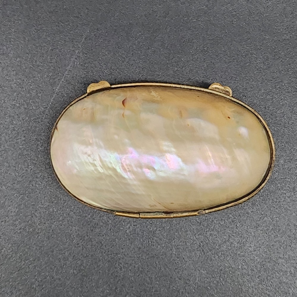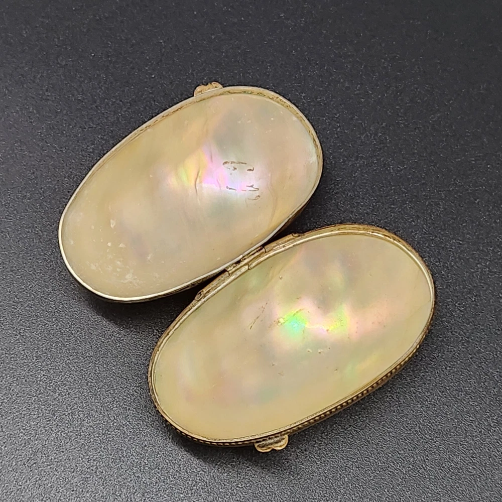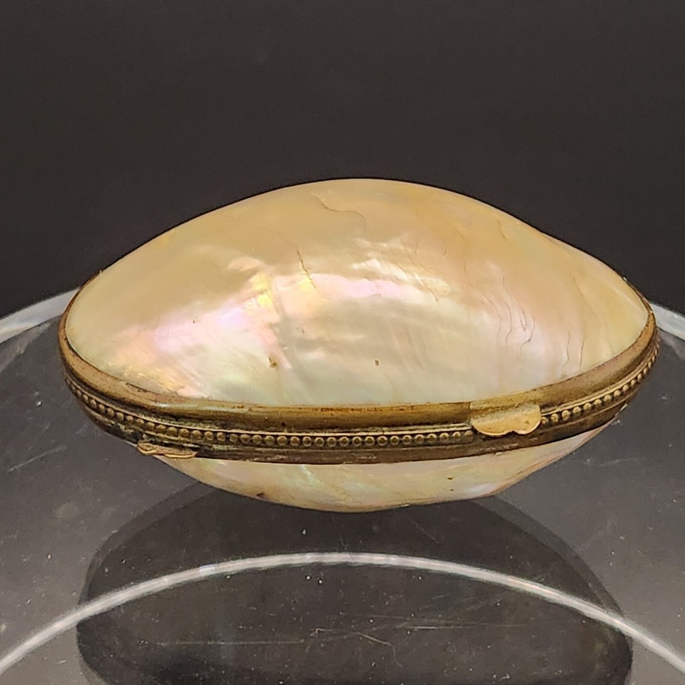 This exquisite antique pill/trinket box is crafted from lustrous mother of pearl, featuring a unique clamshell design and elegant metal trim. Its compact size makes it a functional and stylish addition to your collection, and its antique appeal adds a touch of sophistication to your personal items. • Clamshell design with metal trim • Antique age • Compact and portable • Height = 1.75 inches. Very good antique condition. One minor surface crack on the inside of the piece. The gilt ormolu has a very heavy patina. See photos for details.