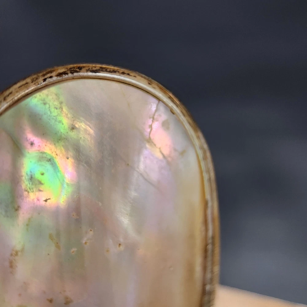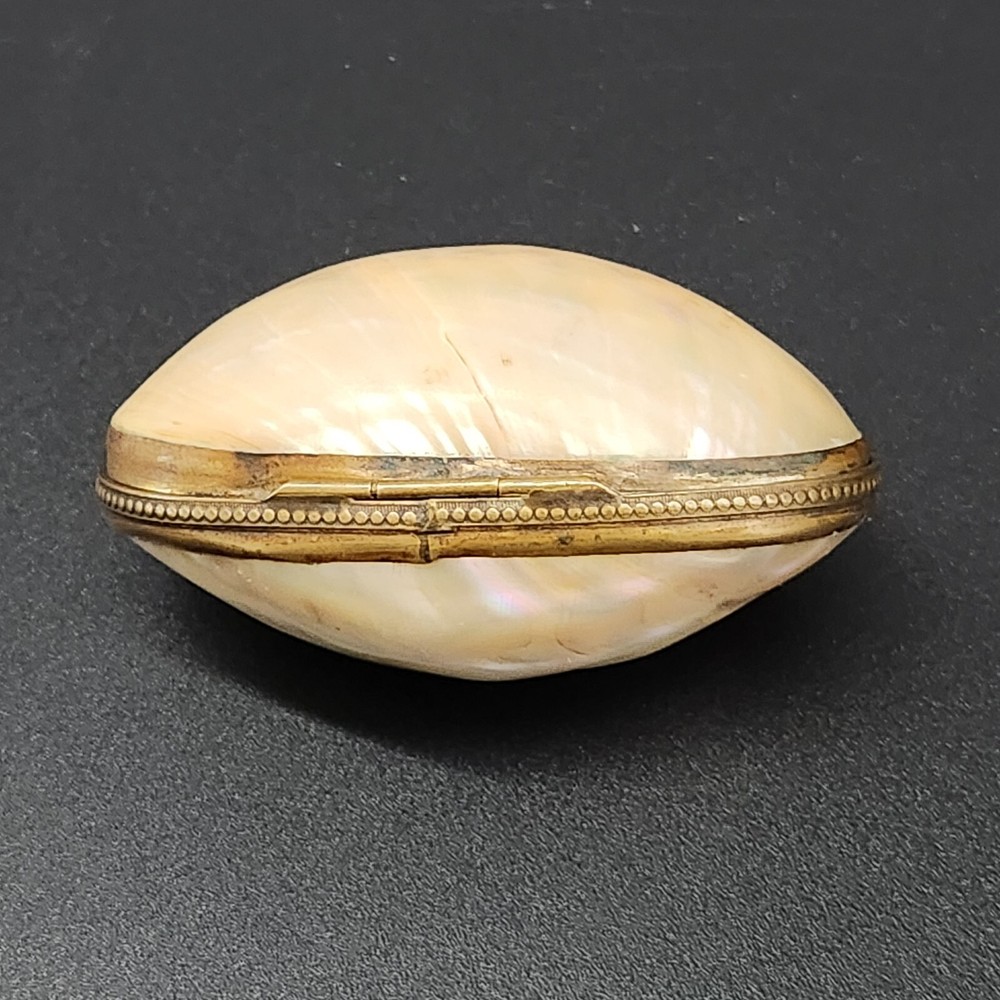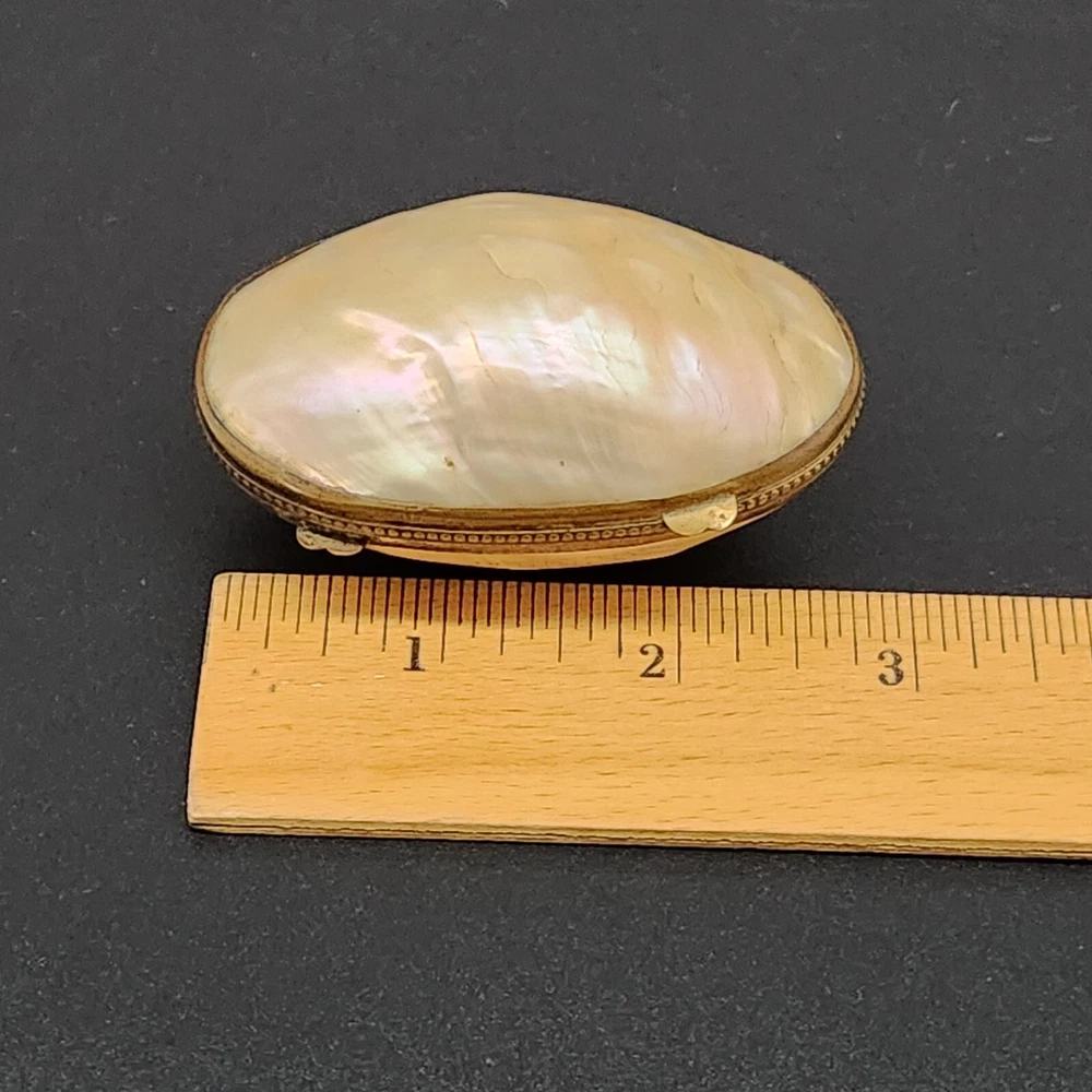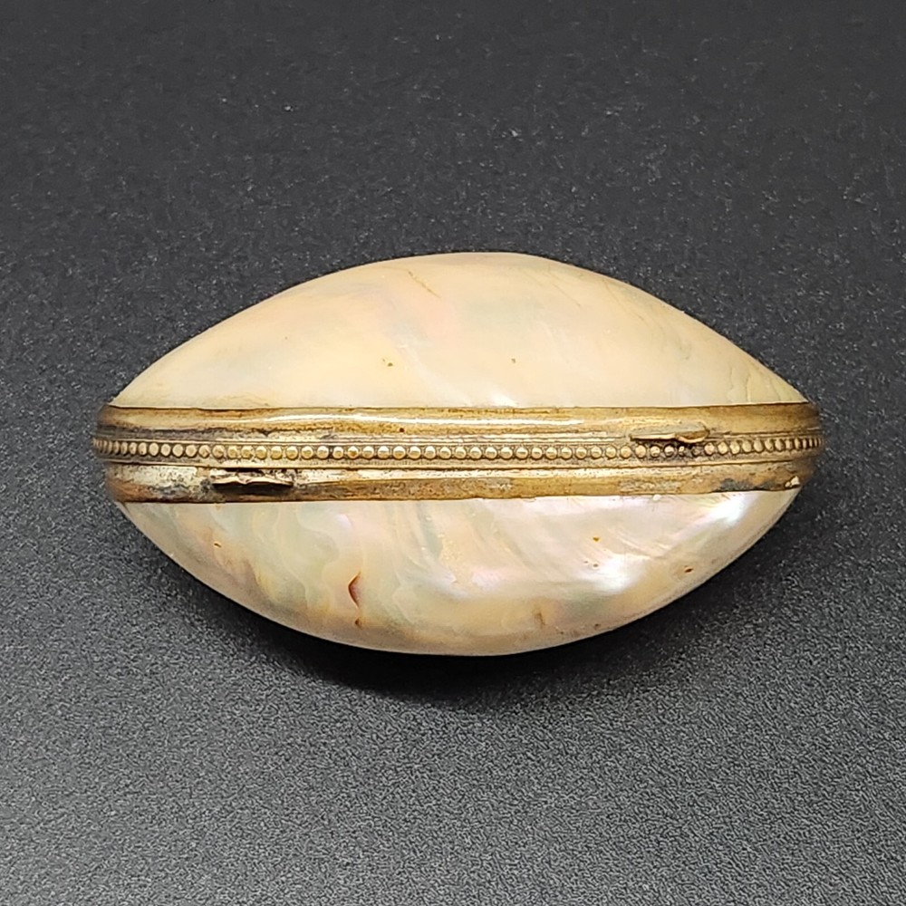 This exquisite antique pill/trinket box is crafted from lustrous mother of pearl, featuring a unique clamshell design and elegant metal trim. Its compact size makes it a functional and stylish addition to your collection, and its antique appeal adds a touch of sophistication to your personal items. • Clamshell design with metal trim • Antique age • Compact and portable • Height = 1.75 inches. Very good antique condition. One minor surface crack on the inside of the piece. The gilt ormolu has a very heavy patina. See photos for details.
