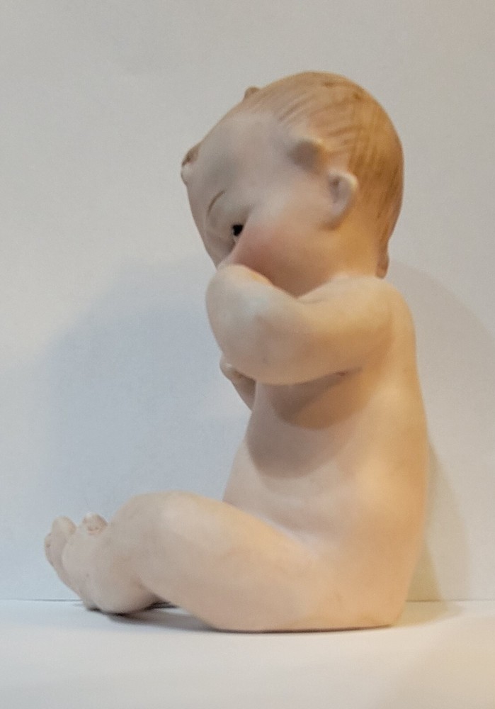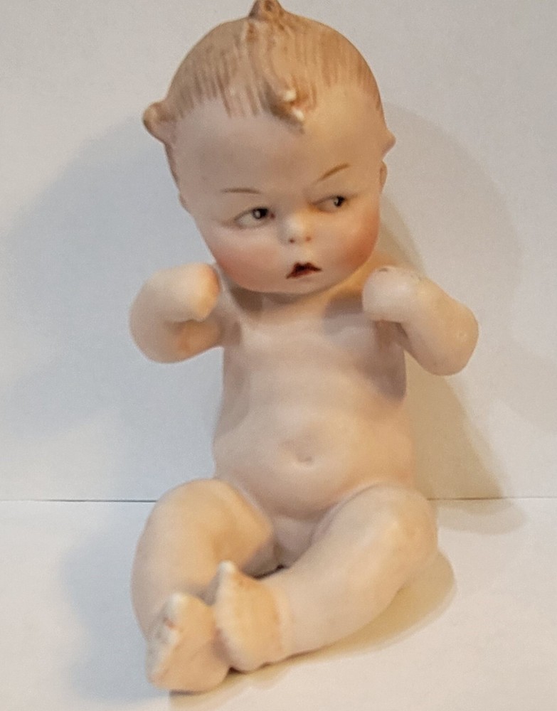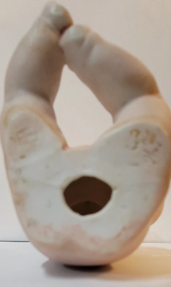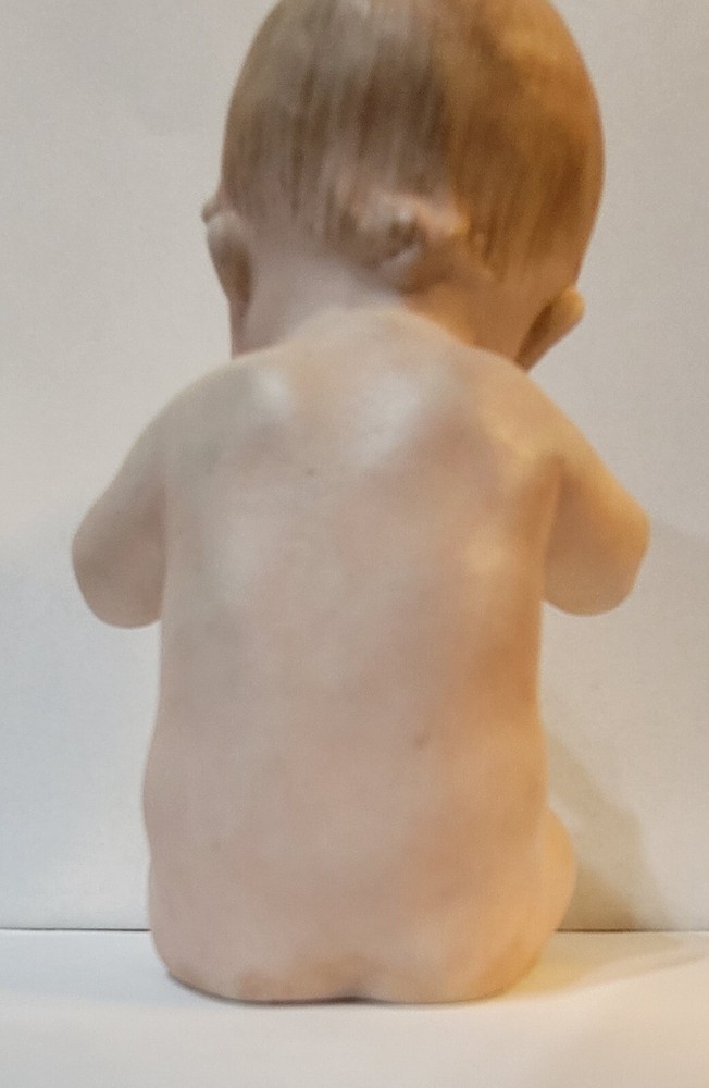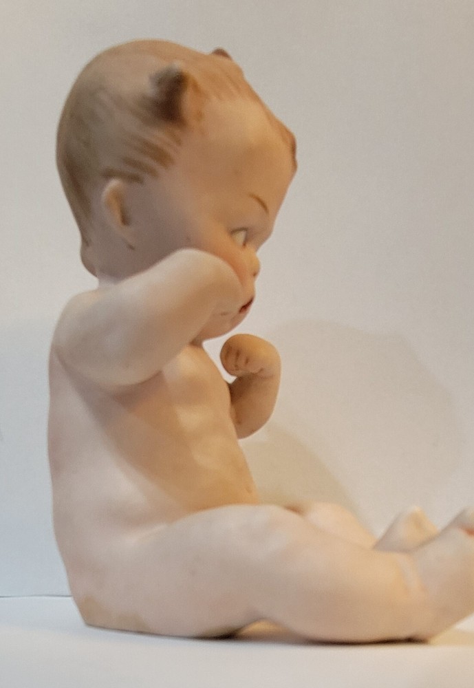 Crafted with the utmost care, this Antique Gebruder Heubach bisque porcelain baby figurine exudes timeless charm and delicate craftsmanship. The piece, featuring exquisite antique finish, is a testament to the renowned quality of Gebruder Heubach, a brand celebrated for its intricate porcelain creations. Measuring at 5 inches in length, this collectible showcases a serene and lifelike representation of a baby, making it a delightful addition to any collection or as a unique decorative piece that captivates the eye and stirs the imagination. Rare Position Baby by Gebruder Heubach. Bisque Figurine in sitting Position, 4" tall with bottom stamp ID 2690.