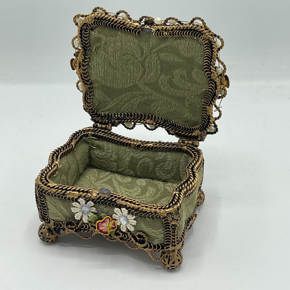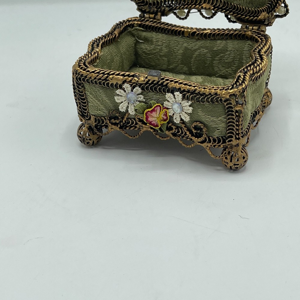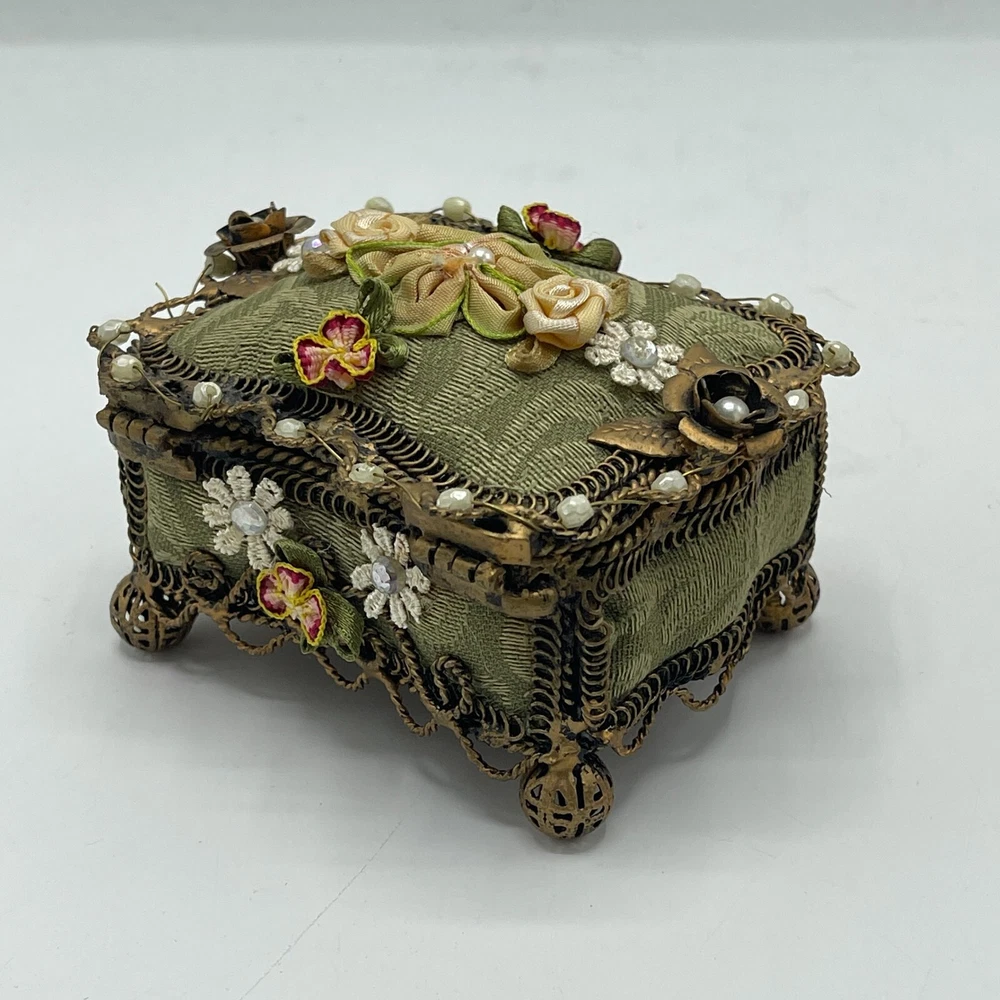 Antique charming piece Measures 3" x 2.5" x 2" Metal scrollwork with fabric flowers throughout. Please use pictures as an inclusive part of the description. Colors can vary on monitors. Happy to combine shipping with other items currently listed. We happily ship internationally. We are celebrating 22+ years on eBay & are happy to offer many varied items for collectors & consumers alike. New items listed daily.
