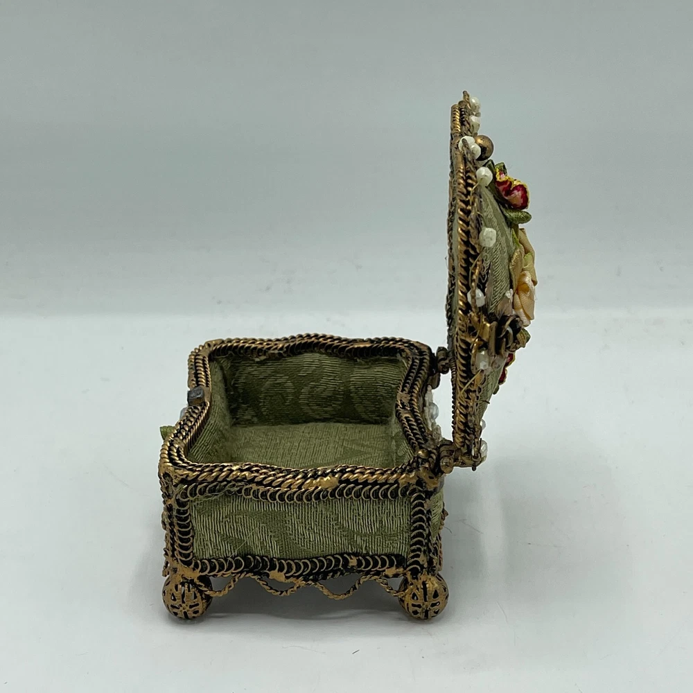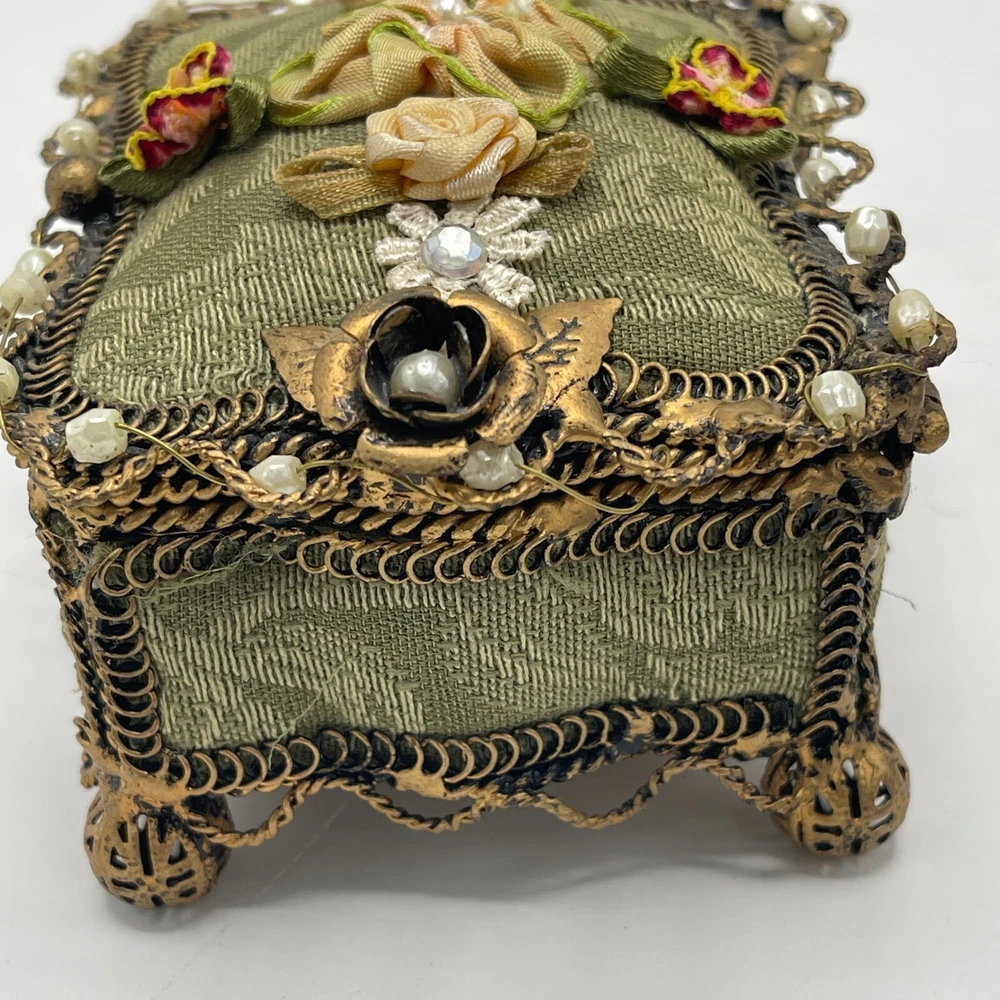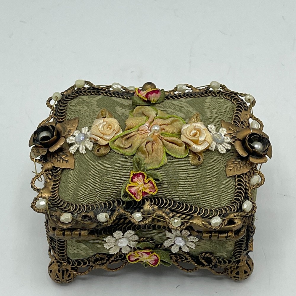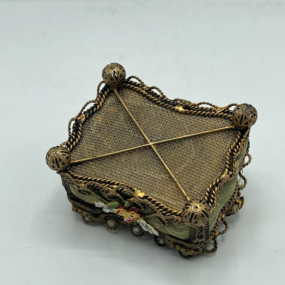 Antique charming piece Measures 3" x 2.5" x 2" Metal scrollwork with fabric flowers throughout. Please use pictures as an inclusive part of the description. Colors can vary on monitors. Happy to combine shipping with other items currently listed. We happily ship internationally. We are celebrating 22+ years on eBay & are happy to offer many varied items for collectors & consumers alike. New items listed daily.