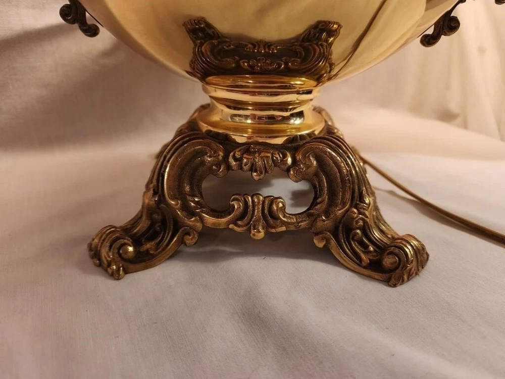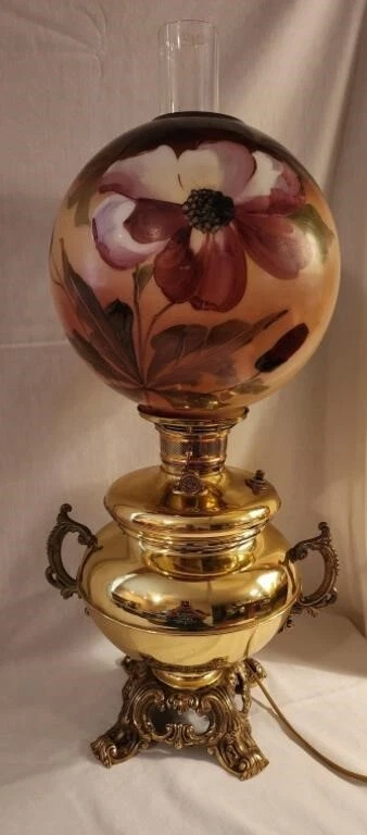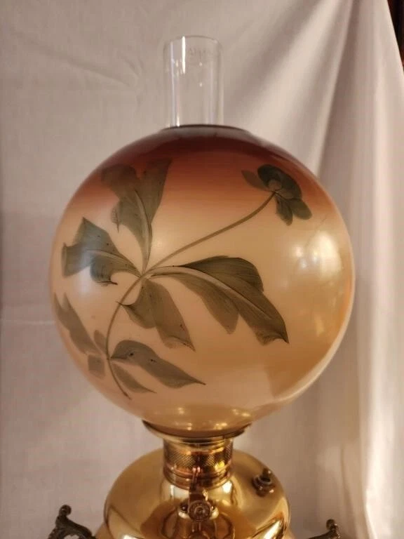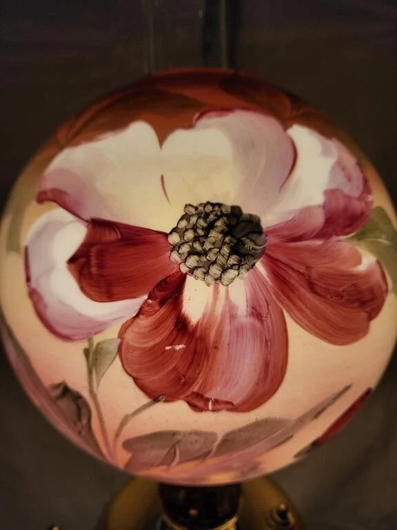 Antique brass and glass globe Gone With The Wind parlor lamp. Reddish pink colors.