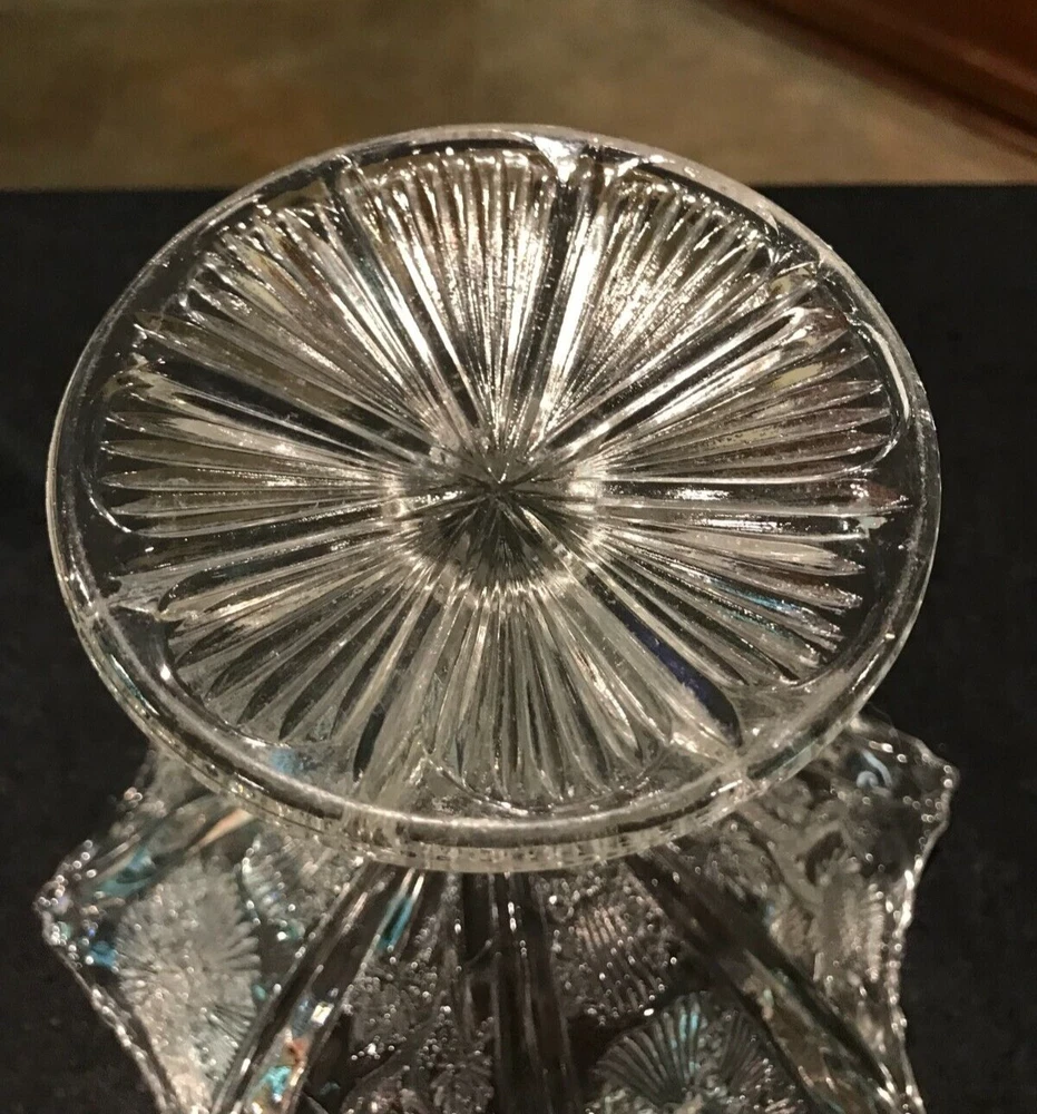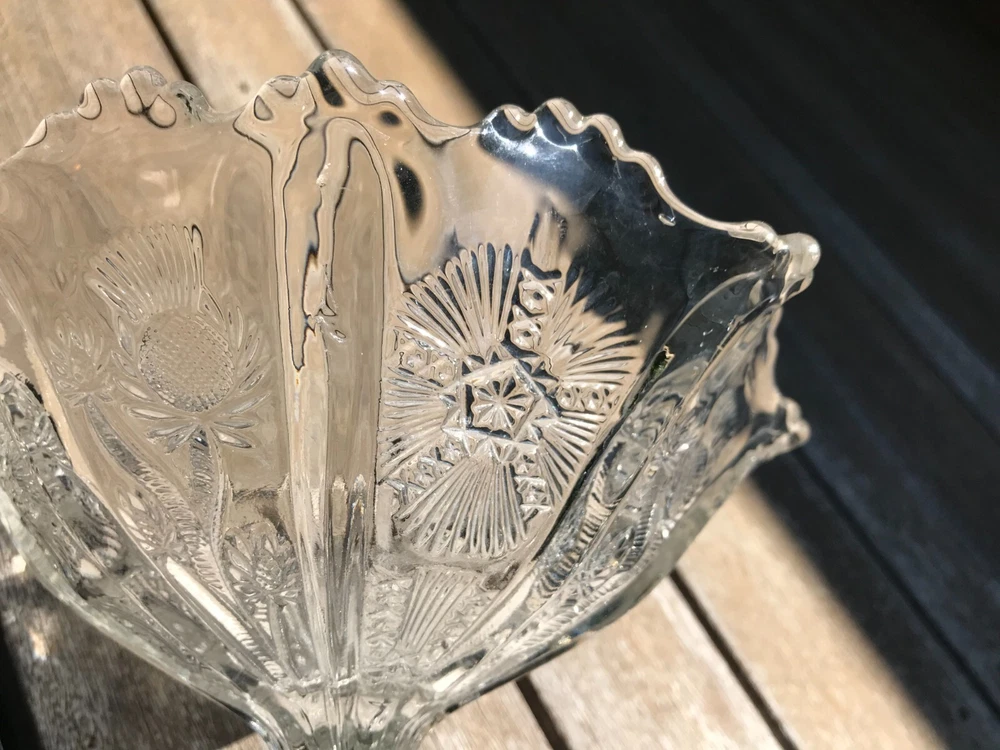 Glowing Gorgeous Antique Paneled Thistle/Delta HIGBEE Eight Paneled Pedestal Bowl. 7 1/" tall, rim 7 1/4" diameter, base 3 3/4". Unmarked. The base and the sawtooth scalloped rim glow, as well as the thick panel separators. There is, what seems to be a production flaw on 1 of the thick panel separators. It does not take away the beauty of this piece. Please refer to my photos. Panels extend to the base.