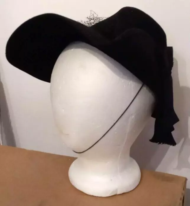 Department: Women Color: Black Season: Fall, Spring, Summer, Winter Occasion: Formal, Party/Cocktail Brand: Merrimac Hat Corp gtin13: Does not apply Accents: Bow, Grosgrain Ribbon, Netting Pattern: Solid Vintage: Yes Handmade: No Features: Elastic Chin Strap Style: Unicorne Material: Casein, Wool UPC: Does not apply Fabric Type: Felt Size: One Size
