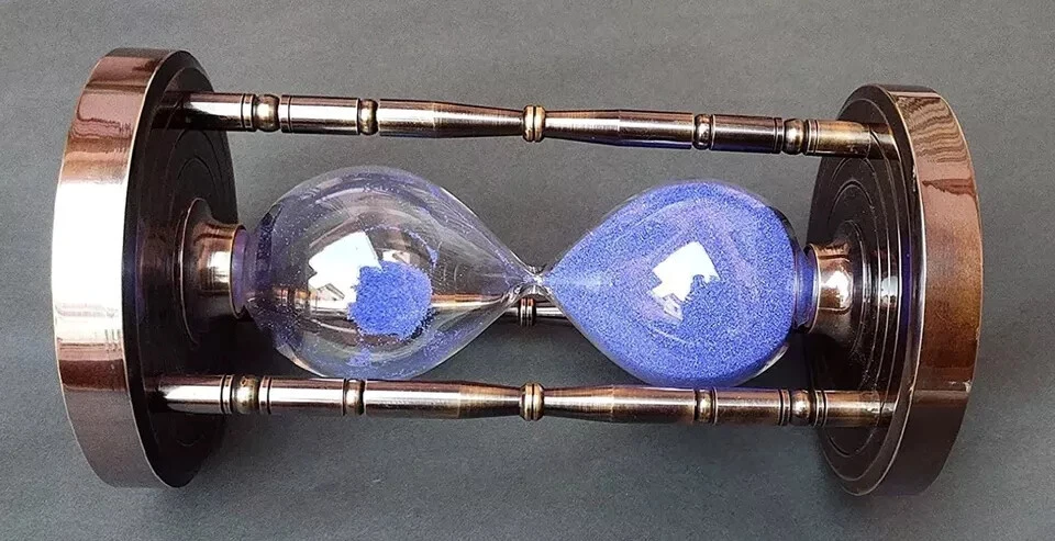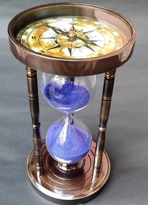 Antique Nautical Solid Brass Sand Timer Hourglass With Maritime Compass Both End For Living Room Office Desk Decorative Gifts Item. Product Description : Material : Brass, Glass & Sand Finish: Brown Antique, Purple Sand Weight : .550 kg Approx SIZE OF TIMER : 6''(Approx) Size : 3.7 x 3.7 x 6.0 inches, 9.4 x 9.4 x 15.2 cm approx Handmade Item that can be used for 5 minute activities; kids love to play with this hourglass Look Photos For Actual Image Of Product All Work is Hand Made This is a Reproduction Item, Not Sold As Antique Best For Gift Antique Maritime Brass Sand Timer Hourglass with Compass Both End Nautical Decor Gifts Item. SANDROSSO MART