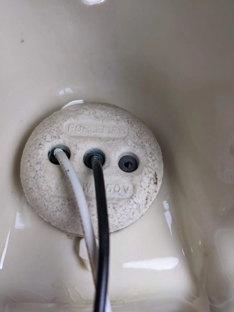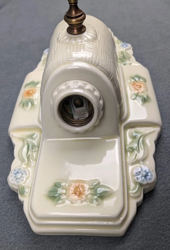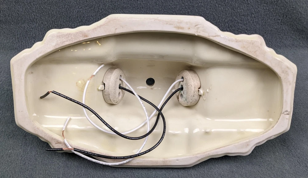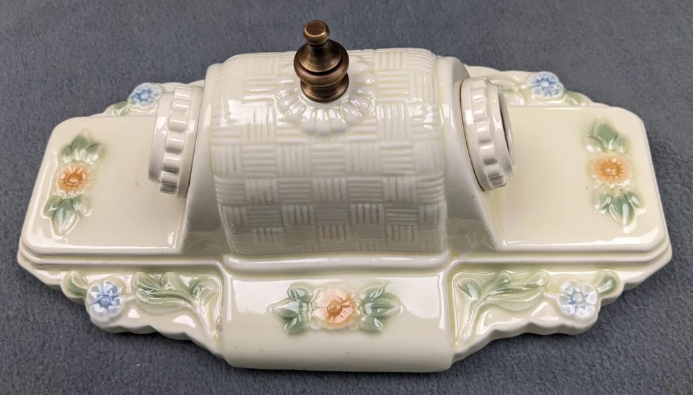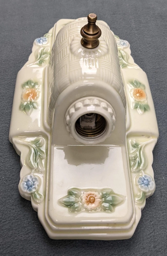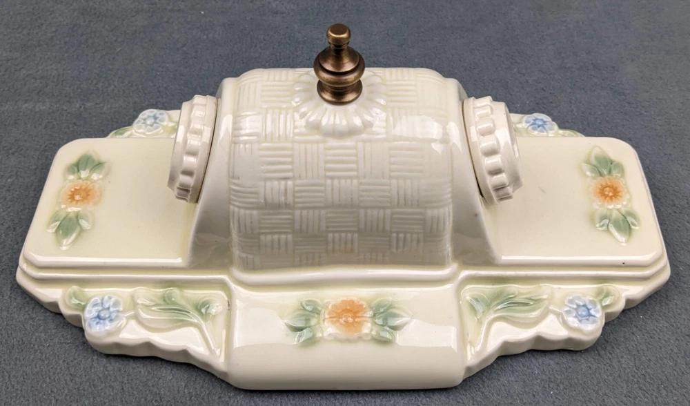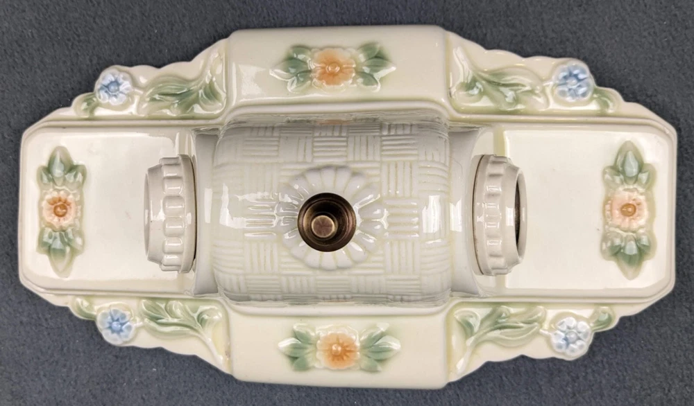 Antique Porcelain PORCELIER Basket-weave Ceiling Light: Art Deco & MCM, Restored This two-bulb, flush-mount, porcelain light fixture was manufactured by Porcelier sometime between the late 1920's and the early 1950's (the lifetime of the company), and it is appropriate for both art deco and mid-century modern design. It features a basket weave design and floral displays of orange, blue, and green on a cream colored (off white) background. The porcelain is in excellent condition. The fixture has been carefully cleaned and all of the old ceiling paint and dirt has been removed. It has been rewired, tested, and is guaranteed to perform correctly. We kept the original porcelain and brass sockets which are signed PORCELIER and which use standard base bulbs (bulbs not included). The sale includes the mounting hardware (antique brass mounting nut, threaded nipple, & crossbar). The fixture is 11-1/4" long, 6-1/4" wide, and 3-1/2" tall (not including mounting nut). All of our lights are guaranteed to be as described and we will accept their return if the buyer is dissatisfied. Just notify us within 30 days of receiving them. Shipping is buyer's choice of USPS Ground Advantage, UPS or FedEx Ground, or USPS Priority Mail. If you like this fixture but need one with a pull chain switch, we have the identical fixtures with switches in this listing . Also, we have other antique lighting for sale including more than a dozen listings with Porcelier ceiling fixtures, so please check out our lighting store !