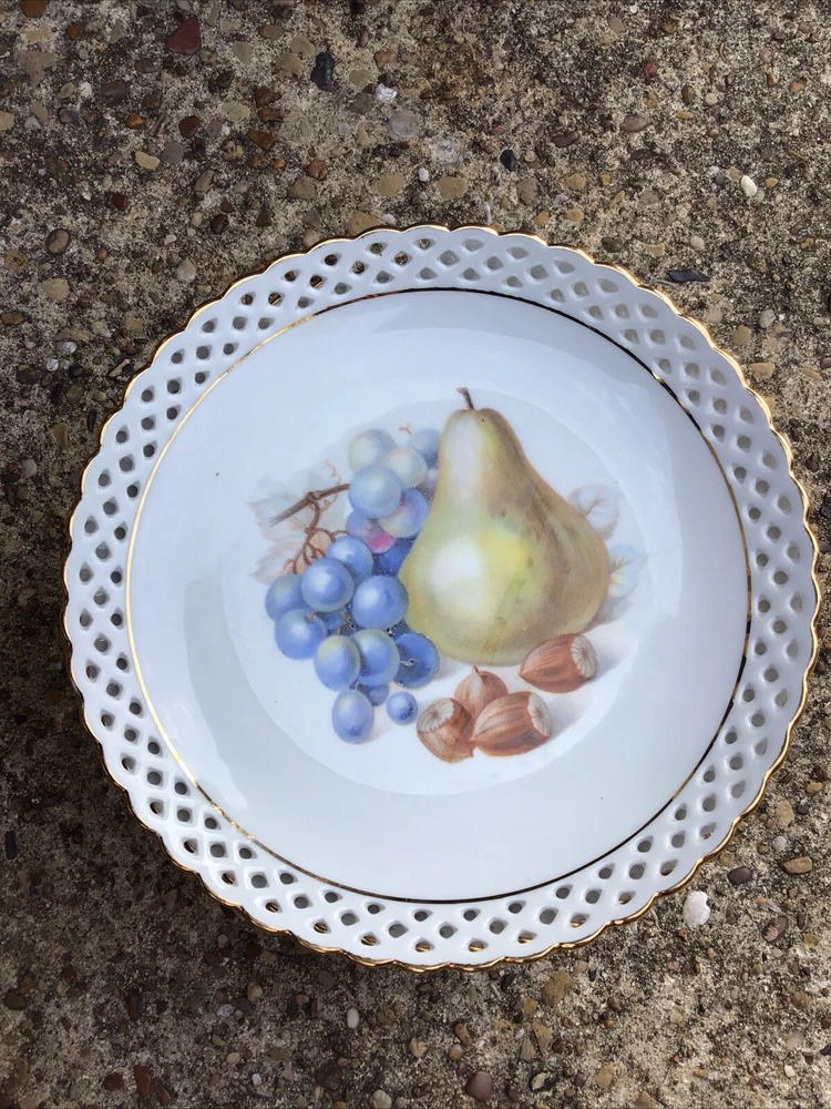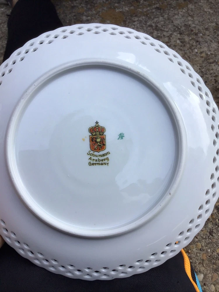 This set of 5 antique plates from Schumann Arzberg, Germany is a true vintage treasure. The round plates are made of porcelain and ceramic, and feature a beautiful multicolor pattern of fruits and flowers. The set includes bread plates, salad plates, and dinner plates, perfect for any occasion. The plates were manufactured in 1972, during the 1970s era of art glass production. They are studio crafted, with a decorative design that makes them a great addition to any collection. The production style is art glass, with a production technique of studio crafted. The plates are part of the Wild Fruits product line, and are a perfect example of German craftsmanship. 1 plated as a repaired edge