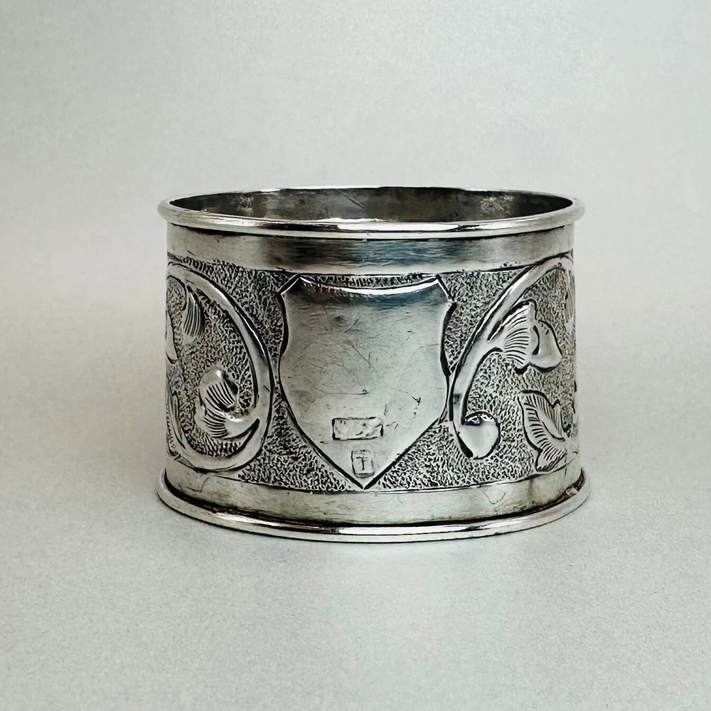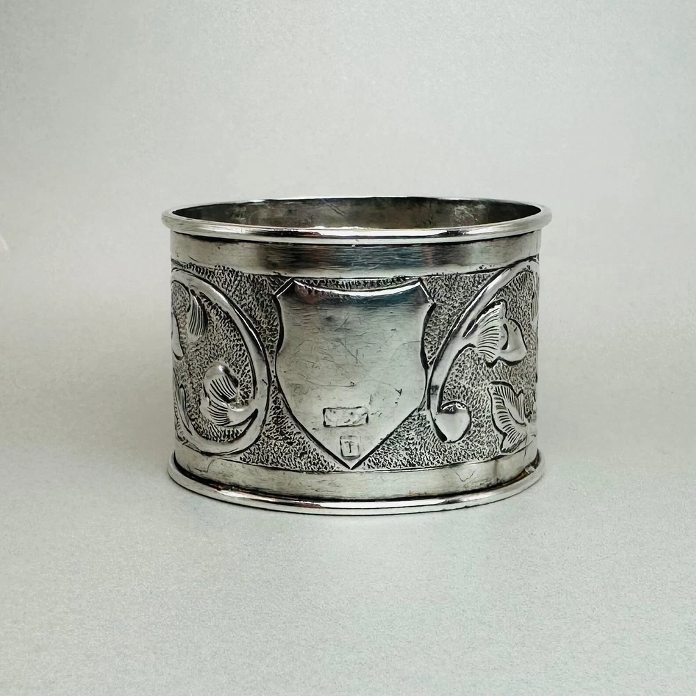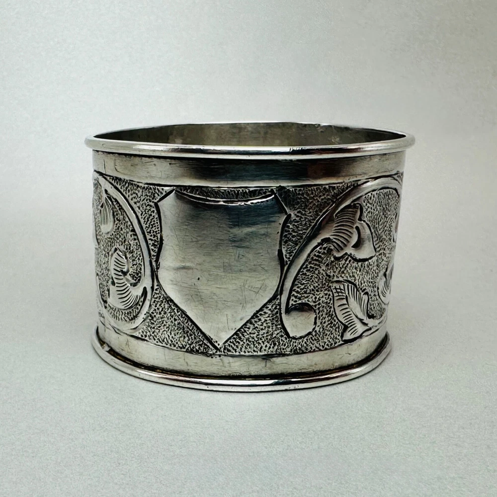 Antique Silver Napkin Ring – Floral Engraving – Approx. 17.25g – 46mm Diameter – Hallmark Rubbed Description: A beautifully designed antique silver napkin ring featuring intricate floral engravings and a central shield-shaped cartouche, ideal for personalisation or as a decorative element. The hallmark is rubbed but faintly visible, suggesting an approximate date in the late Victorian or Edwardian period. A fine example of craftsmanship, this napkin ring will add a touch of elegance to any table setting or silverware collection. Key Details: Material: Solid silver Design: Floral engravings with a central shield cartouche Weight: Approx. 17.25g Diameter: 46mm Width: 31mm Condition: The hallmark is rubbed, but the piece retains its antique charm. Minor surface wear commensurate with age. Summary: This antique silver napkin ring is a stunning decorative item or a thoughtful gift for collectors of antique silver. Its floral pattern and timeless design make it a standout piece, even with its aged hallmark. A great opportunity to own a unique piece of history. As usual, this item will be packaged carefully and dispatched with tracking. International shipping is available upon request.
