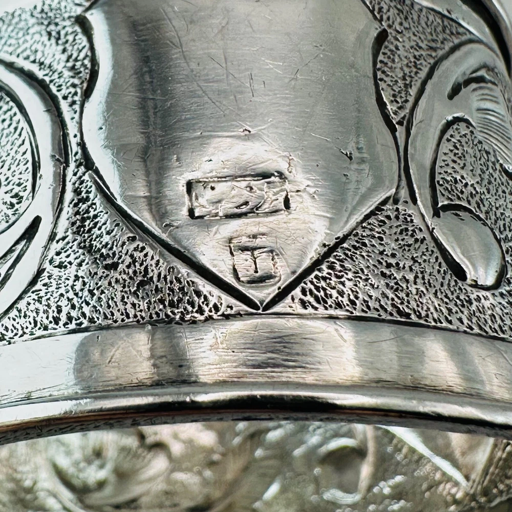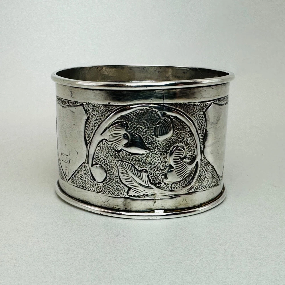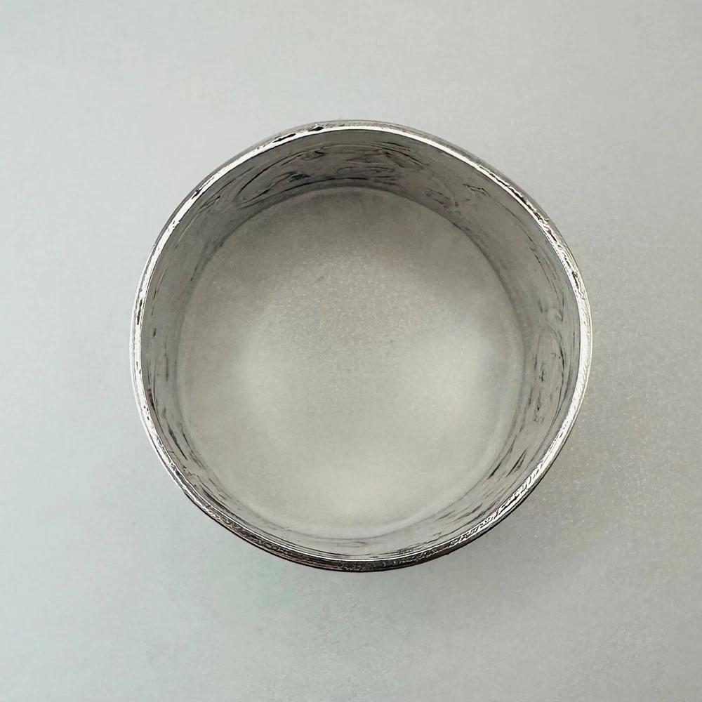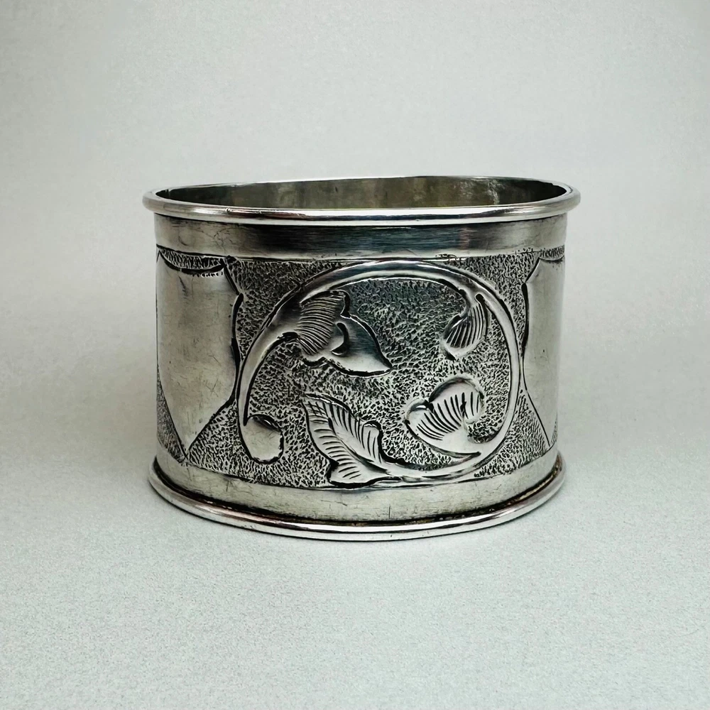 Antique Silver Napkin Ring – Floral Engraving – Approx. 17.25g – 46mm Diameter – Hallmark Rubbed Description: A beautifully designed antique silver napkin ring featuring intricate floral engravings and a central shield-shaped cartouche, ideal for personalisation or as a decorative element. The hallmark is rubbed but faintly visible, suggesting an approximate date in the late Victorian or Edwardian period. A fine example of craftsmanship, this napkin ring will add a touch of elegance to any table setting or silverware collection. Key Details: Material: Solid silver Design: Floral engravings with a central shield cartouche Weight: Approx. 17.25g Diameter: 46mm Width: 31mm Condition: The hallmark is rubbed, but the piece retains its antique charm. Minor surface wear commensurate with age. Summary: This antique silver napkin ring is a stunning decorative item or a thoughtful gift for collectors of antique silver. Its floral pattern and timeless design make it a standout piece, even with its aged hallmark. A great opportunity to own a unique piece of history. As usual, this item will be packaged carefully and dispatched with tracking. International shipping is available upon request.