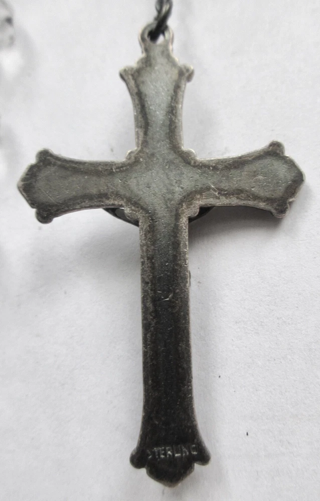 Sterling Silver CRYSTAL BEADS ROSARY Pre-1930 Unsigned Antique rosary with faceted clear transparent crystal beads. Beads vary slightly in size due to early bead manufacturing process. Some faceted edges may have nicks/bites. No major breaks or cracks. Crucifix and oval station both marked, "STERLING." Original patina left unpolished. CRUCIFIX: 1 7/8" Long x 1 1/8" Wide ROSARY LENGTH: 24" Long top to bottom (Long enough to wear around neck.) Sellers items are all in as-found, used vintage/antique conditions. Please contact seller w/any questions/concerns BEFORE bidding.
