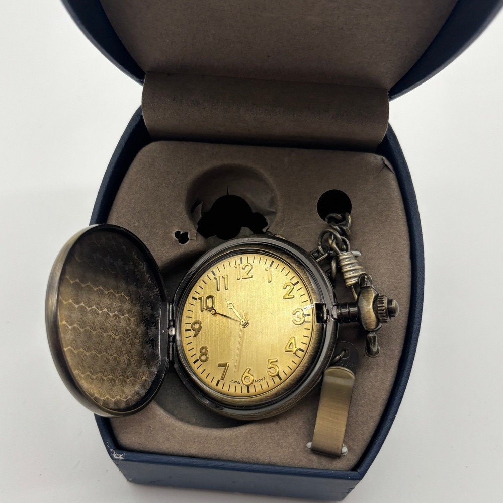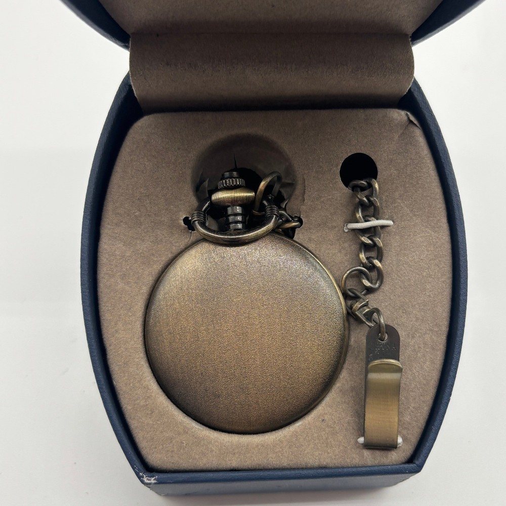 Antique style Grandpa pocket watch presented in a blue hinged display box. The watch face is gold-toned with black Arabic numerals and hands. The front cover of the pocket watch features a circular red wood inlay with the word 'Grandpa' engraved in a silver-toned font. A metal chain with a clip attachment is included. The back of the watch and the inside of the cover have an embossed honeycomb pattern. This pocket watch is a thoughtful gift for a grandfather. Department: Unisex Adults Movement: Quartz Case Material: Brass Case Color: Brown, Silver Dial Color: Yellow Gold Features: 12-Hour Dial, Includes Chain, Seconds Hand, Luminous Hands Style: Steampunk Type: Pocket Watch Display: Analog Indices: Arabic Numerals Water Resistance: Not Water Resistant Closure: Full Hunter Keywords: pocket watch, grandfather gift, engraved watch, vintage style, collectible, keepsake, anniversary gift, birthday gift, timepiece, chain watch, gift boxed, decorative, heirloom **Sold by a Proud Military Family** ~10% of every item I sell is donated to our charity - Veterans Community Project. Please visit my store for all the items I have listed to help this great cause. If you loved this item, please visit my store for more items like it! Please remember to share the love with a positive feedback! • I ship within 2 business days • All items come from a pet-friendly, smoke-free home