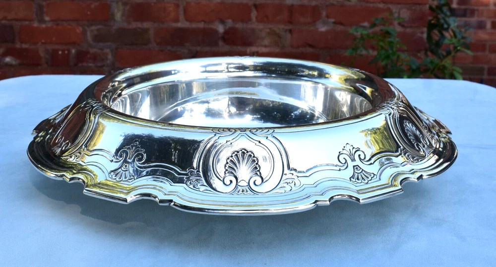 Stunning example and usability Tiffany and Co. John Moore era 14 1/2" x 3" tall sterling silver Chippendale shell overlap pattern centerpiece bowl! No monogram, 1398 grams, 2 tiny shallow wave dents to center. Last pic shows best picture I could capture. Only polished with Wright's Silver Cream, beautiful patina. Thanks for considering my Auctions today, I'll strive to exceed expectations on your Purchases. Please check my feedback of over 10280 positives, selling for over 27 years on ebay, before that the rest of my life :^). Hope you will check and bookmark my Auctions for new items listed daily!