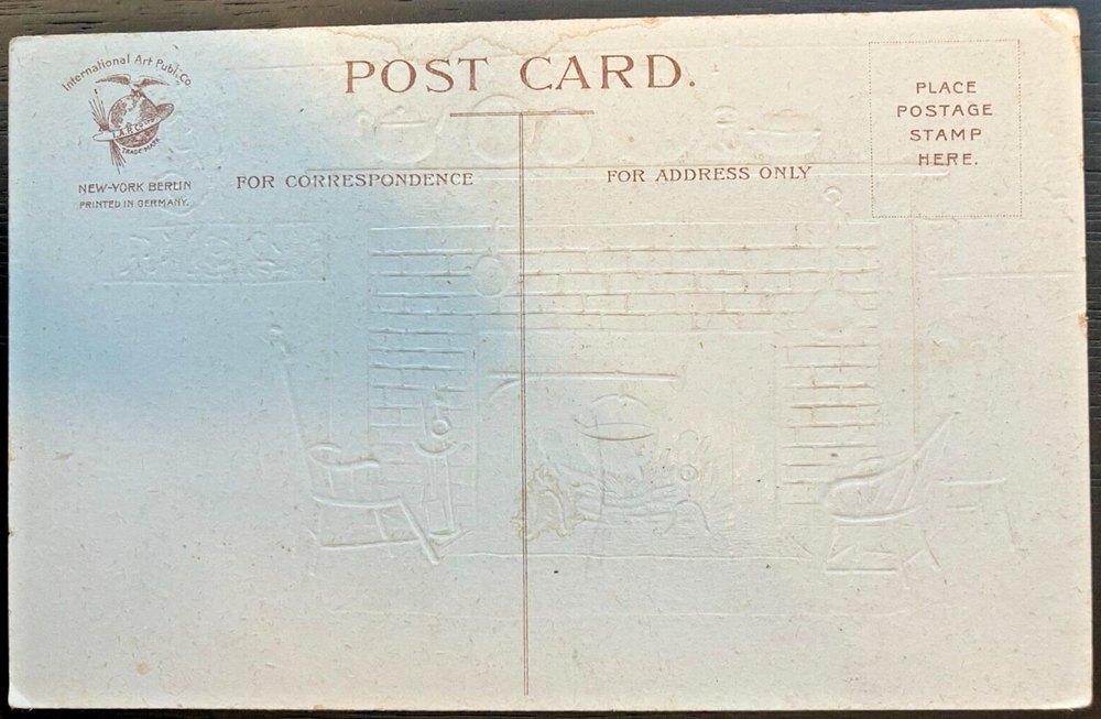 Antique postcard: Good Wishes for Thanksgiving Day, with a welcoming hearth with a fire & chairs and a mantle a blue/white platters. Unposted