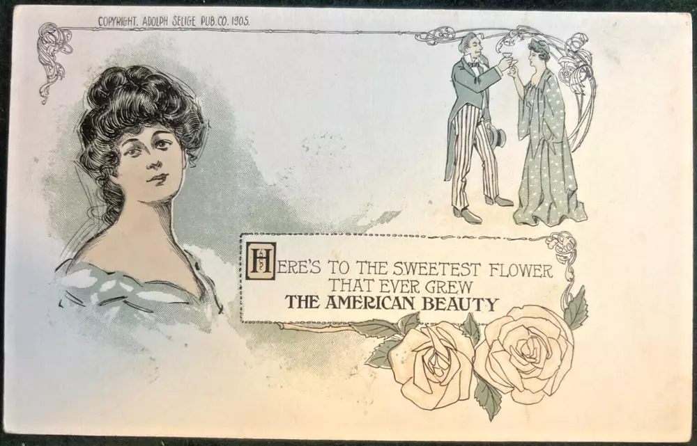 Antique Valentine: 1 of 7 from Adolph Selige. Elegant art nouveau. Chorus line of praise for elegant woman as cupid watches. "Here's to the prettiest / Here's to the wittiest / Here's to the truest of those, who are true / Here's to the neatest one / Here's to the sweetest one / Here's to them all in one, here's to you. " Card is unposted. Lower L corner is bent + smudge on R side. Very good condition.