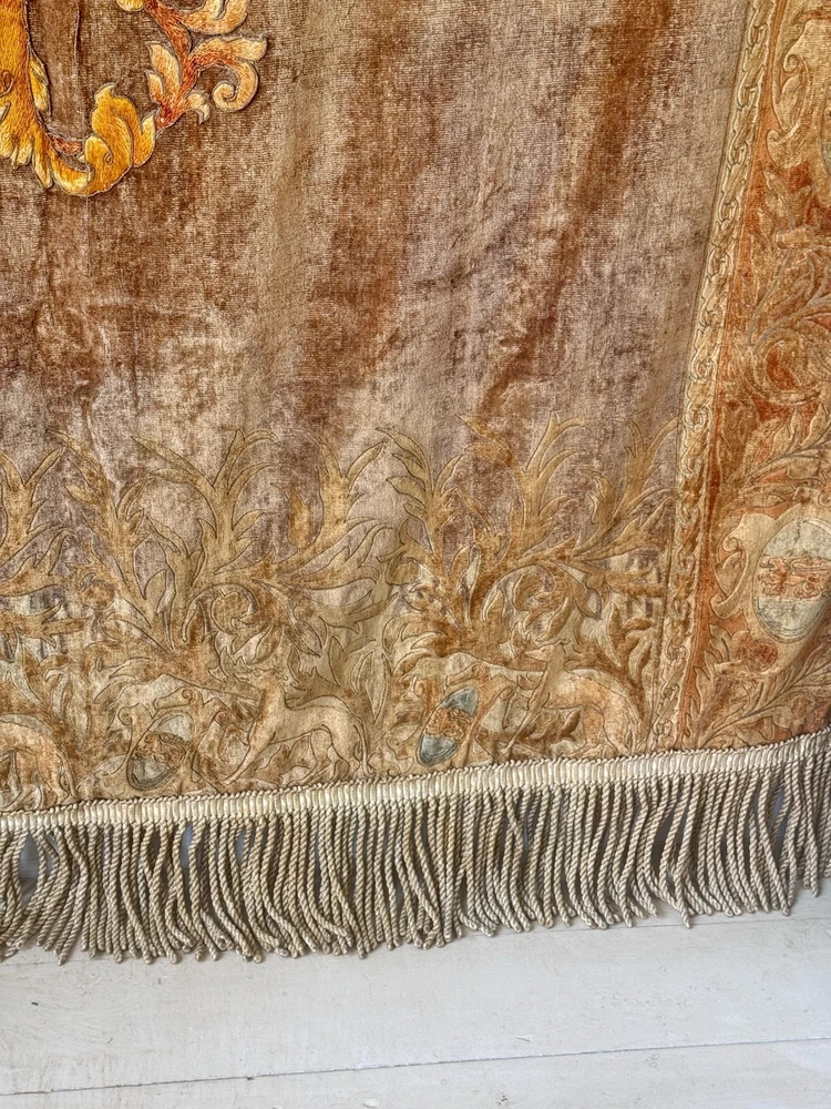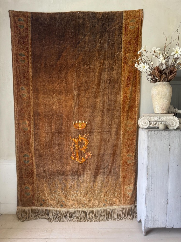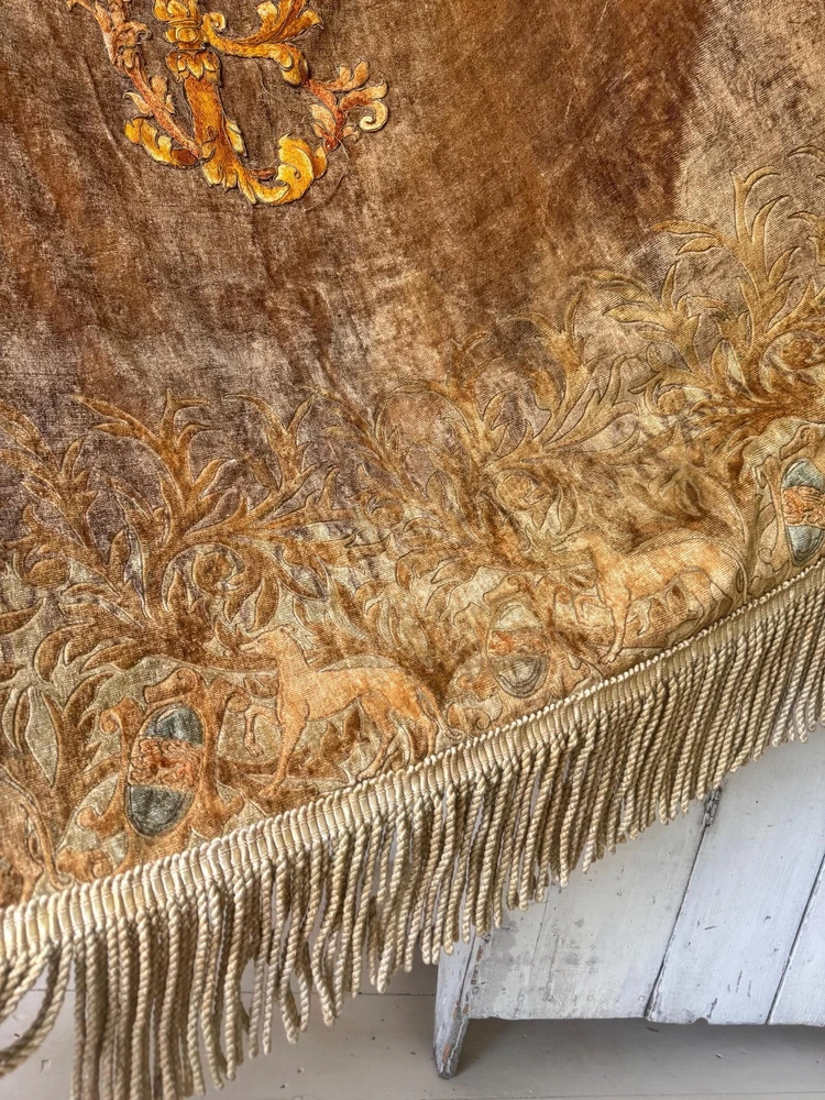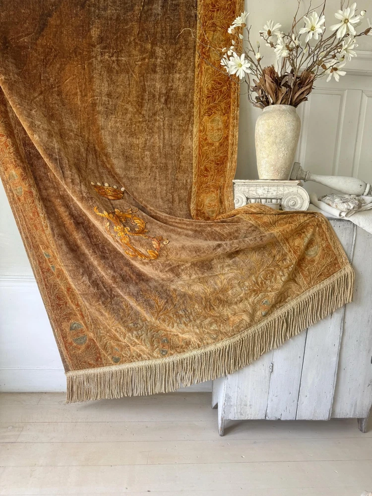 Welcome to The Textile Trunk ~ Thank you for over 25 wonderful years of helping bring these beautiful antique textiles and decorative items to life again! This is one of the most spectacular curtains I’ve ever come across ( I have 2 matching, to view the other simply search my store for the word heraldic and it will appear! ) A once in a lifetime find. Found in America, but almost certainly European in origin. Dating to the late 1800s Arts and Crafts period, this large, regal panel is made from a lush golden amber silk velour velvet and the embroidery is entirely hand worked. The center bears an appliquéd and embroidered crowned monogram in richly shaded golden silks, surrounded by a lower field of stylized acanthus and scrolling foliage with heraldic crests—alongside prancing animals and floral forms. The border is equally ornate, with beautiful emblems repeating vertically up both sides! This find is nothing short of astonishing ~ The entire panel is dripping in historical atmosphere ( and importance) and ornate handwork, right down to the original twisted gold fringe, which measures approximately 7 inches long. This piece was most certainly custom-made for an estate, private noble residence, or possibly a grand American Arts and Crafts interior reflecting European aristocratic taste. Approximately 12 pounds of amazing beauty!~ This incredible textile would be stunning as a dramatic wall hanging, headboard panel, or a statement piece above a doorway or mantel! MEASUREMENTS: Approximately 102 inches long by 70 inches wide. The lower fringe measures an additional 7 inches. CONDITION: This textile work of art is in excellent condition for its age. Some areas of the metallic embroidery have unraveled slightly, and there is gentle fading across the surface, especially toward the center panel. The backing has some minor marks from time and storage. These signs of time and use are part of its journey, adding to its authenticity as an antique textile. Please use the zoom feature on the photographs to examine the exact condition. The condition of this lovely textile is reflected in the price. These condition “flaws” are an essential part of each antique textile—they tell the story of a life well-lived, cherished by many before us, and add to its unique charm and authenticity. Antique textiles carry stories. If you look closely, there are many clues of the lives that came before us, making them wonderful heirloom treasures to be cherished and passed down for generations. Not only do I feel so fortunate to share these antique works of art for use in our homes today, but this also supports eco-friendly practices by giving old materials a new life through upcycling and creative reuse. Inventory: J 200