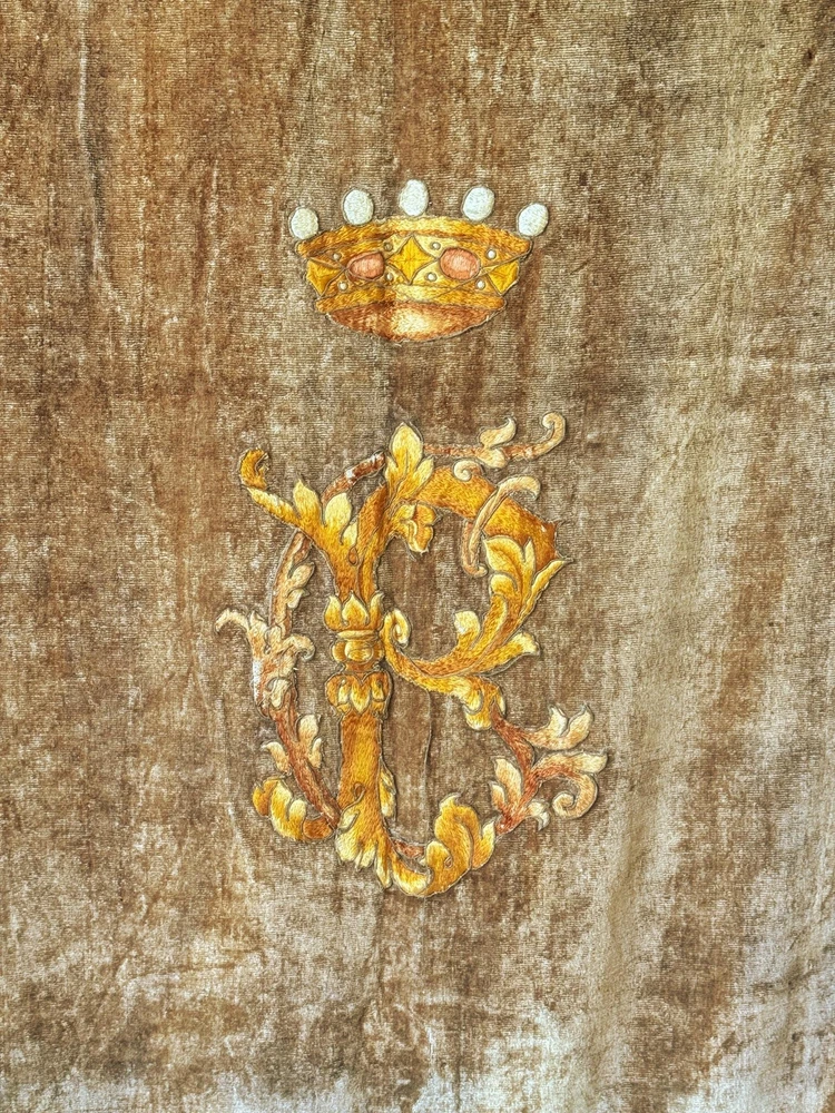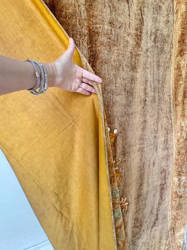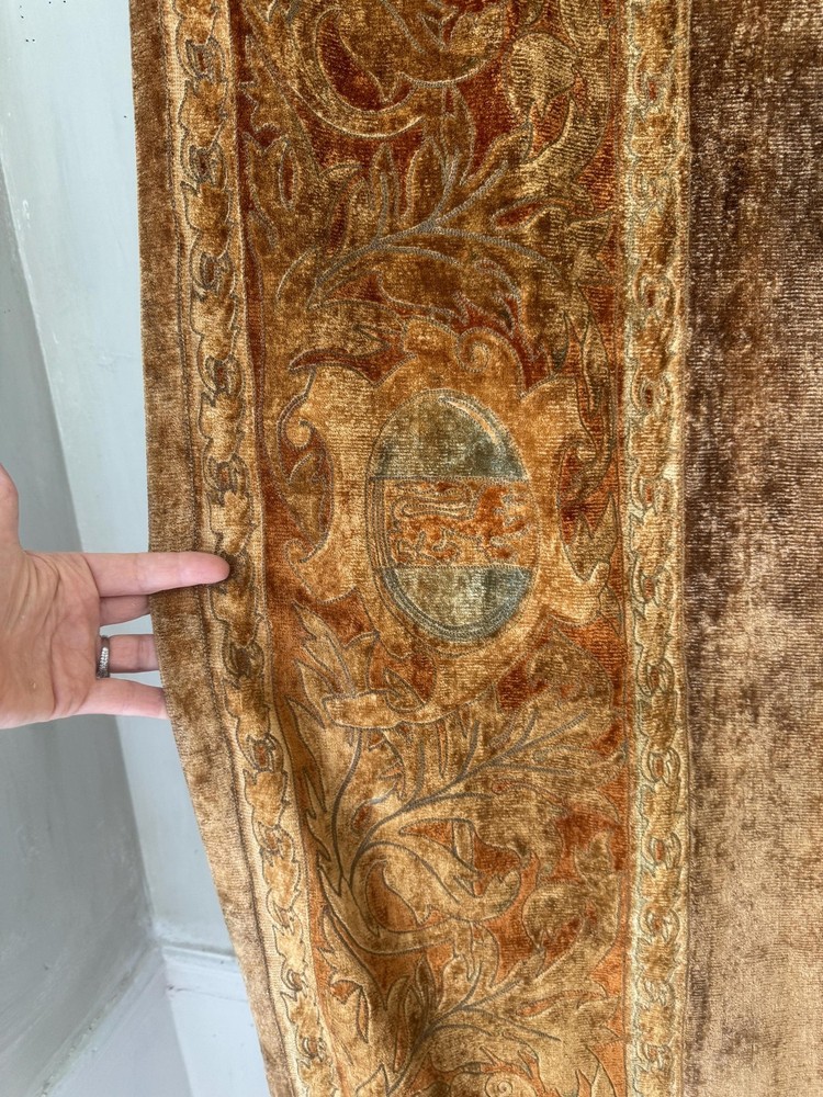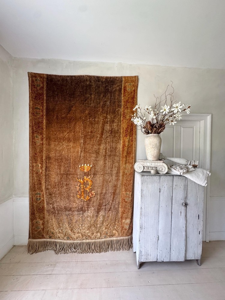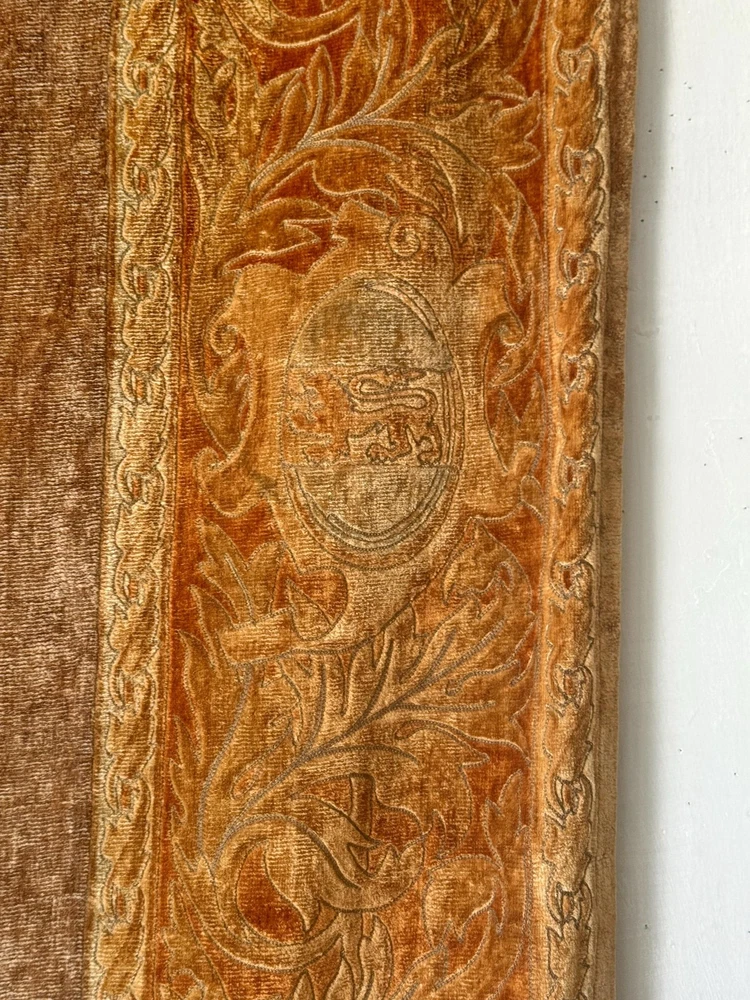 Welcome to The Textile Trunk ~ Thank you for over 25 wonderful years of helping bring these beautiful antique textiles and decorative items to life again! This is one of the most spectacular curtains I’ve ever come across ( I have 2 matching, to view the other simply search my store for the word heraldic and it will appear! ) A once in a lifetime find. Found in America, but almost certainly European in origin. Dating to the late 1800s Arts and Crafts period, this large, regal panel is made from a lush golden amber silk velour velvet and the embroidery is entirely hand worked. The center bears an appliquéd and embroidered crowned monogram in richly shaded golden silks, surrounded by a lower field of stylized acanthus and scrolling foliage with heraldic crests—alongside prancing animals and floral forms. The border is equally ornate, with beautiful emblems repeating vertically up both sides! This find is nothing short of astonishing ~ The entire panel is dripping in historical atmosphere ( and importance) and ornate handwork, right down to the original twisted gold fringe, which measures approximately 7 inches long. This piece was most certainly custom-made for an estate, private noble residence, or possibly a grand American Arts and Crafts interior reflecting European aristocratic taste. Approximately 12 pounds of amazing beauty!~ This incredible textile would be stunning as a dramatic wall hanging, headboard panel, or a statement piece above a doorway or mantel! MEASUREMENTS: Approximately 102 inches long by 70 inches wide. The lower fringe measures an additional 7 inches. CONDITION: This textile work of art is in excellent condition for its age. Some areas of the metallic embroidery have unraveled slightly, and there is gentle fading across the surface, especially toward the center panel. The backing has some minor marks from time and storage. These signs of time and use are part of its journey, adding to its authenticity as an antique textile. Please use the zoom feature on the photographs to examine the exact condition. The condition of this lovely textile is reflected in the price. These condition “flaws” are an essential part of each antique textile—they tell the story of a life well-lived, cherished by many before us, and add to its unique charm and authenticity. Antique textiles carry stories. If you look closely, there are many clues of the lives that came before us, making them wonderful heirloom treasures to be cherished and passed down for generations. Not only do I feel so fortunate to share these antique works of art for use in our homes today, but this also supports eco-friendly practices by giving old materials a new life through upcycling and creative reuse. Inventory: J 200