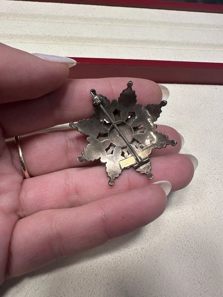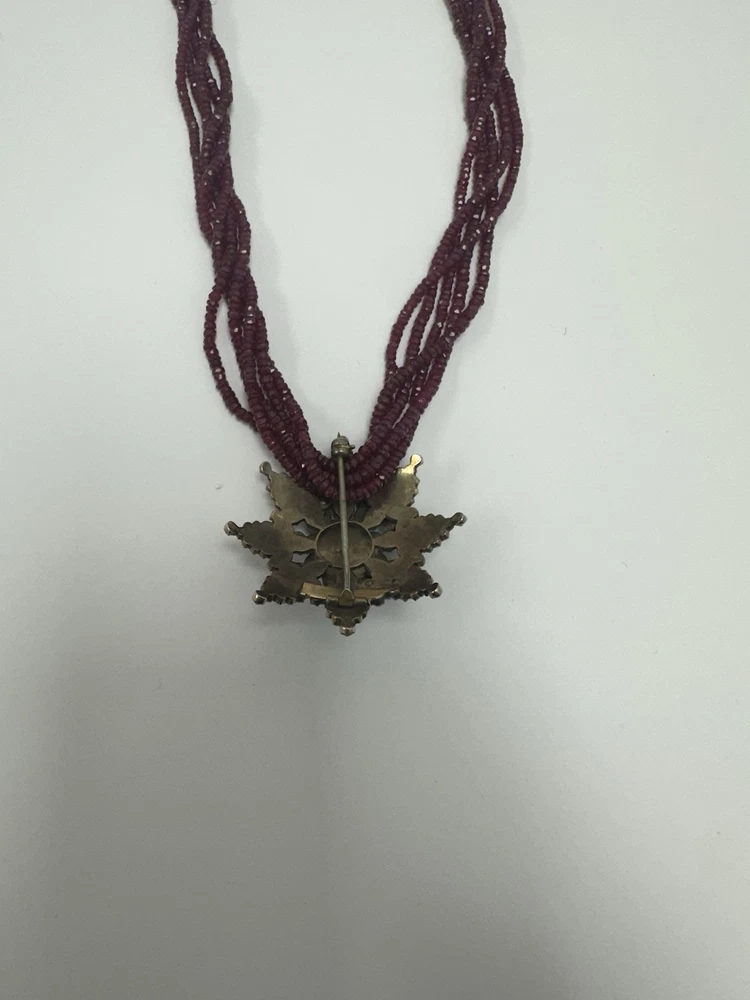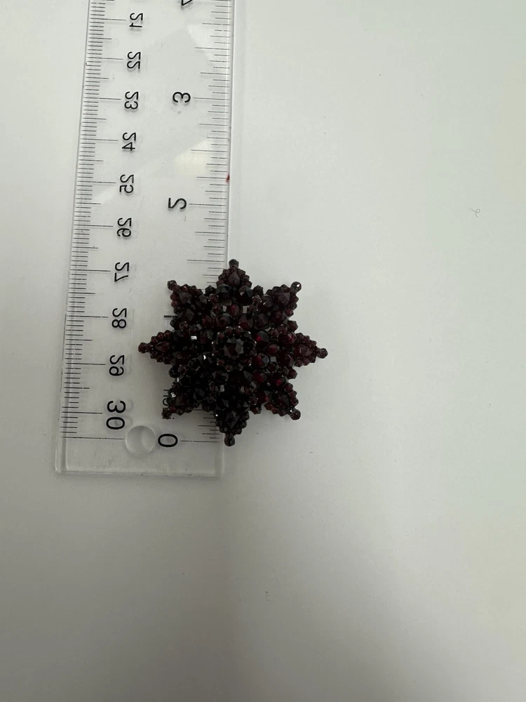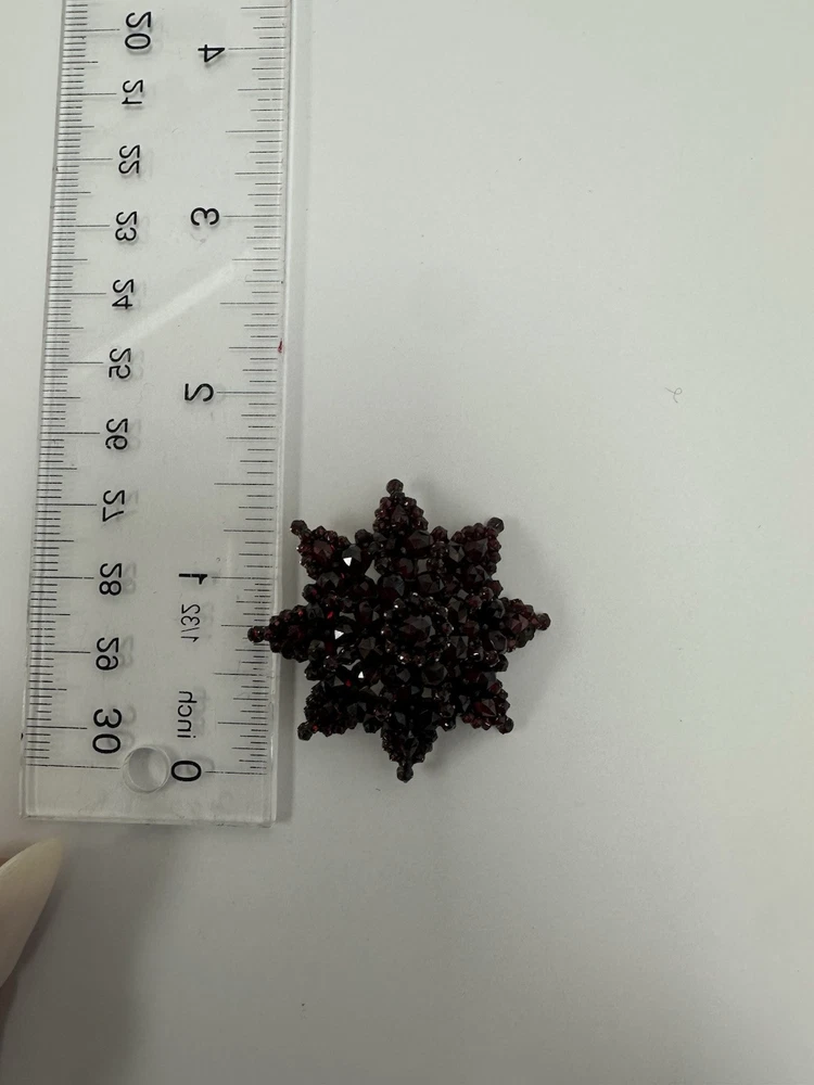 Dazzling antique bohemian garnet broach. I added some pictures with it being used as a pendant on my natural ruby and 18k gold strand (sold separately). There is some wear, but considering the incredibly vintage date of creation this piece has stood up to the test of time. I had to use a jeweler’s loop, but there are two garnets that are worn down and a small stone is missing. My experienced naked eye couldn’t tell. It’s an exciting piece of history! Also, bohemian garnet jewelry is not sterling. While it does contain silver and other metals in the mix, don’t be fooled by sellers claiming sterling especially with no stamp. This is a traditional piece true to its contextual events in history.